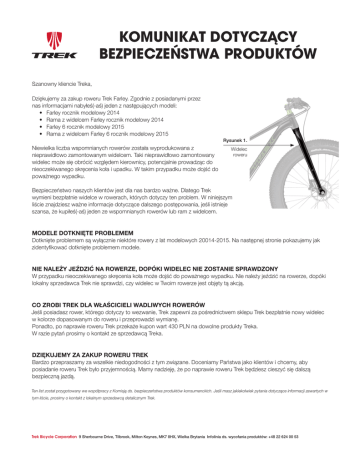 KOMUNIKAT DOTYCZĄCY BEZPIECZEŃSTWA PRODUKTÓW Szanowny kliencie Treka, Dziękujemy za zakup roweru Trek Farley. Zgodnie z posiadanymi przez nas informacjami nabyłeś(-aś) jeden z następujących modeli: • Farley rocznik modelowy 2014 • Rama z widelcem Farley rocznik modelowy 2014 • Farley 6 rocznik modelowy 2015 • Rama z widelcem Farley 6 rocznik modelowy 2015 Rysunek 1. Niewielka liczba wspomnianych rowerów została wyprodukowana z nieprawidłowo zamontowanym widelcem. Taki nieprawidłowo zamontowany widelec może się obrócić względem kierownicy, potencjalnie prowadząc do nieoczekiwanego skręcenia koła i upadku. W takim przypadku może dojść do poważnego wypadku. Widelec roweru Bezpieczeństwo naszych klientów jest dla nas bardzo ważne. Dlatego Trek wymieni bezpłatnie widelce w rowerach, których dotyczy ten problem. W niniejszym liście znajdziesz ważne informacje dotyczące dalszego postępowania, jeśli istnieje szansa, że kupiłeś(-aś) jeden ze wspomnianych rowerów lub ram z widelcem. MODELE DOTKNIĘTE PROBLEMEM Dotknięte problemem są wyłącznie niektóre rowery z lat modelowych 20014-2015. Na następnej stronie pokazujemy jak zidentyfikować dotknięte problemem modele. NIE NALEŻY JEŹDZIĆ NA ROWERZE, DOPÓKI WIDELEC NIE ZOSTANIE SPRAWDZONY W przypadku nieoczekiwanego skręcenia koła może dojść do poważnego wypadku. Nie należy jeździć na rowerze, dopóki lokalny sprzedawca Trek nie sprawdzi, czy widelec w Twoim rowerze jest objęty tą akcją. CO ZROBI TREK DLA WŁAŚCICIELI WADLIWYCH ROWERÓW Jeśli posiadasz rower, którego dotyczy to wezwanie, Trek zapewni za pośrednictwem sklepu Trek bezpłatnie nowy widelec w kolorze dopasowanym do roweru i przeprowadzi wymianę. Ponadto, po naprawie roweru Trek przekaże kupon wart 430 PLN na dowolne produkty Treka. W razie pytań prosimy o kontakt ze sprzedawcą Treka. DZIĘKUJEMY ZA ZAKUP ROWERU TREK Bardzo przepraszamy za wszelkie niedogodności z tym związane. Doceniamy Państwa jako klientów i chcemy, aby posiadanie roweru Trek było przyjemnością. Mamy nadzieję, że po naprawie roweru Trek będziesz cieszyć się dalszą bezpieczną jazdą. Ten list został przygotowany we współpracy z Komisją ds. bezpieczeństwa produktów konsumenckich. Jeśli masz jakiekolwiek pytania dotyczące informacji zawartych w tym liście, prosimy o kontakt z lokalnym sprzedawcą detalicznym Trek. Trek Bicycle Corporation 9 Sherbourne Drive, Tilbrook, Milton Keynes, MK7 8HX, Wielka Brytania Infolinia ds. wycofania produktów: +48 22 624 00 53 LISTA WADLIWYCH MODELI • • • • Farley rocznik modelowy 2014 Rama z widelcem Farley rocznik modelowy 2014 Farley 6 rocznik modelowy 2015 Rama z widelcem Farley 6 rocznik modelowy 2015 FARLEY I RAMA Z WIDELCEM 2014 “FARLEY” nadrukowane na górnej rurze ramy FARLEY 6 I RAMA Z WIDELCEM 2015