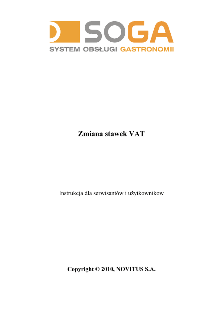 Zmiana stawek VAT Instrukcja dla serwisantów i użytkowników Copyright © 2010, NOVITUS S.A. NOVITUS S.A __________________________________________________________ SOGA – Zmiana stawek VAT Uwaga ! Zmiany stawek podatku VAT dokonujemy zarówno w programie jak i w urządzeniach fiskalnych, które z nim współpracują !!! Nie ma znaczenia, którą z tych zmian wykonamy jako pierwszą. Użytkownicy programu SOGA mogą dokonać zmiany wartości stawek VAT na trzy sposoby, które zostały opisane poniżej. Uwaga ! Wszystkie nierozliczone (niezamknięte) rachunki zostaną przeliczone wg nowych stawek VAT w momencie ich zmiany ! Wszystkie nierozliczone imprezy zostaną przeliczone wg nowych stawek VAT w momencie ich zmiany ! Uwaga ! Po wykonaniu grupowej zmiany stawek VAT w całym asortymencie, może zajść konieczność pojedynczych zmian w niektórych artykułach, usługach lub towarach, związanych ze zmianą klasyfikacji danego asortymentu, wynikającą ze zmiany ustawy. Przykładowo towar, który dotychczas był przyporządkowany do stawki 7%, po grupowej zmianie stawek będzie przyporządkowany automatycznie do stawki 8%, i jeżeli wg nowej klasyfikacji (obowiązującej od nowego roku) obejmuje go już stawka obniżona 5%, to powinniśmy „ręcznie” dokonać takiej zmiany. Tabela zmian stawek VAT: Oznaczenie literowe Dotychczasowa wartość stawki Nowa wartość stawki A B C D R X Z 22 7 0 3 6 0 (ex.) zw. 23 8 bez zmian 5 6,5 bez zmian bez zmian Tabela. 1 Uwaga ! W urządzeniach fiskalnych bezpośrednio współpracujących z programem (drukarki fiskalne) należy zmienić stawki VAT zgodnie ze zmianami dokonanymi w programie ! -2- NOVITUS S.A __________________________________________________________ SOGA – Zmiana stawek VAT I sposób (dla użytkowników wersji bez magazynu) To stosunkowo najprostszy sposób. Aby z niego skorzystać, należy wykonać następujące czynności w podanej kolejności: 1) rozliczyć (zamknąć) wszystkie otwarte rachunki, 2) zamknąć zmianę, 3) uruchomić program Konfigurator, 4) wybrać Administrator -> Stawki VAT -> Tabela (rys.1.). To spowoduje wyświetlenie okna jak na rys.2. Następnie podświetlamy stawkę, którą chcemy zmienić i wybieramy funkcję Popraw. W tym momencie zostaje wyświetlone okienko jak na rys.3. Zmieniamy wartość stawki oraz poprawiamy jej opis (na zgodny z wartością) i zapisujemy. Tą czynność powtarzamy dla wszystkich stawek, których wartość chcemy zmienić. Zaleca się, aby zmian dokonać zgodnie z wartościami podanymi w tabeli 1 (powyżej). 5) Zmiana stawek VAT w tabeli stawek nie powoduje automatycznej zmiany stawki w poszczególnych artykułach i usługach ! Aby dokonać takiej zmiany, należy wybrać funkcję Grupowej zmiany stawek VAT (rys.4). W oknie tym zaznaczamy aktualizację stawek dla ARTYKUŁÓW (opcja 1) oraz dla USŁUG (opcja 2). Sugerowany przez nas sposób przeliczenia cen jest wybrany jako domyślny ! Kliknięcie Wykonaj spowoduje przyporządkowanie nowych stawek do asortymentu, co zostanie potwierdzone odpowiednim komunikatem. -3- NOVITUS S.A __________________________________________________________ SOGA – Zmiana stawek VAT II sposób (dla użytkowników wersji z magazynem) Ten sposób polega na jednoczesnej zmianie stawek VAT w artykułach, usługach oraz towarach. Taka zmiana jednak wiąże się z koniecznością wykonania inwentaryzacji oraz wydrukowania remanentu jeszcze przed jej wykonaniem ! W celu skorzystania z tego sposobu należy wykonać następujące czynności w podanej kolejności: 1) rozliczyć (zamknąć) wszystkie otwarte rachunki, 2) zamknąć zmianę, 3) wprowadzić wszystkie zaległe dokumenty zakupu, 4) rozliczyć i wykonać rozchody zaległych imprez (w programie magazynowym), 5) wykonać zaległe rozchody zmian, 6) wykonać kontrolę danych w programie magazynowym (Administrator -> Kontrola danych) 7) przygotować oraz wykonać inwentaryzację 8) wykonać wydruk remanentu oraz innych potrzebnych raportów, 9) uruchomić program Konfigurator, 10) wybrać Administrator -> Stawki VAT -> Tabela (rys.1.). To spowoduje wyświetlenie okna jak na rys.2. Następnie podświetlamy stawkę, którą chcemy zmienić i wybieramy funkcję Popraw. W tym momencie zostaje wyświetlone okienko jak na rys.3. Zmieniamy wartość stawki oraz poprawiamy jej opis (na zgodny z wartością) i zapisujemy. Tą czynność powtarzamy dla wszystkich stawek, których wartość chcemy zmienić. Zaleca się, aby zmian dokonać zgodnie z wartościami podanymi w tabeli 1 (powyżej). 11) Zmiana stawek VAT w tabeli stawek nie powoduje automatycznej zmiany stawki w poszczególnych artykułach, usługach czy towarach (surowcach) ! Aby dokonać takiej zmiany, należy wybrać funkcję Grupowej zmiany stawek VAT (rys.4). W oknie tym zaznaczamy aktualizację stawek dla ARTYKUŁÓW (opcja 1), dla USŁUG (opcja 2), oraz dla TOWARÓW (opcja 3). Sugerowany przez nas sposób przeliczenia cen jest wybrany jako domyślny ! Kliknięcie Wykonaj spowoduje przyporządkowanie nowych stawek do asortymentu, co zostanie potwierdzone odpowiednim komunikatem. -4- NOVITUS S.A __________________________________________________________ SOGA – Zmiana stawek VAT III sposób (dla użytkowników wersji z magazynem) Ostatnim sposobem jest zmiana stawek tylko dla artykułów i usług, jednocześnie pozostawiając stawki dla towarów na dotychczasowym poziomie. Takie działanie pozwoli na normalne prowadzenie sprzedaży opodatkowanej nowymi stawkami oraz wystawianie faktur sprzedaży w nowych stawkach, ale pozostawi możliwość spokojnego zakończenia roku poprzez wykonanie wszystkich koniecznych operacji w magazynie (wprowadzenie zaległych dokumentów zakupu, inwentaryzacja, wydruk remanentu) korzystając jeszcze ze starych wartości stawek VAT. Po wykonaniu czynności zamykających rok, wykonujemy zmianę stawek już tylko w samych towarach. Poniżej zostały wymienione poszczególne czynności, które należy wykonać w podanej ko