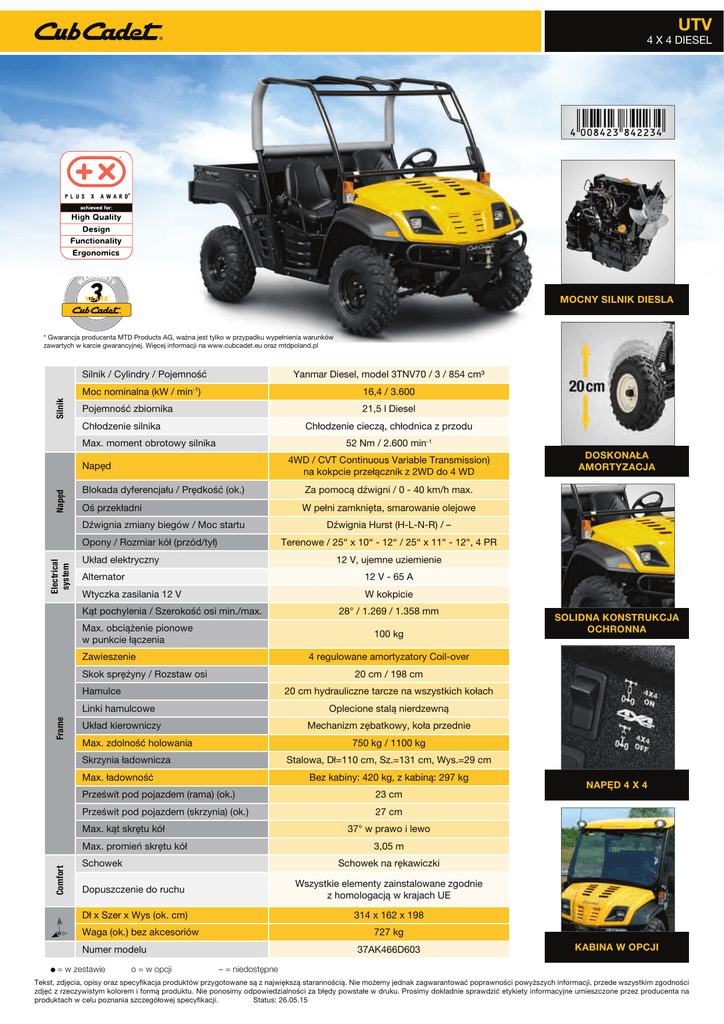 UTV h *Manufacturin g gu ara nty of MT D c du * re det.eu c.cubca ://b2 ttps nh no tio ra st gi Pr o 4 X 4 DIESEL MOCNY SILNIK DIESLA * Gwarancja producenta MTD Products AG, ważna jest tylko w przypadku wypełnienia warunków zawartych w karcie gwarancyjnej. Więcej informacji na www.cubcadet.eu oraz mtdpoland.pl Silnik / Cylindry / Pojemność Yanmar Diesel, model 3TNV70 / 3 / 854 cm³ Silnik -1 Moc nominalna (kW / min ) 16,4 / 3.600 Pojemność zbiornika 21,5 l Diesel Chłodzenie silnika Chłodzenie cieczą, chłodnica z przodu 52 Nm / 2.600 min-1 Max. moment obrotowy silnika 4WD / CVT Continuous Variable Transmission) na kokpcie przełącznik z 2WD do 4 WD Napęd Napęd Blokada dyferencjału / Prędkość (ok.) Za pomocą dźwigni / 0 - 40 km/h max. Oś przekładni W pełni zamknięta, smarowanie olejowe Dźwignia zmiany biegów / Moc startu Electrical system Opony / Rozmiar kół (przód/tył) 12 V, ujemne uziemienie Alternator 12 V - 65 A Wtyczka zasilania 12 V W kokpicie Kąt pochylenia / Szerokość osi min./max. Max. obciążenie pionowe w punkcie łączenia SOLIDNA KONSTRUKCJA OCHRONNA 4 regulowane amortyzatory Coil-over Skok sprężyny / Rozstaw osi 20 cm / 198 cm Hamulce 20 cm hydrauliczne tarcze na wszystkich kołach Linki hamulcowe Frame 28° / 1.269 / 1.358 mm 100 kg Zawieszenie Oplecione stalą nierdzewną Układ kierowniczy Mechanizm zębatkowy, koła przednie Max. zdolność holowania 750 kg / 1100 kg Skrzynia ładownicza Stalowa, Dł=110 cm, Sz.=131 cm, Wys.=29 cm Max. ładowność Bez kabiny: 420 kg, z kabiną: 297 kg Prześwit pod pojazdem (rama) (ok.) 23 cm Prześwit pod pojazdem (skrzynia) (ok.) 27 cm Max. kąt skrętu kół NAPĘD 4 X 4 37° w prawo i lewo Max. promień skrętu kół Comfort Dźwignia Hurst (H-L-N-R) / – Terenowe / 25“ x 10“ - 12“ / 25“ x 11“ - 12“, 4 PR Układ elektryczny 3,05 m Schowek Schowek na rękawiczki Dopuszczenie do ruchu Wszystkie elementy zainstalowane zgodnie z homologacją w krajach UE Dł x Szer x Wys (ok. cm) 314 x 162 x 198 Waga (ok.) bez akcesoriów 727 kg Numer modelu = w zestawie DOSKONAŁA AMORTYZACJA o = w opcji 37AK466D603 KABINA W OPCJI – = niedostępne Tekst, zdjęcia, opisy oraz specyfikacja produktów przygotowane są z największą starannością. Nie możemy jednak zagwarantować poprawności powyższych informacji, przede wszystkim zgodności zdjęć z rzeczywistym kolorem i formą produktu. Nie ponosimy odpowiedzialności za błędy powstałe w druku. Prosimy dokładnie sprawdzić etykiety informacyjne umieszczone przez producenta na produktach w celu poznania szczegółowej specyfikacji. Status: 26.05.15