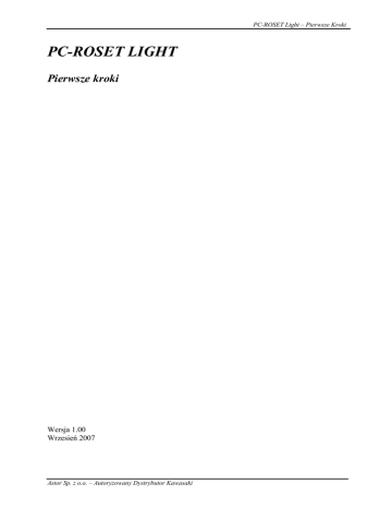 PC-ROSET Light – Pierwsze Kroki PC-ROSET LIGHT Pierwsze kroki Wersja 1.00 Wrzesień 2007 Astor Sp. z o.o. – Autoryzowany Dystrybutor Kawasaki PC-ROSET Light – Pierwsze Kroki Zrzeczenie się gwarancji i odpowiedzialności Dołożono wszelkich starań aby informacji zawarte w tym podręczniku były dokładne i wiarygodne. Jednakże firmy Kawsaki i ASTOR nie ponoszą żadnej odpowiedzialności za jakiekolwiek błędy, pomyłki lub niedokładności. Bez ograniczenia powyższych stwierdzeń, firmy Kawasaki i Astor zrzekają się wszystkich form i rodzajów gwarancji, sprecyzowanej lub domniemanej, włączając w to gwarancję handlową i przydatności zastosowania do konkretnego celu, w odniesieniu do informacji zamieszczonych w tym podręczniku oraz opisanego w nim oprogramowania. Całe ryzyko, zarówno co do jakości, jak i wydajności tych informacji oraz oprogramowania spoczywa na kliencie lub użytkowniku. Firmy Kawasaki i Astor. nie ponoszą odpowiedzialności za jakiekolwiek uszkodzenia, włączając w to uszkodzenia specjalne lub konsekwentne, spowodowane na skutek korzystania z tych informacji lub oprogramowania, nawet jeśli firmy Kawasaki i Astor zostały wcześniej powiadomione o możliwości wystąpienia tych uszkodzeń. Uwaga Firmy Kawasaki i ASTOR zastrzega sobie prawo do dokonywania zmian w produkcie opisanym w tej publikacji, w dowolnym okresie czasu i bez uprzedniego powiadomienia. © 2007 Kawaki – PC-ROSET jest zastrzeżonym znakiem handlowym firmy Kawasaki. Wszelkie inne znaki handlowe zamieszczone w tej publikacji zostały użyte wyłącznie do celów określenia zgodności i kompatybilności z Produktami firmy Kawasaki. Prosimy o nadsyłanie korespondencji. Jeżeli mają państwo jakiekolwiek uwagi, pytania czy też sugestie odnośnie naszej dokumentacji, prosimy o przesyłanie ich pod następujący adres e-mailowy: [email protected] Materiały opracowane przez firmę Astor Sp. z o.o. Astor Sp. z o.o. ul. Smoleńsk 29 31-112 Kraków tel.(0-12) 428-63-350 fax (0-12) 428-63-09 e-mail: [email protected] http://www.astor.com.pl http://www.roboty.com. Astor Sp. z o.o. – Autoryzowany Dystrybutor Kawasaki PC-ROSET Light – Pierwsze Kroki Spis treści I. Przedmowa.............................................................................................................................. 5 II. Wiadomości wstępne............................................................................................................. 5 III. Wymagania systemowe ....................................................................................................... 6 IV. Wymagania sprzętowe ........................................................................................................ 6 V. Instalowanie........................................................................................................................... 7 1. Pierwszy projekt..................................................................................................................... 7 1.1. Opis okien programu.................................................................................................... 7 1.2. Tworzenie pierwszego projektu................................................................................... 8 1.2.1. Wybór robota ............................................................................................................. 8 1.2.2. Konfiguracja robota ............................................................................................. 8 1.2.3. Uruchomienie terminalu i TP (Teach Pendant) ................................................... 9 1.2.4. Poruszanie robotem za pomocą TP...................................................................... 9 1.2.5. Napisanie pierwszego programu........................................................................ 10 2.Teach Pendant....................................................................................................................... 12 2.1 Przyciski i kontrolki przeniesione z kontrolera ......................................................... 12 2.2 Klawiatura.................................................................................................................. 13 2.3 Ekran dotykowy ......................................................................................................... 17 2.2.1 Obszar A ............................................................................................................ 17 2.2.2 Obszar B............................................................................................................. 18 2.2.3 Obszar C............................................................................................................. 19 3. AS Language......................................................................................................................... 20 3.1 Ważne instrukcje........................................................................................................ 21 3.1.1 Zapis danych ...................................................................................................... 21 3.1.2 Odczyt danych ................................................................................................... 22 3.1.3 Kasowanie danych ............................................................................................. 22 3.1.4 Wyświetlanie zawartości pamięci kontrolera .................................................... 22 3.2 Obsługa (komendy) edytora programów. .................................................................. 23 3.3 Definiowanie pozycji robota (lokacji) ....................................................................... 24 3.4 Instrukcje ruchu ......................................................................................................... 25 3.5 Prędkość i dokładność................................................................................................ 27 3.6 Instruk