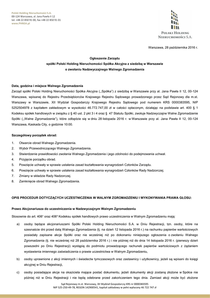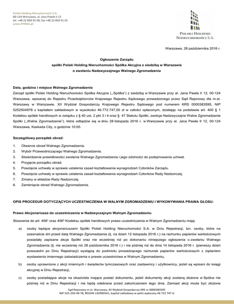 Polski Holding Nieruchomości S.A. 00-124 Warszawa, al. Jana Pawła II 12 tel. +48 22 850 91 00, fax +48 22 850 91 01 www.PHNSA.pl Warszawa, 28 października 2016 r. Ogłoszenie Zarządu spółki Polski Holding Nieruchomości Spółka Akcyjna z siedzibą w Warszawie o zwołaniu Nadzwyczajnego Walnego Zgromadzenia Data, godzina i miejsce Walnego Zgromadzenia Zarząd spółki Polski Holding Nieruchomości Spółka Akcyjna (,,Spółka”) z siedzibą w Warszawie przy al. Jana Pawła II 12, 00-124 Warszawa, wpisanej do Rejestru Przedsiębiorców Krajowego Rejestru Sądowego prowadzonego przez Sąd Rejonowy dla m.st. Warszawy w Warszawie, XII Wydział Gospodarczy Krajowego Rejestru Sądowego pod numerem KRS 0000383595, NIP 5252504978 z kapitałem zakładowym w wysokości 46.772.747,00 zł w całości opłaconym, działając na podstawie art. 400 § 1 Kodeksu spółek handlowych w związku z § 40 ust. 2 pkt 3 i 4 oraz § 47 Statutu Spółki, zwołuje Nadzwyczajne Walne Zgromadzenie Spółki (,,Walne Zgromadzenie”), które odbędzie się w dniu 28 listopada 2016 r. w Warszawie przy al. Jana Pawła II 12, 00-124 Warszawa, Kaskada City, o godzinie 10:00. Szczegółowy porządek obrad: 1. Otwarcie obrad Walnego Zgromadzenia. 2. Wybór Przewodniczącego Walnego Zgromadzenia. 3. Stwierdzenie prawidłowości zwołania Walnego Zgromadzenia i jego zdolności do podejmowania uchwał. 4. Przyjęcie porządku obrad. 5. Powzięcie uchwały w sprawie ustalenia zasad kształtowania wynagrodzeń Członków Zarządu. 6. Powzięcie uchwały w sprawie ustalenia zasad kształtowania wynagrodzeń Członków Rady Nadzorczej. 7. Zmiany w składzie Rady Nadzorczej. 8. Zamknięcie obrad Walnego Zgromadzenia. OPIS PROCEDUR DOTYCZĄCYCH UCZESTNICZENIA W WALNYM ZGROMADZENIU I WYKONYWANIA PRAWA GŁOSU: Prawo Akcjonariusza do uczestniczenia w Nadzwyczajnym Walnym Zgromadzeniu Stosownie do art. 406¹ oraz 406³ Kodeksu spółek handlowych prawo uczestniczenia w Walnym Zgromadzeniu mają: a) osoby będące akcjonariuszami Spółki Polski Holding Nieruchomości S.A. w Dniu Rejestracji, tzn. osoby, które na szesnaście dni przed datą Walnego Zgromadzenia (tj. na dzień 12 listopada 2016 r.) na rachunku papierów wartościowych posiadały zapisane akcje Spółki oraz nie wcześniej niż po dokonaniu niniejszego ogłoszenia o zwołaniu Walnego Zgromadzenia (tj. nie wcześniej niż 28 października 2016 r.) i nie później niż do dnia 14 listopada 2016 r. (pierwszy dzień powszedni po Dniu Rejestracji) wystąpią do podmiotu prowadzącego rachunek papierów wartościowych z żądaniem wystawienia imiennego zaświadczenia o prawie uczestnictwa w Walnym Zgromadzeniu, b) osoby uprawnione z akcji imiennych i świadectw tymczasowych oraz zastawnicy i użytkownicy, jeżeli są wpisani do księgi akcyjnej w Dniu Rejestracji, c) osoby posiadające akcje na okaziciela mające postać dokumentu, jeżeli dokumenty akcji zostaną złożone w Spółce nie później niż w Dniu Rejestracji i nie będą odebrane przed zakończeniem tego dnia. Zamiast akcji może być złożone Sąd Rejonowy m.st. Warszawy, XII Wydział Gospodarczy KRS nr 0000383595 NIP 525-250-49-78, REGON 142900541, kapitał zakładowy w pełni wpłacony 46 722 747 zł zaświadczenie wydane na dowód złożenia akcji u notariusza, w banku lub firmie inwestycyjnej mającej siedzibę lub oddział na terytorium Unii Europejskiej lub państwa będącego stroną umowy o Europejskim Obszarze Gospodarczym. W zaświadczeniu wskazuje się numery dokumentów akcji i stwierdza, że dokumenty akcji nie będą wydane przed upływem Dnia Rejestracji, d) osoby posiadające imienne zaświadczenia o prawie uczestnictwa w Walnym Zgromadzeniu wystawione przez podmiot prowadzący rachunek papierów wartościowych na żądanie uprawnionego z zdematerializowanych akcji na okaziciela Spółki zgłoszone w okresie od dnia ogłoszenia o zwołaniu Walnego Zgromadzenia tj. dnia 28 października 2016 r., do pierwszego dnia powszedniego po Dniu Rejestracji, tj. 14 listopada 2016 r. oraz e) przedstawiciele akcjonariuszy o których mowa w pkt. a) powyżej, którzy udokumentowali uprawnienie do działania w imieniu akcjonariusza w sposób należyty. Listę uprawnionych z akcji na okaziciela do uczestnictwa w Walnym Zgromadzeniu Spółka ustala na podstawie wykazu sporządzonego przez podmiot prowadzący depozyt papierów wartościowych zgodnie z przepisami o obrocie instrumentami finansowymi. Podmiot prowadzący depozyt papierów wartościowych sporządza wykaz na podstawie wykazów przekazywanych nie później niż na dwanaście dni przed datą Walnego Zgromadzenia przez podmioty uprawnione zgodnie z przepisami ustawy z dnia 29 lipca 2005 r. o obrocie instrumentami finansowymi. Podstawą sporządzenia wykazów przekazywanych podmiotowi prowadzącemu depozyt papierów wartościowych są wystawione zaświadczenia o prawie uczestnictwa w Walnym Zgromadzeniu Spółki. Lista akcjonariuszy uprawnionych do uczestnictwa w Walnym Zgromadzeniu zostanie wyłożona w biurze Spółki pod adresem: Kaskada City, al. Jana Pawła II 12, 00-124 Warszawa (V piętro w recepcji Spółki), w godzinach od 9.00 do 15.00, na trzy dni powszednie przed odbyciem Walnego Zgromadzenia, tj. w dniach od 23 listopada 2016 r. do 25 listopada 2016 r. Akcjonariusz Spółki może żądać przesłania mu listy akcjonariuszy uprawnionych do udziału w Walnym Zgromadzeniu nieodpłatnie pocztą elektroniczną na adres [email protected], podając własny adres poczty elektronicznej, na który lista powinna być wysłana. Składający takowe żądanie akcjonariusz musi udokumentować imiennym świadectwem depozytowym, że jest nim faktycznie w dniu złożenia powyższego żądania, jeśli nie znajduje się on na liście akcjonariuszy uprawnionych do udziału w Walnym Zgromadzeniu. Żądanie powinno być sporządzone w formie pisemnej i podpisane przez akcjonariusza lub osoby reprezentujące akcjonariusza, a w przypadku: a) akcjonariuszy będą