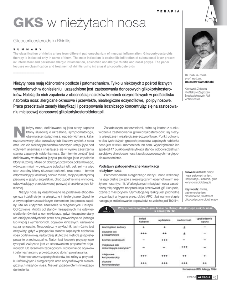 T E R A P I A GKS w nieżytach nosa Glicocorticosteroids in Rhinitis S U M M A R Y The classification of rhinitis arises from different pathomechanizm of mucosal inflammation. Glicocortycosteroids therapy is indicated only in some of them. The main indication is eosinofilic infiltration of submucosal layer present in: intermittent and persistent allergic inflammation, eosinofilic nonallergic rhinitis and nasal polyps. The paper focuses on classification and treatment of rhinitis using intranasal glicocorticosteroids ............................... Nieżyty nosa mają różnorodne podłoże i patomechanizm. Tylko u niektórych z pośród licznych wymienionych w doniesieniu uzasadnione jest zastosowaniu donosowych glikokortykosteroidów. Należą do nich zapalenia z obecnością nacieków komórek eozynofilowych w podścielisku nabłonka nosa: alergiczne okresowe i przewlekłe, niealergiczne eozynofilowe, polipy nosowe. Praca przedstawia zasady klasyfikacji i postępowania leczniczego koncentrując się na zastosowaniu miejscowej donosowej glikokortykosteroidoterapii. N ieżyty nosa, definiowane są jako stany zapalne błony śluzowej o określonej symptomatologii, obejmującej świąd nosa, napady kichania, katar rozpoznawany jako surowiczy lub śluzowy wyciek z nosa oraz uczucie blokady przewodów nosowych ustępujące pod wpływem anemizacji i nasilające się w wyniku zaostrzenia stanów zapalnych nabłonka nosa. Sam termin „nieżyt” jest definiowany w słowniku języka polskiego jako zapalenie błony śluzowej. Może on dotyczyć przewodu pokarmowego, wówczas mówimy o nieżycie żołądka i jelit, oskrzeli – a więc stan zapalny błony śluzowej oskrzeli, oraz nosa – termin odpowiadający łacińskiej nazwie rhinitis, mającej identyczną pisownię w języku angielskim, choć zupełnie inną wymowę, odpowiadający przedstawionej powyżej charakterystyce klinicznej. Nieżyty nosa są klasyfikowane na podstawie etiopatogenezy i dzieli się je na alergiczne i niealergiczne. Zgodnie z owym opisem zasadniczym elementem jest proces zapalny. Ma on krytyczne znaczenie w diagnostyce i terapii. Odróżnienie rhinitis od stanów niezapalnych ma odzwierciedlenie również w nomenklaturze, gdyż niezapalne stany utrudniające oddychanie przez nos, prowadzące do jednego lub więcej z wymienionych. objawów klinicznych, uznawane są za rynopatie. Terapeutyczny wykładnik tych różnic jest oczywisty, gdyż w przypadku stanów zapalnych nabłonka nosa podstawową, najbardziej skuteczną metodą jest postępowanie przeciwzapalne. Natomiast leczenie przyczynowe rynopatii związane jest ze stosowaniem preparatów objawowych lub leczeniem zabiegowym, stosownie do objawów i patomechanizmu prowadzącego do ich powstawania. Patomechanizm zapalnych stanów jest różny w przypadku infekcyjnych i alergicznych oraz eozynofilowych niealergicznych nieżytów nosa. Nie jest przedmiotem niniejszego doniesienia. Dr hab. n. med. prof. nadzw. Bolesław Samoliński Kierownik Zakładu Profilaktyki Zagrożeń Środowiskowych AM w Warszawie Zasadniczymi schorzeniami, które są istotne z punktu widzenia zastosowania glikokortykosteroidów, są nieżyty alergiczne i niealergiczne eozynofilowe. Punkt uchwytu w obu tych dużych grupach procesów zapalnych nabłonka nosa jest w wielu momentach ten sam. Wyodrębnienie ich spośród 47 punktowej klasyfikacji stanów odpowiedzialnych za objawy chorobowe nosa i zatok przynosowych ma głębokie uzasadnienie. Podstawy patogenetyczne klasyfikacji nieżytów nosa Patomechanizm alergicznego nieżytu nosa wskazuje na jego bliskie związki z niealergicznym eozynofilowym nieżytem nosa (ryc. 1). W alergicznych nieżytach nosa zasadniczą rolę odgrywa nadprodukcja przeciwciał IgE i ich połączenie z mastocytem. Stymulacja tej reakcji jest pochodną prezentacji antygenu przez układ APC. Już na tym etapie następuje zróżnicowanie odpowiedzi na zależną od Th2 lim- 1 TABELA Słowa kluczowe: nieżyt nosa, patomechanizm, klasyfikacja , leczenie, gliko kortykosteroidoterapia Key words: rhinitis, pathomechanizm, classification, treatment, glicocortycosteroidotherapy Wpływ poszczególnych grup leków na objawy alergicznego nieżytu nosa u dorosłych [12]. 2/2006 ALERGIA 45 T E R A P I A focytów, prowadzącą do alergicznego lub niealergicznego eozynofilowego nieżytu nosa. Reakcja zależną od limfocytów Th1 występuje w przypadku zapaleń infekcyjnych. Konsekwencją uruchomienia odpowiedzi IgE zależnej, a więc klasycznej atopowej reakcji, jest uwolnienie z komórek mastocytarnych mediatorów, wśród których najważniejszą rolę odgrywa histamina. Łącząc się z receptorem H1 1 Patomechanizm nieżytów nosa 2 Zależności między nieżytami nosa prowadzące do zespoły rhinosinusitis RYCINA RYCINA przewodów nosowych. Swoiste donosowe próby prowokacyjne pokazują, że czas jej trwania zwykle wynosi 30 minut. LTC4 i LTD4 oraz pobudzenie receptorów muskarynowych w układzie przywspółczulnym wzmagają również sekrecję gruczołów błony śluzowej nosa objawiającą się jako surowiczy katar. Oprócz mediatorów preformowanych i wydzielanych podczas reakcji atopowej, dochodzi do syntezy i uwalniania cytokin i chemokin (przez mastocyty, limfocyty Th2, bazofile i komórki epitelialne), które odpowiadają za podtrzymanie alergicznego procesu zapalnego i pojawienie się granulocytów kwasochłonnych. Zasadniczą rolę odgrywa IL-5 prowadząca do przyśpieszonego dojrzewania, migracji oraz opóźnionej apoptozy komórek eozynofilowych. W procesie tym uczestniczą inne istotne cytokiny, molekuły adhezyjne czy chemokiny. Dzięki wzmożonej produkcji i sekrecji powyższych czynników eozynofile stają się najistotniejszymi składowymi przewlekającego się procesu zapalnego, prowadząc do destrukcji komórek epitelialnych, błony podstawnej, oraz zakończeń nerwowych. Dochodzi do spadku napięcia naczyń krwionośnych, przesięku, zwiększenia zastoju w naczyniach p