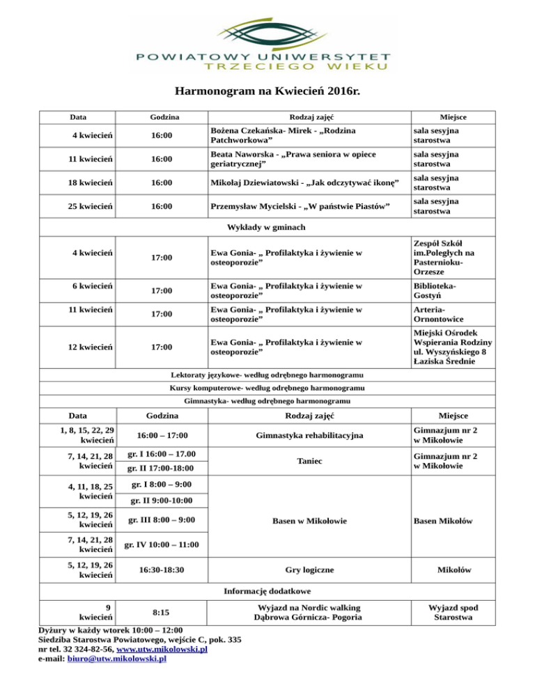 Harmonogram na Kwiecień 2016r. Data Godzina Rodzaj zajęć Miejsce 4 kwiecień 16:00 Bożena Czekańska- Mirek - „Rodzina Patchworkowa” sala sesyjna starostwa 11 kwiecień 16:00 Beata Naworska - „Prawa seniora w opiece geriatrycznej” sala sesyjna starostwa 18 kwiecień 16:00 Mikołaj Dziewiatowski - „Jak odczytywać ikonę” sala sesyjna starostwa 25 kwiecień 16:00 Przemysław Mycielski - „W państwie Piastów” sala sesyjna starostwa Wykłady w gminach 4 kwiecień 6 kwiecień 11 kwiecień 12 kwiecień 17:00 Ewa Gonia- „ Profilaktyka i żywienie w osteoporozie” Zespół Szkół im.Poległych na PasterniokuOrzesze 17:00 Ewa Gonia- „ Profilaktyka i żywienie w osteoporozie” BibliotekaGostyń 17:00 Ewa Gonia- „ Profilaktyka i żywienie w osteoporozie” ArteriaOrnontowice 17:00 Ewa Gonia- „ Profilaktyka i żywienie w osteoporozie” Miejski Ośrodek Wspierania Rodziny ul. Wyszyńskiego 8 Łaziska Średnie Lektoraty językowe- według odrębnego harmonogramu Kursy komputerowe- według odrębnego harmonogramu Gimnastyka- według odrębnego harmonogramu Data 1, 8, 15, 22, 29 kwiecień 7, 14, 21, 28 kwiecień 4, 11, 18, 25 kwiecień Godzina Rodzaj zajęć 16:00 – 17:00 Gimnastyka rehabilitacyjna Gimnazjum nr 2 w Mikołowie Taniec Gimnazjum nr 2 w Mikołowie Basen w Mikołowie Basen Mikołów gr. I 16:00 – 17.00 gr. II 17:00-18:00 Miejsce gr. I 8:00 – 9:00 gr. II 9:00-10:00 5, 12, 19, 26 kwiecień gr. III 8:00 – 9:00 7, 14, 21, 28 kwiecień gr. IV 10:00 – 11:00 5, 12, 19, 26 kwiecień 16:30-18:30 Gry logiczne Mikołów Informację dodatkowe 9 kwiecień 8:15 Dyżury w każdy wtorek 10:00 – 12:00 Siedziba Starostwa Powiatowego, wejście C, pok. 335 nr tel. 32 324-82-56, www.utw.mikolowski.pl e-mail: [email protected] Wyjazd na Nordic walking Dąbrowa Górnicza- Pogoria Wyjazd spod Starostwa