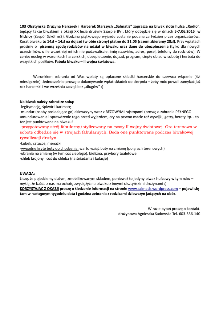 103 Olsztyńska Drużyna Harcerek i Harcerek Starszych „Salmatis” zaprasza na biwak zlotu hufca „Rodło”, będący także biwakiem z okazji XX lecia drużyny Szarpie BV , który odbędzie się w dniach 5-7.06.2015 w Nidzicy (Zespół Szkół nr2). Godzina piątkowego wyjazdu zostanie podana za tydzień przez organizatorów.. Koszt biwaku to 14zł + 14zł na dojazd (w obie strony) płatne do 31.05 (razem zbieramy 28zł). Przy wpłatach prosimy o pisemną zgodę rodziców na udział w biwaku oraz dane do ubezpieczenia (tylko dla nowych uczestników, o ile wcześniej mi ich nie podawaliście: imię nazwisko, adres, pesel, telefony do rodziców). W cenie: nocleg w warunkach harcerskich, ubezpieczenie, dojazd, program, ciepły obiad w sobotę i herbata do wszystkich posiłków. Fabuła biwaku – II wojna światowa. Warunkiem zebrania od Was wpłaty są opłacone składki harcerskie do czerwca włącznie (4zł miesięcznie). Jednocześnie proszę o dokonywanie wpłat składek do sierpnia – żeby móc powoli zamykać już rok harcerski i we wrześniu zacząć bez „długów” :) Na biwak należy zabrać ze sobą: -legitymację, śpiwór i karimatę -mundur (osoby posiadające go) dziewczyny wraz z BEŻOWYMI rajstopami (proszę o zabranie PEŁNEGO umundurowania i sprawdzenie tego przed wyjazdem, czy na pewno macie też wywijki, getry, berety itp. - to też jest punktowane na biwaku! -przygotowany strój fabularny/stylizowany na czasy II wojny światowej. Gra terenowa w sobotę odbędzie się w strojach fabularnych. Będą one punktowane podczas biwakowej rywalizacji drużyn. -kubek, sztućce, menażki -wygodne kryte buty do chodzenia, warto wziąć buty na zmianę (po grach terenowych) -ubrania na zmianę (w tym coś ciepłego), bielizna, przybory toaletowe -chleb krojony i coś do chleba (na śniadania i kolacje) UWAGA: Liczę, że pojedziemy dużym, zmobilizowanym składem, ponieważ to jedyny biwak hufcowy w tym roku – myślę, że każda z nas ma ochotę zwyciężyć na biwaku z innymi olsztyńskimi drużynami :) KORZYSTAJĄC Z OKAZJI proszę o śledzenie informacji na stronie www.salmatis.wordpress.com – pojawi się tam w następnym tygodniu data i godzina zebrania z rodzicami dziewczyn jadących na obóz. W razie pytań proszę o kontakt. drużynowa Agnieszka Sadowska Tel. 603-336-140