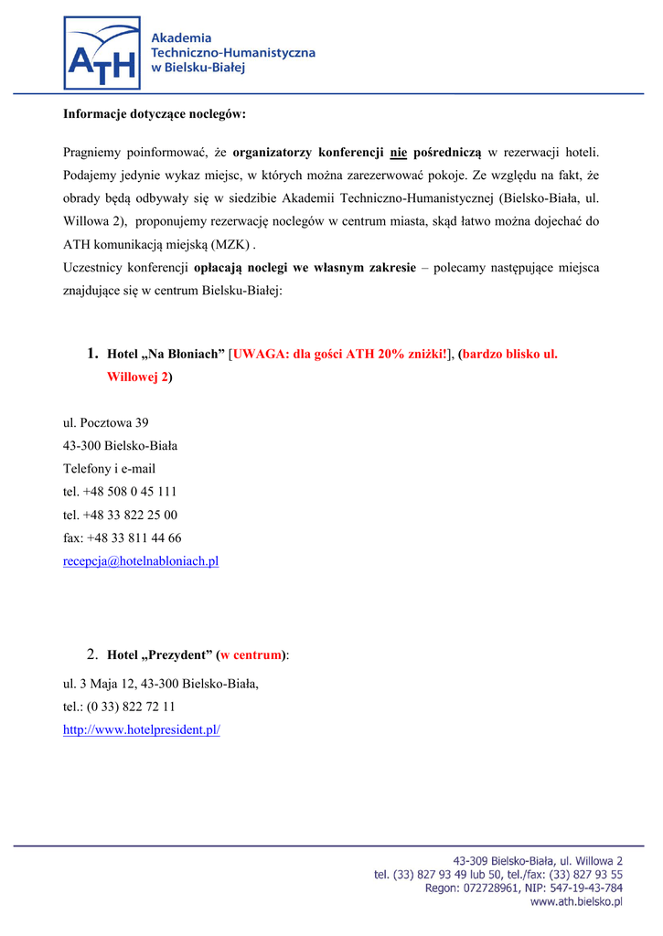 Informacje dotyczące noclegów: Pragniemy poinformować, że organizatorzy konferencji nie pośredniczą w rezerwacji hoteli. Podajemy jedynie wykaz miejsc, w których można zarezerwować pokoje. Ze względu na fakt, że obrady będą odbywały się w siedzibie Akademii Techniczno-Humanistycznej (Bielsko-Biała, ul. Willowa 2), proponujemy rezerwację noclegów w centrum miasta, skąd łatwo można dojechać do ATH komunikacją miejską (MZK) . Uczestnicy konferencji opłacają noclegi we własnym zakresie – polecamy następujące miejsca znajdujące się w centrum Bielsku-Białej: 1. Hotel „Na Błoniach” [UWAGA: dla gości ATH 20% zniżki!], (bardzo blisko ul. Willowej 2) ul. Pocztowa 39 43-300 Bielsko-Biała Telefony i e-mail tel. +48 508 0 45 111 tel. +48 33 822 25 00 fax: +48 33 811 44 66 [email protected] 2. Hotel „Prezydent” (w centrum): ul. 3 Maja 12, 43-300 Bielsko-Biała, tel.: (0 33) 822 72 11 http://www.hotelpresident.pl/ 3. Parkhotel „Vienna”: **** (blisko ul. Willowej 2) ul. Bystrzańska 48 Dział Rezerwacji Tel. +48 33 496 62 66 Fax + 48 33 496 62 96 E-mail: [email protected] http://www.vienna.pl/ 4. Hotel „Magura”: Orbis S.A. Oddział Hotel Magura w Bielsku-Białej *** ul. Żywiecka 93 43-300 Bielsko-Biała tel.(033) 819 91 99 fax: (033) 819 91 59 strona www.orbis.pl email: [email protected] 5. Hotel Rekord Ośrodek Sportowo-Szkoleniowy (blisko ul. Willowej 2) ul. Startowa 13 43-309 Bielsko-Biała tel.(033) 829 96 10 fax: (033) 829 96 14 strona www: www.hotel.rekord.com.pl email: [email protected] 6. Szkolne Schronisko Młodzieżowe im. Bolka i Lolka (blisko centrum) (polecamy młodym naukowcom ) Bielsko-Biała, ul. Starobielska 10, 43-300 Bielsko-Biała, tel. (033) 816 74 66, www.ssm.bielsko.pl 7. Dom Turysty PTTK (polecamy młodym naukowcom ): (blisko centrum) Bielsko-Biała, ul. Krasińskiego 38 tel. 812 30 19, www.pttk.bielsko.pl 8. Pokoje gościnne przy Placu Wolności (blisko centrum) Plac Wolności 1/10, 43-300 Bielsko-Biała, tel. 502 614 952, www.pokoje-bielsko.pl Ponadto: 9. Hotel „Stara Szmergielnia”: http://www.staraszmergielnia.pl/ (stosunkowo blisko Willowej 2) 10. Hotel „Dębowiec”: www.hoteldebowiec.pl 11. Camping „Ondraszek” [blisko Willowej 2] (polecamy młodym naukowcom ): http://www.ondraszek.cba.pl/ Dojazd do Bielska-Białej i Akademii Techniczno-Humanistycznej Do Bielska-Białej można dojechać koleją lub autobusami PKS. Z dworca PKP Bielsko-Biała Główna i z dworca PKS Bielsko-Biała - dojazd do Akademii Techniczno-Humanistycznej autobusem MZK linia 24 (przystanek przy ul. Piastowskiej w kierunku centrum miasta, jedziemy do samego końca; cena biletu MZK 3 zł, u kierowcy 4 zł) lub taksówką (cena ok. 35-40 zł). UWAGA: po akceptacji zgłoszenia wyślemy Państwu szczegółową mapkę Bielska-Białej z zaznaczonymi hotelami, dworcami PKP i PKS oraz kampusem ATH. W razie jakichkolwiek problemów prosimy o kontakt: [email protected] (tel. 781 557 795)