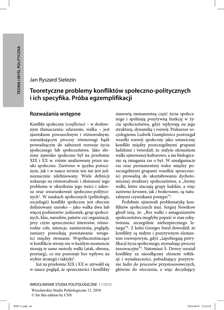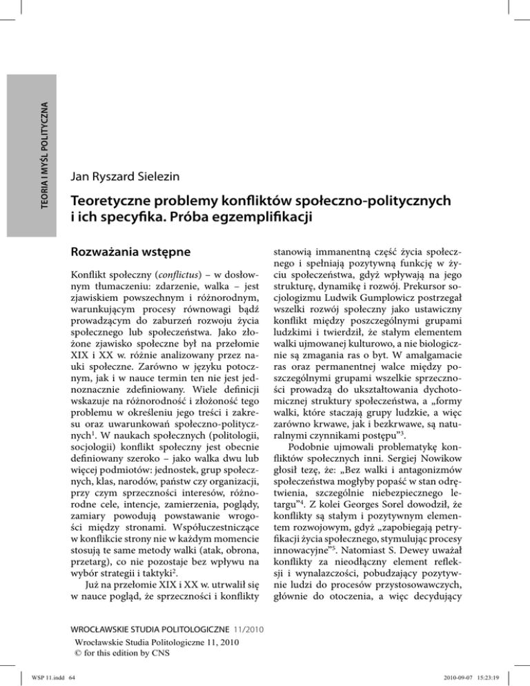 TEORIA I MYŚL POLITYCZNA Jan Ryszard Sielezin Teoretyczne problemy konfliktów społeczno-politycznych i ich specyfika. Próba egzemplifikacji Rozważania wstępne Konflikt społeczny (conflictus) – w dosłownym tłumaczeniu: zdarzenie, walka – jest zjawiskiem powszechnym i różnorodnym, warunkującym procesy równowagi bądź prowadzącym do zaburzeń rozwoju życia społecznego lub społeczeństwa. Jako złożone zjawisko społeczne był na przełomie XIX i XX w. różnie analizowany przez nauki społeczne. Zarówno w języku potocznym, jak i w nauce termin ten nie jest jednoznacznie zdefiniowany. Wiele definicji wskazuje na różnorodność i złożoność tego problemu w określeniu jego treści i zakresu oraz uwarunkowań społeczno-politycznych1. W naukach społecznych (politologii, socjologii) konflikt społeczny jest obecnie definiowany szeroko – jako walka dwu lub więcej podmiotów: jednostek, grup społecznych, klas, narodów, państw czy organizacji, przy czym sprzeczności interesów, różnorodne cele, intencje, zamierzenia, poglądy, zamiary powodują powstawanie wrogości między stronami. Współuczestniczące w konflikcie strony nie w każdym momencie stosują te same metody walki (atak, obrona, przetarg), co nie pozostaje bez wpływu na wybór strategii i taktyki2. Już na przełomie XIX i XX w. utrwalił się w nauce pogląd, że sprzeczności i konflikty stanowią immanentną część życia społecznego i spełniają pozytywną funkcję w życiu społeczeństwa, gdyż wpływają na jego strukturę, dynamikę i rozwój. Prekursor socjologizmu Ludwik Gumplowicz postrzegał wszelki rozwój społeczny jako ustawiczny konflikt między poszczególnymi grupami ludzkimi i twierdził, że stałym elementem walki ujmowanej kulturowo, a nie biologicznie są zmagania ras o byt. W amalgamacie ras oraz permanentnej walce między poszczególnymi grupami wszelkie sprzeczności prowadzą do ukształtowania dychotomicznej struktury społeczeństwa, a „formy walki, które staczają grupy ludzkie, a więc zarówno krwawe, jak i bezkrwawe, są naturalnymi czynnikami postępu”3. Podobnie ujmowali problematykę konfliktów społecznych inni. Sergiej Nowikow głosił tezę, że: „Bez walki i antagonizmów społeczeństwa mogłyby popaść w stan odrętwienia, szczególnie niebezpiecznego letargu”4. Z kolei Georges Sorel dowodził, że konflikty są stałym i pozytywnym elementem rozwojowym, gdyż „zapobiegają petryfikacji życia społecznego, stymulując procesy innowacyjne”5. Natomiast S. Dewey uważał konflikty za nieodłączny element refleksji i wynalazczości, pobudzający pozytywnie ludzi do procesów przystosowawczych, głównie do otoczenia, a więc decydujący WROCŁAWSKIE STUDIA POLITOLOGICZNE 11/2010 Wrocławskie Studia Politologiczne 11, 2010 © for this edition by CNS WSP 11.indd 64 2010-09-07 15:23:19 65 Postrzeganie problemu w ujęciu retrospektywnym W pierwszej połowie XX w. zainteresowanie konfliktem było w naukach społecznych wciąż znaczne. Powstałe w socjologii nowe kierunki nie tworzyły wprawdzie konfliktowych modeli społeczeństwa, ale ich reprezentanci dostrzegali znaczenie konfliktu dla rozwoju życia społecznego7. Problem ten okazał się także atrakcyjny dla kolejnej generacji badaczy, którzy analizując poszczególne fazy jego rozwoju, podkreślali, że konflikt „jest normalnym zjawiskiem społecznym”. Analizując funkcjonalność konfliktu „w stosunku do spójności grupy”, wskazywali na „wzmocnienia norm grupowych i zmian społecznych”. Akcentowali znaczenie interesów grupowych w życiu społecznym, a szczególną uwagę skupili na analizie nacisków, jakie grupy interesów wywierały „na siebie nawzajem” oraz kwestii „równowagi nacisków grupowych”. Dostrzegli związki „między formą konfliktu a typem struktury społecznej, w której ma on miejsce”. Badacze eksponowali tezę, „iż sprzeczności i konflikty między rządzącą mniejszością a rządzącą większością są nieuniknione i wieczne” i kolejną, że przemoc pełni rolę oczyszczającą. Egzemplifikowali problem „powiązań między typem przyjmowanego przez uczonego modelu pojęciowego a jego systemem wartości”, co pozwalało spojrzeć z innej perspektywy na przedmiot i końcowe wyniki badań8. Choć w latach 30. XX w. dokonał się w socjologii (głównie amerykańskiej) zwrot, z powodu kryzysu gospodarczego częściowo zaniechano kontynuowania badań nad problematyką konfliktu i zainteresowano się głównie reformami społecznymi, ale czołowi przedstawiciele, wierni poprzedniej orientacji teoretycznej, nie zerwali całkowicie z tematem. W końcu lat 30. XX w. konfliktem społecznym zajmował się socjolog rosyjskiego pochodzenia Pitrim A. Sorokin, który podobnie jak poprzednicy, głosił tezę, że […] konflikt, opozycja, walka były od niepamiętnych czasów deklarowane jako fundamentalne prawo natury, ludzkiej egzystencji, a także jako źródło wszelkich zmian i postępu9. TEORIA I MYŚL POLITYCZNA o rozwoju i postępie społeczeństwa6. Zaprezentowane skrótowo koncepcje konfliktów mają wspólną cechę: podkreślają jego kreatywną funkcję oraz akcentują znaczenie walki w rozwoju społeczeństwa. Łatwo zauważyć, że młodsze pokolenie badaczy dzieliła różnica poglądów dotycząca nie tylko genezy omawianego zjawiska, ale i źródeł sprzeczności występujących w społeczeństwie, które wpływały na dynamikę, strukturę, typ i rodzaj konfliktów. Akcentowano znaczenie czynników konfliktogennych: nierówności społecznych, systemów wartości, władzy, zmian społeczno-ekonomicznych, demograficznych, organizacyjnych, technologicznych oraz kulturowych, które zdaniem Henryka Białyszewskiego, mogły oddziaływać na członków zbiorowości i powodować powstanie fobii, frustracji i napięć psychicznych utrudniających przystosowanie do zmiennych warunków społecznych. Nietrudno wykazać, że czynniki