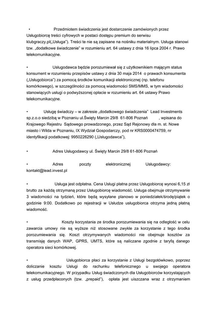 • Przedmiotem świadczenia jest dostarczenie zamówionych przez Usługobiorcę treści cyfrowych w postaci dostępu premium do serwisu klubgraczy.pl(„Usługa”). Treści te nie są zapisane na nośniku materialnym. Usługa stanowi tzw. „dodatkowe świadczenie” w rozumieniu art. 64 ustawy z dnia 16 lipca 2004 r. Prawo telekomunikacyjne. • Usługodawca będzie porozumiewał się z użytkownikiem mającym status konsument w rozumieniu przepisów ustawy z dnia 30 maja 2014 o prawach konsumenta („Usługobiorca”) za pomocą środków komunikacji elektronicznej (np. telefonu komórkowego), w szczególności za pomocą wiadomości SMS/MMS, w tym wiadomości stanowiących usługi o podwyższonej opłacie w rozumieniu art. 64 ustawy Prawo telekomunikacyjne. • Usługę świadczy – w zakresie „dodatkowego świadczenia” Lead Investments sp.z.o.o siedzibą w Poznaniu ul.Święty Marcin 29/8 61-806 Poznań , wpisana do Krajowego Rejestru Sądowego prowadzonego, przez Sąd Rejonowy dla m. st. Nowe miasto i Wilda w Poznaniu, IX Wydział Gospodarczy, pod nr KRS0000474759, nr identyfikacji podatkowej: 9950226290 („Usługodawca”), • Adres Usługodawcy ul. Święty Marcin 29/8 61-806 Poznań • Adres poczty elektronicznej Usługodawcy: [email protected] • Usługa jest odpłatna. Cena Usługi płatna przez Usługobiorcę wynosi 6,15 zł brutto za każdą otrzymaną przez Usługobiorcę wiadomość. Usługa obejmuje otrzymywanie 3 wiadomości na tydzień, które będą wysyłane planowo w poniedziałek/środę/piątek o godzinie 9:00. Dodatkowo po rejestracji w Usłudze usługobiorca otrzyma jedną płatną wiadomość. • Koszty korzystania ze środka porozumiewania się na odległość w celu zawarcia umowy nie są wyższe niż stosowane zwykle za korzystanie z tego środka porozumiewania się. Koszt otrzymywanych wiadomości nie obejmuje kosztów za transmisję danych WAP, GPRS, UMTS, które są naliczane zgodnie z taryfą danego operatora sieci komórkowej. • doliczanie Usługobiorca płaci za korzystanie z Usługi bezgotówkowo, poprzez kosztu Usługi do rachunku telefonicznego u swojego operatora telekomunikacyjnego. W przypadku Usług świadczonych dla Usługobiorców korzystających z usług przedpłaconych (tzw. „prepaid”), opłata jest uiszczana wraz z otrzymaniem zamówionej Usługi poprzez odliczenie jej wartości od salda konta prepaid posiadanego przez Usługobiorcę u operatora telekomunikacyjnego. Termin zapłaty rachunku telefonicznego, zasilenia konta prepaid jak również sposoby ich opłacenia, wynikają z umowy o usługi telekomunikacyjne zawieranej pomiędzy Usługobiorcą a operatorem telekomunikacyjnym, z usług którego korzysta w związku z Usługą. • Usługa jest świadczona poprzez wysyłanie Usługobiorcy, na podany przez niego numer telefonu komórkowego, zamówionych przez niego treści cyfrowych. Treści te będą wysyłane planowo poniedziałek/środę/piątek o godzinie 9:00. Terminy te mogą ulec zmianie z przyczyn niezależnych od Usługodawcy np. w razie zaistnienia problemów technicznych po stronie operatora telekomunikacyjnego, z usług którego korzysta Usługobiorca. Z uwagi na brak możliwości zwrotu treści cyfrowych, realizacja Usługi rozpocznie się niezwłocznie po zawarciu umowy pod warunkiem udzielenia przez Usługobiorcę zgody na rozpoczęcie spełniania świadczenia przed upływem terminu do odstąpienia od umowy. W braku takiej zgody realizacja Usługi rozpocznie się niezwłocznie po upływie terminu do odstąpienia od umowy o ile Usługobiorca w międzyczasie od niej nie odstąpił. Wyrażenie zgody, o której mowa powyżej oznacza utratę prawa do odstąpienia od umowy przez Usługobiorcę. • Reklamacje można kierować drogą: wiadomości poczty elektronicznej na adres [email protected], lub poprzez formularz na stronie lead-invest.pl. Reklamacje są rozpatrywane (a w przypadku zgłaszania ich telefonicznie również przyjmowane) w dni robocze, od poniedziałku do piątku w godz. 10.0015.00. Termin rozpatrzenia reklamacji wynosi 14 dni roboczych od dnia jej wpływu do Usługodawcy. Termin ten może ulec zmianie jeżeli do rozpatrzenia reklamacji konieczne okaże się uzyskanie informacji od operatorów telekomunikacyjnych lub podmiotów współpracujących z Usługodawcą przy świadczeniu Usługi albo też dodatkowych informacji od Usługobiorcy. Usługodawca może domagać się od wnoszącego reklamację podania dodatkowych informacji o ile są one niezbędne do rozpatrzenia tej reklamacji. W takim przypadku czasu oczekiwania na podanie takich dodatkowych informacji nie uwzględnia się w czasie rozpatrywania reklamacji. O wyniku rozpatrzenia reklamacji Usługobiorca zostanie poinformowany pisemnie, drogą wiadomości poczty elektronicznej lub telefonicznie. Negatywne rozpatrzenie reklamacji wymaga uzasadnienia. • Usługobiorcy przysługuje prawo odstąpienia od umowy bez podawania jakiejkolwiek przyczyny w terminie 14 dni od dnia jej zawarcia. Odstąpienie od umowy polega na złożeniu przez Usługobiorcę na adres: ul.Święty Marcin 29/8 61-806 Poznań lub [email protected] jednoznacznego oświadczenia o odstąpieniu od umowy. Można przy tym skorzystać z wzoru takiego oświadczenia stanowiącego załącznik nr 2 do ustawy z dnia 30 maja 2014 r. o prawach konsumenta. Skorzystanie z tego wzoru nie jest jednak obowiązkowe. Aby zachować termin do odstąpienia od umowy wystarczy wysłać oświadczenie o takim odstąpieniu przed upływem terminu do tego odstąpienia. W przypadku odstąpienia od niniejszej umowy Usługodawca zwraca Usługobiorcy wszystkie otrzymane od Usługobiorcy płatności, niezwłocznie, a w każdym przypadku nie później niż 14 dni od dnia, w którym Usługodawca został poinformowany o wykonaniu prawa odstąpienia od umowy przez Usługobiorcę. Zwrot płatności zostanie dokonany przy użyciu takich samych sposobów płatności, jakie zostały przez Usługobiorcę użyte w pierwo