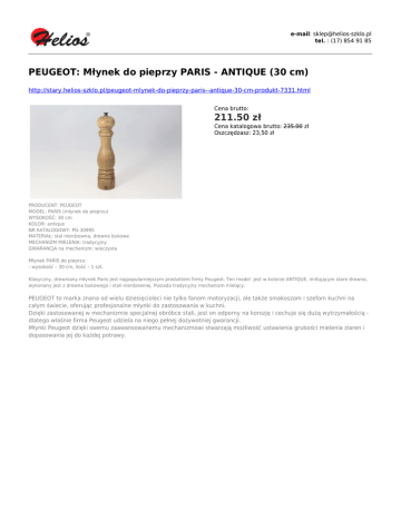 e-mail: [email protected] tel. : (17) 854 91 85 PEUGEOT: Młynek do pieprzy PARIS - ANTIQUE (30 cm) http://stary.helios-szklo.pl/peugeot-mlynek-do-pieprzy-paris--antique-30-cm-produkt-7331.html Cena brutto: 211.50 zł Cena katalogowa brutto: 235.00 zł Oszczędzasz: 23,50 zł PRODUCENT: PEUGEOT MODEL: PARIS (młynek do pieprzu) WYSOKOŚĆ: 30 cm KOLOR: antique NR KATALOGOWY: PG-30995 MATERIAŁ: stal nierdzewna, drewno bukowe MECHANIZM MIELENIA: tradycyjny GWARANCJA na mechanizm: wieczysta Młynek PARIS do pieprzu: - wysokość – 30 cm, ilość – 1 szt. Klasyczny, drewniany młynek Paris jest najpopularniejszym produktem firmy Peugeot. Ten model jest w kolorze ANTIQUE, imitującym stare drewno, wykonany jest z drewna bukowego i stali nierdzewnej. Posiada tradycyjny mechanizm mielący. PEUGEOT to marka znana od wielu dziesięcioleci nie tylko fanom motoryzacji, ale także smakoszom i szefom kuchni na całym świecie, oferując profesjonalne młynki do zastosowania w kuchni. Dzięki zastosowanej w mechanizmie specjalnej obróbce stali, jest on odporny na korozję i cechuje się dużą wytrzymałością dlatego właśnie firma Peugeot udziela na niego pełnej dożywotniej gwarancji. Młynki Peugeot dzięki swemu zaawansowanemu mechanizmowi stwarzają możliwość ustawienia grubości mielenia ziaren i dopasowania jej do każdej potrawy.