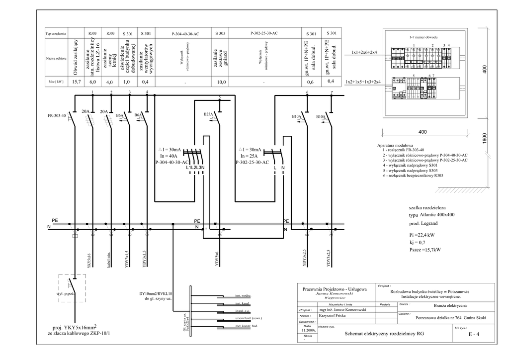 6,0 3 4 10,0 - 0,6 0,4 - 1-7 numer obwodu 1 3 4 2 2 4 6 2 4 6 1 3 5 1 3 5 1x1+2x6+2x4 400 róŜnicowo - prądowy Wyłącznik zasilanie zestawu gniazd zasilanie wentylatorów wyciągowych 2 róŜnicowo - prądowy oświetlenie części budynku dobudowanej 0,4 S 301 6 7 5 1x2+1x5+1x3+2x4 7 4,0 1,0 S 301 P-302-25-30-AC S 303 P-304-40-30-AC Wyłącznik S 301 gn.wt. 1P+N+PE sala dobud. 15,7 S 301 gn.wt. 1P+N+PE sala dobud. Moc [ kW ] Obwód zasilający Nazwa odbioru R303 zasilanie istn. rozdzielniicy listwa LZ-16 zasilanie sceny letniej R303 Typ urządzenia 1 6 T T 5 20A 20A FR-303-40 B25A B6A B6A B10A B10A I = 30mA In = 40A P-304-40-30-AC Aparatura modułowa 1 - rozłącznik FR-303-40 2 - wyłącznik róŜnicowo-prądowy P-304-40-30-AC 3 - wyłącznik róŜnicowo-prądowy P-302-25-30-AC 4 - wyłącznik nadprądowy S301 5 - wyłącznik nadprądowy S303 6 - rozłącznik bezpiecznikowy R303 I = 30mA In = 25A P-302-25-30-AC L1L2L3N L 1600 400 N szafka rozdzielcza typu Atlantic 400x400 PE PE N N PE prod. Legrand N Pszcz =15,7kW YDY3x2,5 YDY3x2,5 YDY5x6 YDY3x1,5 YDY3x1,5 kabel istn. YKY5x16 Pi = 22,4 kW kj = 0,7 Projekt : Pracownia Projektowo - Usługowa wył. p.poŜ. DY10mm2/RVKL18 do gł. szyny uz. Wągrowiec inst. kanal proj. YKY5x16mm2 ze złacza kablowego ZKP-10/1 Gł. szyna uz. FeZn25x4 instal. c.o. uziom fund. (zewn.) Rozbudowa budynku świetlicy w Potrzanowie Instalacje elektryczne wewnętrzne. Janusz Komorowski inst. wodoc. Nazwisko i imię Projekt : mgr inŜ. Janusz Komorowski Kreślił : Krzysztof Friska Podpis BranŜa : BranŜa elektryczna Obiekt : Potrzanowo działka nr 764 Gmina Skoki Sprawdził : met. konstr. bud. Data 11.2009r. Skala - Nazwa rys. Nr rys.: Schemat elektryczny rozdzielnicy RG E-4