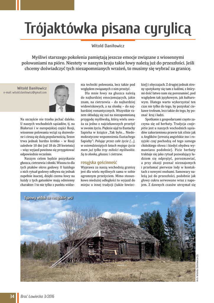 Trójaktówka pisana cyrylicą Witold Daniłowicz Myśliwi starszego pokolenia pamiętają jeszcze emocje związane z wiosennymi polowaniami na pióro. Niestety w naszym kraju takie łowy należą już do przeszłości. Jeśli chcemy doświadczyć tych niezapomnianych wrażeń, to musimy się wybrać za granicę. Witold Daniłowicz e-mail: [email protected] Na szczęście nie trzeba jechać daleko. U naszych wschodnich sąsiadów, tj. na Białorusi i w europejskiej części Rosji, wiosenne polowania wciąż są dozwolone i cieszą się dużą popularnością. Sezon trwa jednak bardzo krótko – w Rosji zaledwie 10 dni (od 18 do 28 kwietnia) – więc wyjazd powinno się przygotować odpowiednio wcześnie. Naszym celem będzie pozyskanie głuszca, cietrzewia i słonki. Wiosna to dla tych ptaków okres godowy. U każdego z nich rytuał godowy odbywa się jednak zupełnie inaczej, dzięki czemu łowy na każdy z tych gatunków mają odmienny charakter. I to nie tylko z punktu widze- nia techniki polowania, lecz także pod względem związanych z nim przeżyć. Dla mnie łowy na głuszca należą do najbardziej emocjonujących, jakie znam, na cietrzewia – do najbardziej widowiskowych, a na słonkę – do najbardziej romantycznych. Wszystkie razem składają się zaś na niezapomnianą przygodę myśliwską, którą wielu uważa za jedno z najciekawszych przeżyć w swoim życiu. Pięknie ujął to Eustachy Sapieha w książce „Tak było… Niedemokratyczne wspomnienia Eustachego Sapiehy”: Polując przez całe życie (…), w osiemdziesiątych latach mojego życia mam już tylko trzy miłości myśliwskie. Są to słonka, głuszec i cietrzew. rosyjska gościnność Wyprawa za naszą wschodnią granicę jest dla wielu myśliwych sama w sobie ogromnym przeżyciem. Mimo stosunkowo niedużej odległości to wyjazd do miejsc o innej tradycji (także łowiec- kiej) i obyczajach. Z drugiej jednak strony spotykamy się tam z ludźmi, z którymi dość łatwo nam się porozumieć, pod względem tak językowym, jak kulturowym. Dlatego warto wykorzystać ten czas nie tylko do tego, by pozyskać ciekawe trofeum, lecz także do tego, by poznać kraj i ludzi. Spotkanie z gospodarzami często zaczyna się od herbaty. Tradycja czajepitia jest u naszych wschodnich sąsiadów zakorzeniona prawie tak silnie jak u Anglików (zresztą angielskie tea i rosyjski czaj pochodzą od tego samego chińskiego słowa i kiedyś obydwa wymawiano podobnie). Picie herbaty traktuje się jako rytuał pozwalający ludziom się odprężyć, porozmawiać, a przy okazji poznać nieznajomych i przełamać pierwsze lody w kontaktach z nowymi osobami. Samowary należą już do przeszłości, podobnie jak głowy cukru serwowane wraz z napojem. Z dawnych czasów utrzymał się Arch. Witolda Daniłowicza (5) Typowy widok na rosyjskiej wsi 34 Brać Łowiecka 3/2016 Ostatnie wskazówki przed podchodem natomiast obyczaj picia herbaty z konfiturą (czaj z warienjem) albo miodem, podawanymi na specjalnych malutkich talerzykach. Rosjanie są miłośnikami dobrej herbaty i jej znawcami. Chcąc sprawić przyjemność gospodarzom, warto pochwalić jakość spożywanego napoju – na pewno to docenią. Zasady gościnności wymagają też, aby gościa nakarmić. Trzeba się więc przygotować na duże ilości jedzenia. Raczej nie będzie ono niskokaloryczne, ale bez wątpienia smaczne. Najrozmaitsze rodzaje pierożków (z twarogiem albo z konfiturą), pielmieni, sałaty – to dopiero wstęp do prawdziwego obiadu czy kolacji. Ponieważ staram się zawsze zjeść (przynajmniej w symbolicznej ilości) to, co upolowałem, z reguły udaje mi się przekonać kucharza, żeby ugotował zupę z cietrzewia albo słonki – coś w rodzaju rosołu z kawałkami mięsa. Warto też spróbować pieczeni z głuszca. Jej przyrządzenie wymaga jednak trochę czasu, bo tuszka tego ptaka musi się wcześniej odpowiednio długo odmoczyć. Do picia zapewne dostaniemy typowo rosyjski napój o nazwie mors, zrobiony z czerwonych owoców. Przypomina nasz kompot, tyle że ani woda, ani owoce nie są gotowane. Mój pierwszy głuszec Jedzenie to także rozmowa, a co jakiś czas ktoś proponuje wypicie kieliszka i wznosi toast. Pod tym względem dzieli nas jednak przepaść kulturowa. Toast u Rosjan to bowiem krótkie przemówienie, zawsze kończące się morałem. Obowiązuje zasada, że każdy uczestnik biesiady powinien wygłosić toast przynajmniej raz. Warto się więc do tego przygotować – posłuchać, co mówią inni, wczuć się w nastrój i powiedzieć coś od siebie. Sztuka konwersacji na Wschodzie jest bardzo rozwinięta i dobry partner do rozmowy zawsze będzie miłym gościem. Trzeba się jednak nastawić na to, że nasi interlokutorzy są z reguły przekonani o absolutnej prawdziwości podawanych przez siebie informacji czy słuszności swoich przekonań. Dlatego np. jeżeli w rozmowie o motoryzacji usłyszymy, że samochód jakiejś marki jest „najlepszy na świecie”, to najczęściej zostanie to powiedziane w taki sposób, jakby ten fakt podała do wiadomości akademia nauk. Najlepiej obrazuje to wypowiedź mojego rosyjskiego znajomego skierowana do jego przyjaciela w trakcie sporu na temat znaczenia jakiegoś technicznego określenia z dziedziny produkcji wina: „Dlaczego ty się ze mną kłócisz? Przecież ja ci mówię, jak jest!”. głuszec, czyli emocje O godz. 2.00 nad ranem budzi mnie stukanie do drzwi. To najmniej przyjemny aspekt wiosennych polowań, zwłaszcza pierwszego dnia pobytu. Na szczęście świadomość, że za chwilę wyruszamy na głuszca, podnosi poziom adrenaliny i pozwala zapomnieć o braku snu. Ubranie, broń, szybka kawa i można jechać. Przed domem czeka jegier’ – tak po rosyjsku (z niemiecka) określa się łowczego, czyli zawodowego myśliwego, a w tym przypadku podprowadzającego. Do łowiska mamy spory kawałek – 45 min jazdy – więc po drodze zdążymy omówić sposób polowania. Najczęściej wygląda t