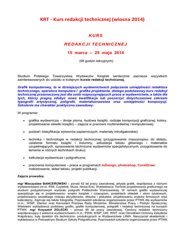 KRT - Kurs redakcji technicznej (wiosna 2014) KURS R E D AK C J I TE CH NI C Z NE J 15 marca – 25 maja 2014 (95 godzin lekcyjnych) Studium Polskiego Towarzystwa Wydawców Książek serdecznie zainteresowanych do udziału w kolejnym kursie redakcji technicznej. zaprasza wszystkich Grafik komputerowy, to w dzisiejszych wydawnictwach połączenie umiejętności redaktora technicznego, operatora komputera i grafika projektanta, dlatego podstawowy kurs redakcji technicznej przeznaczony jest dla osób rozpoczynających pracę w wydawnictwie, a także dla tych, którzy pragną zdobyć nowe kwalifikacje lub poszerzyć dotychczasowe zakresie typografii artystycznej, poligrafii, materiałoznawstwa oraz umiejętności kompozycji. Szkolenie ma charakter praktyczno-zawodowy. W programie: grafika wydawnicza – (kroje pisma, budowa książki, rodzaje kompozycji graficznej, kolory, projektowanie okładki książki) – zajęcia w pracowni multimedialnej i komputerowej; podział i klasyfikacja wytworów papierniczych, materiały introligatorskie); technika i technologia w redakcji technicznej (przygotowanie maszynopisu do składu, ustalenie formatu książki i kolumny, adiustacja tekstu głównego i materiałów uzupełniających, opracowanie techniczne wydawnictw specjalistycznych, przygotowanie do łamania w różnych technikach druku); kalkulacja wydawnicza i poligraficzna; pracownia komputerowa – praca w programach InDesign, photoshop, CorelDraw: makietowanie, skład tekstu, projekt publikacji. Zajęcia prowadzą: mgr Mieczysław BANCEROWSKI – ponad 42 lat pracy zawodowej, artysta grafik, współpraca z różnymi wydawnictwami (m.in. PIW, Czytelnik, Muza, Nowa Era). Wykładowca Techniki projektowania graficznego na studium podyplomowym wydziału poligrafii Politechniki Warszawskiej. W ramach grafiki wydawniczej specjalizuje się w projektowaniu: wnętrz książek i czasopism, projektach okładek i stron tytułowych, projektowaniu wszelkiego rodzaju akcydensów, afiszów i plakatów, projektowaniu znaków firmowych oraz kalendarzy. Zajmuje się także fotografią. Poprowadził szkolenia organizowane przez PTWK dla wydawnictw m.in.: WSiP, Stentor oraz Kancelarii Prezesa Rady Ministrów, Ministerstwa Pracy i Polityki Społecznej. Wieloletni wykładowca podstawy grafiki, grafiki komputerowej, poligrafii i redakcji technicznej na kursach PTWK. mgr Krzysztof ZGLECKI – ponad 48 lat pracy zawodowej. Ceniony redaktor techniczny współpracujący z wieloma wydawnictwami m.in.: PWN, WSiP, UW, WNT oraz Ośrodkiem Ochrony Zabytków Krajobrazu; były dyrektor d/s techniczno- produkcyjnych w Wydawnictwie LINIA. Nauczyciel akademicki i wykładowca w Policealnym Studium Szkoły Poligraficznej. Poprowadził szkolenia organizowane przez PTWK dla poszczególnych wydawnictw m.in.: Muza, LexisNexis, C.H. BECK, STENTOR, WSiP oraz Kancelarii Prezesa Rady Ministrów, Działu Wydawnictw Ministerstwa Sprawiedliwości, Wydziału Psychologii UW. Wieloletni wykładowca zajęć z techniki i technologii w redakcji technicznej, typografii, korekty technicznej na kursach PTWK. Szkolenie (95 godzin lekcyjnych) odbędzie się: 15 marca – 25 maja 2014 (soboty i niedziele) Szczegółowy grafik zajęć: 15 marca 2014, 16 marca 2014, 22 marca 2014, 23 marca 2014, godz. 10:15 - 16:00 godz. 10:00 - 14:45 godz. 10:00 - 14:45 godz. 10:00 - 14:45 05 kwietnia 2014, 06 kwietnia 2014, 12 kwietnia 2014, 13 kwietnia 2014, 26 kwietnia 2014, 27 kwietnia 2014, godz. 10:00 - 14:45 godz. 10:00 - 14:45 godz. 10:00 - 14:45 godz. 10:00 - 14:45 godz. 10:00 - 14:45 godz. 10:00 - 15:30 10 maja 2014, 11 maja 2014, 17 maja 2014, 18 maja 2014, 24 maja 2014, godz. 10:00 - 15:30 godz. 10:00 - 15:30 godz. 10:00 - 15:30 godz. 10:00 - 14:45 godz. 10:00 - 14:45 25 maja 2014, godz. 10:00 - 11:45 Koszt kursu: 2.370,00 złotych brutto. Możliwość rozłożenia płatności na 3 raty dla osób indywidualnych. Dla członków PTWK mających opłacone składki członkowskie – 10% zniżki. Szkolenie odbywa się w Zespole Szkół Poligraficznych w Warszawie, ul. Stawki 14 (róg ul. Jana Pawła II). Wykłady i ćwiczenia prowadzone są w grupach 15 osobowych. Organizator zapewnia uczestnikom szkolenia napoje (kawa, herbata, woda). Słuchacze otrzymują oficjalne zaświadczenie ukończenia kursu. Zgłoszenia prosimy nadsyłać do 7 marca 2014