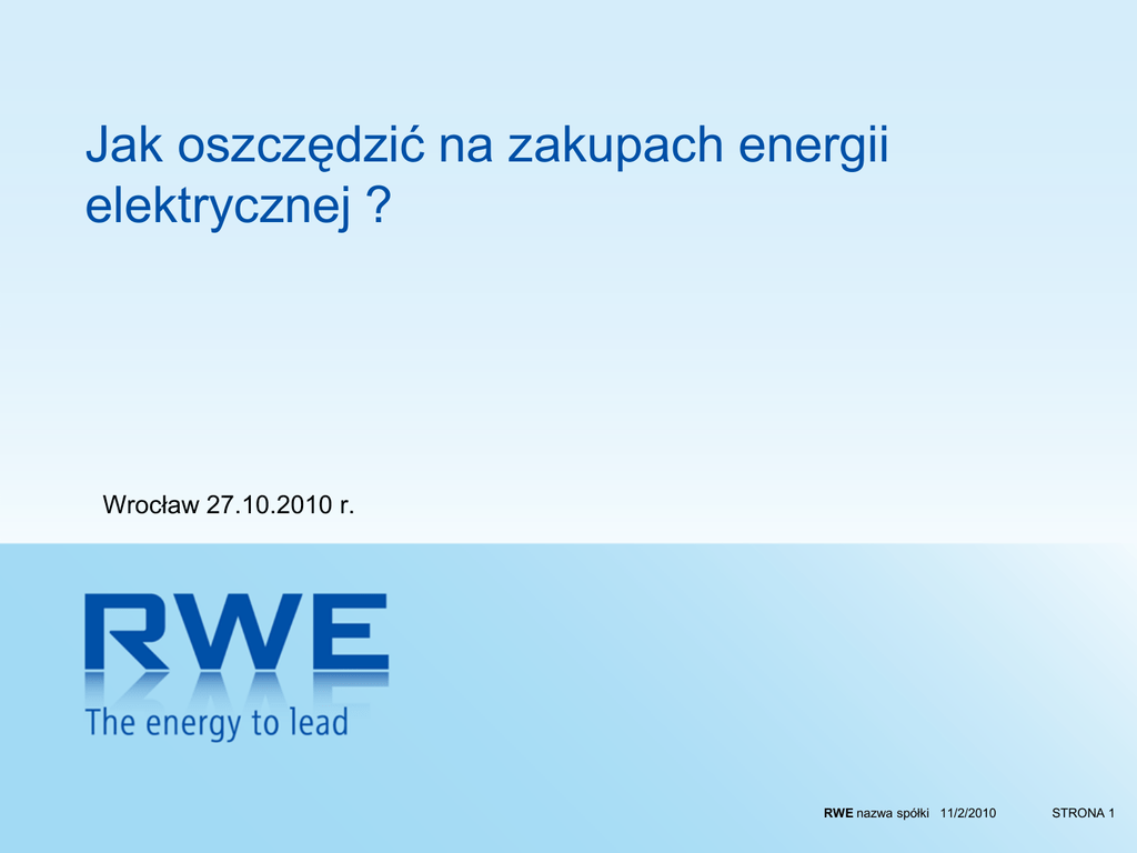 Jak oszczędzić na zakupach energii elektrycznej ? Wrocław 27.10.2010 r. RWE nazwa spółki 11/2/2010 STRONA 1 Grupa RWE: jedna z wiodących firm utilities na kontynencie europejskim* Główne rynki Grupy RWE Produkt Energia elektryczna Gaz Niemcy Nr 2 Nr 3 Wielka Brytania Nr 3 Nr 4 Holandia Nr 2 Nr 1 Rynek Wielka Brytania Polska Holandia Czechy Słowacja Luksemburg Węgry Niemcy Europa ŚródkowoWschodnia Austria en.elekt. gaz woda > Nr 1 w Czechach > Nr 3 na Słowacji > Lider na Węgrzech > Rozwój grupy w Polsce > Nr 2na Słowacji Europa Udział w rynku sprzedaży energii elektr. w % Nr 3 Nr 6 Udział w rynku sprzedaży gazu w % 34 14 > Nr 2 na Węgrzech 64 12 17 29 9 19 6 7 Niemcy UK Węgry Słowacja* Austria* Polska Niemcy * łącznie ze spółkami z mniejszościowym udziałem RWE (≥ 20%) ; sprzedaż do odbiorców końcowych 9 UK* 4 Czechy* Węgry* Holandia* Słowacja* STRONA 2 Grupa RWE w Polsce > 3 RWE funkcjonuje w Polsce od 1991 roku 3 > > 1 2 3 6 Warszawa Jest obecne we wszystkich segmentach rynku energii elektrycznej, a także na rynku gazu i usług wodociągowo-kanalizacyjnych Grupa RWE Polska (HQ) 4 7 1 RWE Polska S.A. 2 CIEPŁO RWE Stoen Operator Sp. z o.o. 3 RWE Renewables Polska Sp. z o.o. 4 EC Będzin S.A. Działalność operacyjna 6 Za wsparcie rozwoju grupy RWE w Polsce odpowiada RWE Polska Spółka Akcyjna ENERGIA ELEKTRYCZNA Inne spółki RWE (HQ) 5 GAZ 5 RWE Polska Contracting Sp. z o.o. 6 RWE Dea AG Spółka Akcyjna, Oddział w Polsce WODA 7 PWiK Sp. z o.o. w Dąbrowie Górniczej STRONA 3 Obecna sytuacja sektora energetycznego w Polsce > Rozwijająca się gospodarka – – wzrost PKB w 2009 na poziomie 1,7% (jako jedyny kraj w regionie Polska osiągnęła dodatni wzrost gospodarczy) prognozowany wzrost na poziomie wyższym w latach następnych > Rosnące zużycie energii od 3% do 5% rocznie w skali długookresowej > Przestarzałe elektrownie i niska efektywność sektora wytwarzania – 60% elektrowni w Polsce ma ponad 30 lat i powinna być gruntownie zmodernizowana lub zastąpiona nowymi mocami > Ryzyko wystąpienia deficytu mocy Pilna potrzeba dodatkowych mocy 1 tys. MW w latach 2010-2015 a długookresowo 10 tys. MW oraz inwestycji w wysokości 15-18 mld euro > Technologiczne i ekologiczne wyzwania > Znaczący wzrost cen hurtowych energii elektrycznej w 2008 oraz spadek w 2009 w wyniku światowego kryzysu (!) powrót do trendu wzrostowego w 2010 > Znaczny wzrost liczby Klientów korzystających z zakupu energii na wolnym rynku TPA – oszczędności > Czynniki wpływające na cenę: • Potrzeba inwestycji w nowe moce wytwórcze oraz w redukcję emisji gazów • Deficyt CO2 Brak jasnej sytuacji dot. Certyfikatów CO2 po roku 2012 • Wzrost cen węgla oraz spadek wydobycia • Konsolidacja państwowych spółek – obniżenie konkurencji • Rosnący popyt i zagrożenie spadkiem podaży energii • Obowiązek zwiększania udziału sprzedaży energii pochodzącej ze źródeł odnawialnych •Obowiązek sprzedaży energii poprzez giełdę – szansa na większą transparentność rynku STRONA 4 Estymacja wzrostu cen 550 474,20 485,40 483,30 zł/MWh 450 364,40 350 300,90 250 233,50 150 2006 2010 2015 2020 2025 2030 klienci instytucjonalni Żródło: PROGNOZA ZAPOTRZEBOWANIA NA PALIWA I ENERGIĘ DO 2030 ROKU, Załącznik 2. do „Polityki energetycznej Polski do 2030 roku” STRONA 5 Zarządzanie przepływem Energii Energia w systemie elektroenergetycznym Energia Wytwarzana = Energia Pobierana STRONA 6 Liberalizacja rynku energii elektrycznej do 1 lipca 2007 r. po 1 lipca 2007 r. OSD Zakład energetyczny OSD Umowa generalna Sprzedawca Umowa generalna Sprzedawca Umowa dystrybucyjna Umowa kompleksowa Klient Umowa sprzedaży Umowa kompleksowa Klient Klient STRONA 7 Liczba zmian sprzedawcy w roku 2010 7000 6122 6000 5378 Odbiorcy grup taryfowych A,B,C 4769 Liczba odbiorców TPA 5000 3914 4000 3405 2721 3000 2069 2000 2370 1537 1000 85 0 XII 2008 XII 2009 I 2010 II 2010 III 2010 IV 2010 V 2010 VI 2010 VII 2010 VIII 2010 W ciągu 8 miesięcy 2010r. Nastąpił 300% wzrost liczby zmian sprzedawców e.e!!! Żródło: Urząd Regulacji Energetyki i STRONA 8 Liczba zmian sprzedawcy w podziale na poszczególnych OSD Lp. Operator systemu dystrybucyjnego Liczba odbiorców TPA Energia dostarczona odbiorcom TPA [MWh] 2009 I-VI 2010 2009 I-VI 2010 1. PGE Dystrybucja Białystok Sp. z o.o. 604 670 44 717 101 747 2. PGE Dystrybucja Lubzel Sp. z o.o. 35 81 51 075 91 740 3. ENION SA 424 928 2 723 188 2 082 226 4. Vattenfall Distribution Poland SA 196 365 3 483 848 2 188 620 5. PGE Dystrybucja Rzeszów Sp. z o.o. 32 105 201 458 298 950 6. EnergiaPro SA 527 1253 1 711 749 1 172 224 7. PGE Dystrybucja Łódź Sp. z o.o. 34 106 37 235 140 270 8. ENERGA-Operator SA 227 609 1 833 747 1 189 212 9. PGE Dystrybucja Zamość Sp. z o.o. 32 719 173 139 110 966 42 92 423 153 283 966 239 451 509 733 1 152 028 12. PGE Dystrybucja Łódź-Teren S.A. 13. RWE Stoen Operator Sp. z o.o. 36 95 353 865 356 448 94 268 14 819 349 834 14. PGE Dystrybucja Warszawa Teren Sp. z o.o. 15. PKP Energetyka S.A. 73 172 286 852 250 430 4 18 657 10 803 2 599 5 932 11 849 237 10. PGE ZEORK Dystrybucja Sp. z o.o. 11. ENEA Operator Sp. z o.o. Razem: 9 779 464 Żródło: Urząd Regulacji Energetyki i STRONA 9 Składniki rachunku za energię elektryczną 100% 80% 60% Sprzedaż 70% RWE Polska S.A. 40% 20% Dystrybucja 30% OSD 0% Rachunek za energię elektryczną STRONA 10 Mix Energetyczny 100% 80% 60% 40% 20% 0% 2006 2010 2015 2020 2025 2030 Węgiel kamienny Węgiel brunatny Energia odnawialna Paliwo jądrowe Gaz ziemny Wodne pompownie Produkty naftowe Odpady Żródło: PROGNOZA ZAPOTRZEBOWANIA NA PALIWA I ENERGIĘ DO 2030 ROKU, Załącznik 2. do „Polityki energetycznej Polski do 2030 roku” STRONA 11 Obawy związane ze zmianą sprzedawcy energii 50% 40% 36% 33% 30% Strefa odpowiedzialności dystrybutora 18% 20% 8% 10% 6% 6% 0% bardzo trudnego procesu zmiany dodatkowych kosztów Obawa braku opłacalności zmiany brak prąd