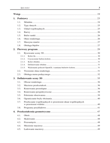 Spis treści 3 Wstęp .................................................................................................................................................................. 19 1. Podstawy .................................................................................................................................................. 23 1.1. Składnia .......................................................................................................................................... 24 1.2. Typy danych .................................................................................................................................. 25 1.3. Układ współrzędnych ................................................................................................................ 25 1.4. Barwy .............................................................................................................................................. 26 1.5. Bufor ramki ................................................................................................................................... 26 1.6. Okno renderingu .......................................................................................................................... 26 1.7. Maszyna stanów .......................................................................................................................... 27 1.8. Obsługa błędów ........................................................................................................................... 27 2. Pierwszy program .............................................................................................................................. 29 2.1. Rysowanie sceny 3D .................................................................................................................. 30 2.1.1. Kolor tła ................................................................................................................................... 30 2.1.2. Czyszczenie bufora koloru ................................................................................................... 30 2.1.3. Kolor obiektu .......................................................................................................................... 31 2.1.4. Definiowanie obiektu ............................................................................................................ 31 2.1.5. Wykonanie poleceń OpenGL i zamiana buforów koloru................................................ 31 2.2. Tworzenie okna renderingu ..................................................................................................... 31 2.3. Obsługa menu podręcznego .................................................................................................... 32 3. Definiowanie sceny 3D .................................................................................................................... 35 3.1. Obszar renderingu ....................................................................................................................... 36 3.2. Macierze przekształceń ............................................................................................................. 36 3.3. Rzutowanie prostokątne ........................................................................................................... 36 3.4. Rzutowanie perspektywiczne ................................................................................................. 38 3.5. Położenie obserwatora .............................................................................................................. 39 3.6. Ograniczanie bryły obcinania ................................................................................................. 40 3.7. Przeliczanie współrzędnych w przestrzeni oknai współrzędnych w przestrzeni widoku ................................................................................................................. 40 3.8. Programy przykładowe ............................................................................................................. 41 4. Przekształcenia geometryczne................................................................................................... 47 4.1. Obrót ................................................................................................................................................ 48 4.2. Skalowanie .................................................................................................................................... 48 4.3. Przesunięcie................................................................................................................................... 48 4.4. Mnożenie macierzy .................................................................................................................... 49 4.5. Ładowanie macierzy .................................................................................................................. 49 4 Spis treści 4.6. Składanie przekształceń............................................................................................................ 49 4.7. Stos macierzy................................................................................................................................ 50 4.8. Programy przykładowe ............................................................................................................. 50 5. Okrawanie i obcinanie .................................................................................................................... 57 5.1. Okrawanie obrazu ....................................................................................................................... 58 5.2. Płaszczyzny obcinające ............................................................................................................ 58 5.3. Program przykładowy ................................................................