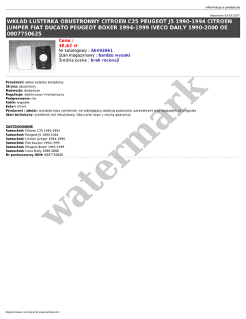 Informacje o produkcie Utworzono 03-03-2017 WKŁAD LUSTERKA OBUSTRONNY CITROEN C25 PEUGEOT J5 1990-1994 CITROEN JUMPER FIAT DUCATO PEUGEOT BOXER 1994-1999 IVECO DAILY 1990-2000 OE 0007750625 Cena : 38,62 zł Nr katalogowy : A6403961 Stan magazynowy : bardzo wysoki Średnia ocena : brak recenzji w at ZASTOSOWANIE Samochód: Citroen C25 1990-1994 Samochód: Peugeot J5 1990-1994 Samochód: Citroen Jumper 1994-1999 Samochód: Fiat Ducato 1994-1999 Samochód: Peugeot Boxer 1994-1999 Samochód: Iveco Daily 1990-2000 Nr porównawczy OEM: 0007750625 er m ar k Przedmiot: wkład lusterka kompletny Strona: obustronny Nadwozie: dostawcze Regulacja: elektryczna / mechaniczna Podgrzewanie: nie Szkło: wypukłe Kolor: chrom Producent / jakość: wysokiej klasy zamiennik, nie odbiegający jakością wykonania, parametrami oraz wyglądem od oryginału Stan techniczny: przedmiot jest nieużywany, fabrycznie nowy z roczną gwarancją Wygenerowano w programie www.oscGold.com