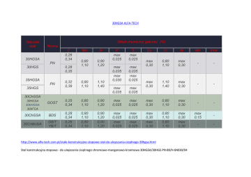 30HGSA ALFA-TECH Gatunek stali Skład chemiczny gatunku (%) Norma C 0,28 0,34 30HGSA Mn Si 0,80 1,10 0,90 1,20 0,32 0,39 0,80 1,10 1,10 1,40 0,25 0,34 0,80 1,10 0,28 0,34 0,28 0,34 0,80 1,10 0,80 1,10 PN 30HGS 0,28 0,35 35HGSA PN 35HGS P max 0,025 S max 0,025 max 0,035 max 0,030 max 0,035 max 0,025 Cu Cr Ni Mo inne max 0,30 0,80 1,10 max 0,30 - - max 0,30 1,10 1,40 max 0,30 - - - - max 0,15 - - - max 0,035 max 0,035 0,90 1,20 max 0,025 max 0,025 max 0,30 0,80 1,10 max 0,30 0,90 1,20 0,90 1,20 max 0,025 max 0,025 max 0,025 max 0,025 max 0,30 max 0,30 0,80 1,10 0,80 1,10 max 0,30 max 0,30 30ChGSA 30HGSA 30KHGSA 30ХГСА GOST 30ChGSA BDS 30CrMnSiA GB/T YB/T http://www.alfa-tech.com.pl/stale-konstrukcyjne-stopowe-stal-do-ulepszania-cieplnego-30hgsa.html Stal konstrukcyjna stopowa - do ulepszania cieplnego chromowo-manganowo-krzemowa 30HGSA/30HGS PN-89/H-84030/04 Stal do ulepszania cieplnego 35HGSA/35HGS PN-89/H-84030/04 Zastosowanie Gatunek 30HGSA ( 30HGS, 35HGSA, 35HGS ), stosuje się w budowie maszyn ciężkich i średniej wielkości na części o dużej wytrzymałości, jak: czopy, wały, wrzeciona, osie, koła zębate, rolki, pierścienie, części sprzęgła, tuleje, dźwignie, osłony, bloki maszyn, kołnierze, łopatki kompresorów tłoczone z blach, pracujące pod wielkim obciążeniem przy temperaturach do 150-200°C, a także na części konstrukcji nitowanych, a dla małych przekrojów również spawanych i następnie ulepszonych cieplnie, z tego gatunku wykonuje się również rury bezszwowe stosowane w lotnictwie, na wszelkiego rodzaju elementy konstrukcyjne. Dla małych i średnich przekrojów może zastępować stale chromowo-molibdenowe i chromowo-niklowe. Stal 30HGS stosowana w stanie ulepszonym cieplnie ma znaczną hartowność, pozwalającą na osiągnięcie najlepszych własności mechanicznych przy grubościach ok. 60 mm po hartowaniu w oleju. Stal jest skłonna do kruchości odpuszczania, ma spawalność ograniczoną, zwłaszcza przy grubszych przekrojach. W stanie ulepszonym cieplnie uzyskuje się następujące orientacyjne własności wytrzymałościowe: -grubość do 16 mm, praca łamania KU2, min 40 J, przewężanie Z min 45 %, Wydłużenie A, min 10%, Udarność KM 49 - 69 (J/cm2), Re 85-95 kG/mm2 830930 N/mm2 Rm 105-120 kG/mm2 1030-1180 N/mm2, -grubość od 16 do 40mm, praca łamania KU2, min 40 J, przewężanie Z min 45 %Wydłużenie A, min 10%, Udarność KM 49 - 69 (J/cm2), Re 75-85 kG/mm2 740-830 N/mm2 Rm 95-110 kG/mm2 930-1080 N/mm2 -grubość od 40 do 100 mm, praca łamania KU2, min 40 J, przewężanie Z min 45 %, Wydłużenie A, min 11%, Udarność KM 49 - 69 (J/cm2), Re 60-70 kG/mm2 590-690 N/mm2 Rm 85-100 kG/mm2 830-980 N/mm2 -grubość od 100 do 160 - mm, przewężanie Z min 50 %, Wydłużenie A, min 12 %, Re 50-60 kG/mm2 490-590 N/mm2 Rm 70-90 kG/mm2 690-880 N/mm2 -grubość od 160 do 250 - mm, przewężanie Z min 50 %, Wydłużenie A, min 13%, Re 50-60 kG/mm2 490-590 N/mm2 Rm 70-85 kG/mm2 690-830 N/mm2 Twardość w stanie zmiękczonym maks 229 HB Twardość w stanie ulepszonym cieplnie 295 - 360 HB Przewężenie, Z minimum 45 % Wydłużenie, A minimum 10 % Praca łamania, KU2 minimum 36 J Spawanie 30HGSA ( 30HGS, 35HGSA, 35HGS ) Stal 30HGSA (30HGS) jest stalą słabo spawalną, spawać ją można tylko w wyjątkowych przypadkach, najlepiej po wyżarzaniu zmiękczającym. Przed spawaniem stal należy nagrzać do temperatur zależnych od grubości części łączonych: -grubość do 15 mm temperatura wstępnego nagrzania 200 – 300oC -grubość od 15 do 25 mm temperatura wstępnego nagrzania 250 – 350oC -grubość od 25 do 50 mm temperatura wstępnego nagrzania powyżej 350oC Niższe temperatury można stosować przy spawaniu stali o minimalnej wartości równoważnik węgla Ce i grubościach odpowiadających dolnym granicom zakresów oraz przy dużych natężeniach prądu spawania lub przy spawaniu w osłonie CO2. Przy spawaniu dużych części na przykład z blach, zaleca się stosować międzyoperacyjne wyżarzenie odprężające. Bezpośrednio po spawaniu, a przed ostygnięciem poniżej temperatur ujętych w tablicy, zaleca się połączenie wyżarzać zmiękczająco lub ulepszać cieplnie. W razie braku możliwości przeprowadzenia obróbki cieplnej bezpośrednio po spawaniu, połączenie należy studzić do temperatury otoczenia bardzo powoli, np. razem z piecem lub po wyjęciu z pieca nakryć matami, albo też studzić w gorącym piasku. Spawać można łukowo elektrodami otulonymi lub w osłonie CO2. W przypadku spawania części ulepszonych cieplnie w strefach wpływu ciepła wystąpi obszar o własnościach wytrzymałościowych gorszych od własności stali ulepszonej cieplnie. Przywrócenie odpowiednich własności w tych strefach zależy od zastosowania właściwej obróbki cieplnej. Zgrzewanie Stal 30HGSA nadaje się do łączenia metodami zgrzewania elektrycznego, oporowego lub tarciowego. Zakres optymalnych parametrów przy zgrzewaniu oporowym jest węższy w stosunku do parametrów stosowanych przy zgrzewaniu stali niskowęglowych. Wyroby hutnicze z tego gatunku stali można zgrzewać w stanie ulepszonym cieplnie lub wyżarzonym zmiękczająco. Po zgrzewaniu i zastosowaniu odpowiedniej obróbki cieplnej własności mechaniczne zgrzeiny będą zbliżone do własności materiału zgrzewanego. Cięcie Stal 30HGS można ciąć gazowo płomieniem acetylenowo-tlenowym lub propanowo-butanowo-tlenowym albo łukowo - strumieniem plazmy. Do cięcia należy stal wstępnie podgrzać do temperatury 200-250°C. Cięte powierzchnie należy studzić w spokojnym powietrzu. W gatunku 30HGSA lub odpowiedniku (30KHGSA), dostarczamy rury bez szwu zimnociągnione, pręty walcowane okrągłe, odkuwki swobodne, pręty okrągłe, pręty kwadratowe, płaskowniki, płyty, kostki, rury stalowe bezszwowe gorącowalcowane, blachy gorącowalcowane i zimnowalcowane.