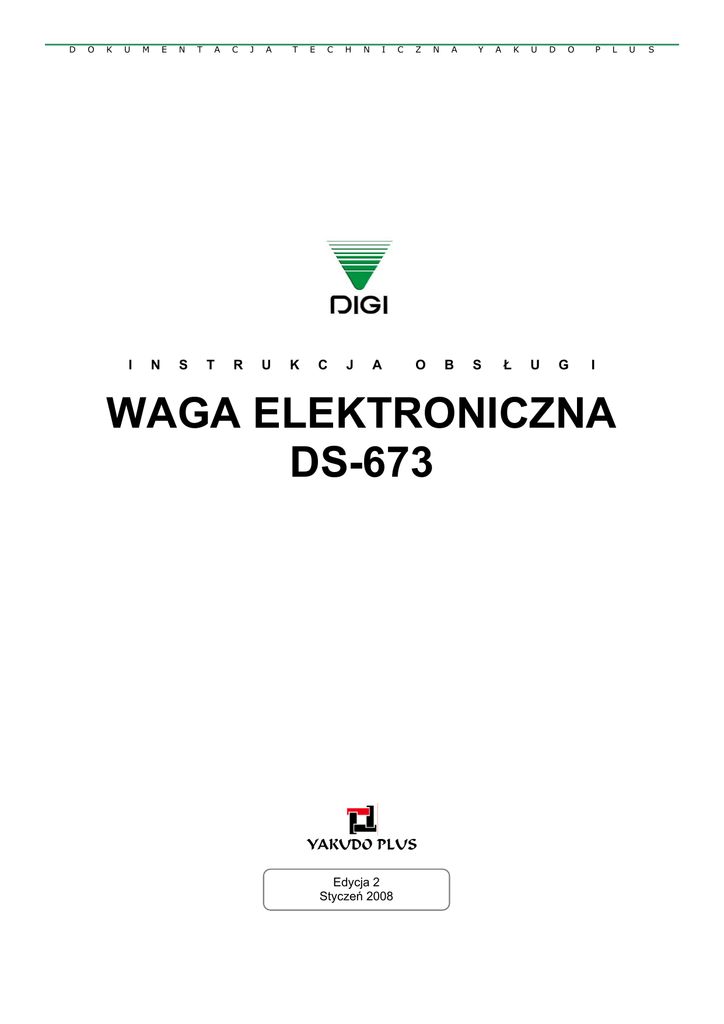 D O K U I M E N N S T A T C R J A T U K E C C H J N I A C Z O N A B Y S A K Ł U U D O G P L I WAGA ELEKTRONICZNA DS-673 YAKUDO PLUS Edycja 2 Styczeń 2008 U S INSTRUKCJA OBSŁUGI DS-673 Instrukcja wydana przez Yakudo Plus sp. z o.o. Jeśli masz jakieś uwagi lub znalazłeś w tej publikacji jakiekolwiek błędy, proszę się skontaktować z przedstawicielem DIGI. YAKUDO PLUS sp. z o.o. 43-100 Tychy ul. Nad Jeziorem 85 Tel. (32) 218-69-10 Fax.(32) 218-69-15 [email protected] Urządzenia oznakowane jest symbolem jak poniżej i jest zgodne z dyrektywą Unii Europejskiej 2002/96/EC. Jeśli urządzeni zostaje wycofane z eksploatacji i kończy się jego przydatność produkcyjna, skontaktuj się z przedstawicielem DIGI w celu bezpiecznej utylizacji, zgodnej z umową kupna i lokalnym ustawodawstwem. 2 YAKUDO PLUS DS-673 INSTRUKCJA OBSŁUGI REJESTR ZMIAN DATA NR EDYCJI 12.2007 1 Mariusz Kubera Pierwsze wydanie instrukcji obsługi. 01.2008 2 Mariusz Kubera Uzupełniono o wpis dotyczący stopnia szczelności. YAKUDO PLUS IMIĘ I NAZWISKO UWAGI 3 INSTRUKCJA OBSŁUGI DS-673 SPIS TREŚCI SPIS TREŚCI ..................................................................................................................................4 1.WPROWADZENIE .......................................................................................................................5 2. BEZPIECZEŃSTWO ...................................................................................................................5 3. WIADOMOŚCI OGÓLNE ............................................................................................................6 3.1 Parametry techniczne ..........................................................................................................6 3.2 Wymiary ................................................................................................................................7 3.3 Budowa i wygląd zewnętrzny..............................................................................................7 3.4 Wyświetlacz i klawiatura......................................................................................................8 4. UŻYTKOWANIE WAGI ...............................................................................................................9 4.1 Włączenie, wyłączenie wagi. ...............................................................................................9 4.1.1 Zasilanie z akumulatora – opcja. ................................................................................10 4.1.2 Ładowanie akumulatora..............................................................................................11 4.2 Zerowanie i sprawdzenie poprawności ważenia. ............................................................11 4.3 Tarowanie. ..........................................................................................................................12 5. SPECYFIKACJE. ......................................................................................................................12 5.1 Automatyczne wyłączanie wyświetlacza..........................................................................12 5.2 Ustawienie jasności wyświetlacza....................................................................................13 6. LEGALIZACJA WAGI...............................................................................................................13 7. KOMUNIKATY O BŁĘDACH ....................................................................................................14 DODATEK A - Wymiana akumulatora. .......................................................................................15 4 YAKUDO PLUS DS-673 INSTRUKCJA OBSŁUGI 1.WPROWADZENIE. Materiał zawarty w tym dokumencie jest prawnie zastrzeżony i nie może być zmieniony, powielany lub kopiowany w całości, lub w części bez odpowiedniej pisemnej zgody producenta. Producent nie ponosi żadnej odpowiedzialności za błędy i uszkodzenia wynikłe z nieodpowiedniej interpretacji zawartych w dokumencie procedur. Procedury obsługowe jak i właściwości i cechy urządzenia mogą się różnić w zależności od zastosowanej wersji oprogramowania. Instrukcja jest skierowana zarówno do użytkowników jak i do obsługi technicznej instalującej i obsługującej urządzenia firmy DIGI. Zapoznanie się z treścią instrukcji obsługi pomoże uniknąć wielu problemów, zwiększy wydajność produkcji oraz poprawi atrakcyjność oferowanych produktów. Obsługujący urządzenie powinien w pełni rozumieć zawarte w tej instrukcji zalecenia i procedury. 2. BEZPIECZEŃSTWO Producent firma DIGI nie bierze odpowiedzialności za jakiekolwiek uszkodzenia lub obrażenia spowodowane w wyniku zaniedbania wywołanego niedokładną znajomością instrukcji lub nieostrożnością podczas instalacji, obsługi lub naprawy urządzenia, które niniejsza instrukcja opisuje. PAMIĘTAJ • Każdy użytkownik obsługujący urządzenie powinien zapoznać się treścią instrukcji i postępować zgodnie z zawartymi w niej wskazówkami. Kadra zarządzająca zobowiązana jest do przeprowadzenia szkolenia odnośnie użytkowania urządzenia. • Nigdy nie zmieniaj kolejności czynności, których wykonanie opisuje poniższa instrukcja. • Nie zezwala się na jakiekolwiek modyfikacje urządzenia lub jego części pod groźbą utraty gwarancji • Nie obciążaj platformy ważącej masą przekraczającą maksymalne obciążenie. • Ważony produkt powinien zawsze znajdować się centralnie na platformie ważącej. Należy unikać sytuacji, gdy ważony produkt jest umiejscowiony w narożniku platformy ważącej. • Naprawy mogą być wykonywane tylko przez wykwalifikowany i przeszkolony personel techniczny. • W razie potrzeby urządzenie należy czyścić lekko wilgotną tkaniną, używając dodatkowo dostępnych na rynku nieagresywnych środków chemicznych. Nie należy stosować rozpuszczalników