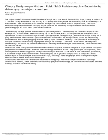 Publiczna Szkoła Podstawowa nr 19 w Kędzierzynie-Koźlu Chłopcy Drużynowym Mistrzem Polski Szkół Podstawowych w Badmintonie, dziewczyny na miejscu czwartym Autor: Krzysztof Maślanka 09.06.2015. Jak to jest zostać Mistrzem Polski? Przekonać mogli się o tym Karol Budny i Filip Prajs, którzy w dniach 57 czerwca rozegrali fantastyczny turniej w Krajowym Finale Igrzysk Badmintona Szkół Podstawowych w Białymstoku. Nasi uczniowie przez dwa dni zmagali się z mistrzami innych województw, z każdym kolejnym wygranym meczem zbliżając się do podium. W niedzielę rozegrali ostatni finałowy mecz i pewnie sięgnęli po złoto oraz tytuł Mistrzów Polski. Nasi chłopcy nie byli jednak osamotnieni w tych zmaganiach. Towarzyszyły im Dominika Gajda i Julia Prokopczuk, które również zakwalifikowały się do Mistrzostw Polski jako najlepsza para województwa opolskiego. Dziewczyny w rankingu PZBad zajmują wysoką ósmą pozycję, jednak na turnieju trafiły na 3 pary zawodniczek rozstawione z jeszcze wyższymi numerami i od początku było jasne, że najbardziej widowiskowe mecze rozegrają się właśnie między tymi czterema parami; i rzeczywiście to właśnie grze naszych uczennic towarzyszyły największe emocje na turnieju. Dominice i Julce mimo zaciętej walki i determinacji nie udało się przemóc starszych i bardziej doświadczonych przeciwniczek, co w efekcie dało im czwartą lokatę. Dominika i Julka to najlepsze badmintonistki na Opolszczyźnie, czwarte miejsce w kraju dobrze rokuje na przyszłoroczne Mistrzostwa i pozwala żywić nadzieję na medal. Karol i Filip już w tym roku sprawili, że o Dziewiętnastce zrobiło się głośno nie tylko w lokalnych mediach. Dla Karola w tym sezonie to już trzecie, a dla Filipa drugie Mistrzostwo Polski. Przypomnijmy, że w grudniu chłopcy wraz z kolegami z klubu zdobyli tytuł w Drużynowych Mistrzostwach Kraju, a w maju Karol sięgnął po złoto w Indywidualnych Mistrzostwach Polski Młodzików Młodszych. Gratulujemy zawodnikom i trenerowi wspaniałych osiągnięć. Nie można chyba oczekiwać lepszego uwieńczenia sezonu, a tak spektakularne sukcesy jedynie udowadniają, że trud włożony w często żmudne treningi przynosi wymierne efekty. http://sp19kkozle.wodip.opole.pl Kreator PDF Utworzono 3 March, 2017, 11:51
