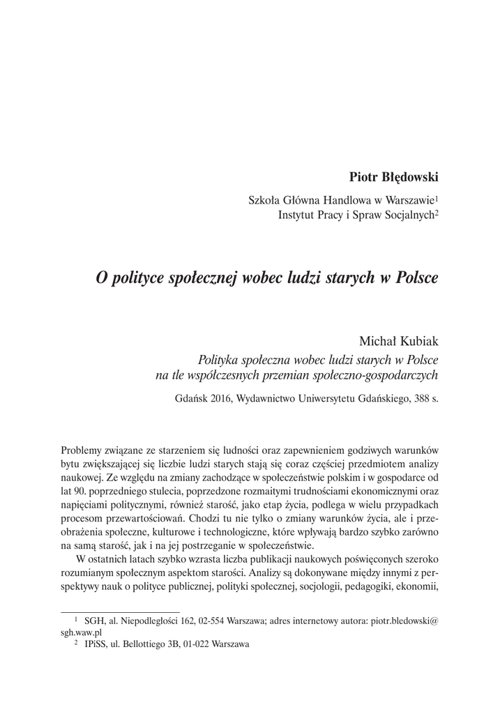 Piotr Błędowski Szkoła Główna Handlowa w Warszawie1 Instytut Pracy i Spraw Socjalnych2 O polityce społecznej wobec ludzi starych w Polsce Michał Kubiak Polityka społeczna wobec ludzi starych w Polsce na tle współczesnych przemian społeczno-gospodarczych Gdańsk 2016, Wydawnictwo Uniwersytetu Gdańskiego, 388 s. Problemy związane ze starzeniem się ludności oraz zapewnieniem godziwych warunków bytu zwiększającej się liczbie ludzi starych stają się coraz częściej przedmiotem analizy naukowej. Ze względu na zmiany zachodzące w społeczeństwie polskim i w gospodarce od lat 90. poprzedniego stulecia, poprzedzone rozmaitymi trudnościami ekonomicznymi oraz napięciami politycznymi, również starość, jako etap życia, podlega w wielu przypadkach procesom przewartościowań. Chodzi tu nie tylko o zmiany warunków życia, ale i przeobrażenia społeczne, kulturowe i technologiczne, które wpływają bardzo szybko zarówno na samą starość, jak i na jej postrzeganie w społeczeństwie. W ostatnich latach szybko wzrasta liczba publikacji naukowych poświęconych szeroko rozumianym społecznym aspektom starości. Analizy są dokonywane między innymi z perspektywy nauk o polityce publicznej, polityki społecznej, socjologii, pedagogiki, ekonomii, 1 SGH, al. Niepodległości 162, 02-554 Warszawa; adres internetowy autora: piotr.bledowski@ sgh.waw.pl 2 IPiSS, ul. Bellottiego 3B, 01-022 Warszawa 112 Recenzje a nawet zarządzania. Nieunikniona, podobnie jak w innych obszarach nauki, specjalizacja sprawia, że coraz trudniej o uzyskanie kompletnego obrazu badanego zjawiska czy procesu. Tak jest również ze starością i starzeniem się. Tym większe zainteresowanie budzą publikacje dokonujące całościowego przeglądu badanej problematyki. Taki charakter ma książka Michała Kubiaka, poświęcona ocenie polityki społecznej wobec ludzi starych w Polsce w zmieniających się warunkach społeczno-ekonomicznych. Autor, absolwent studiów politologicznych i organizacji pomocy społecznej, postawił sobie za cel ustalenie, w jaki sposób kształtowała się polityka społeczna wobec ludzi starych od początku okresu transformacji ustrojowej i ekonomicznej. Analiza kończy się na roku 2010, choć w pracy znajdują się liczne fragmenty ukazujące zmiany, jakie dokonywały się w kolejnych latach. Myślę, że z korzyścią dla książki byłoby doprowadzenie analizy przynajmniej do roku 2012, kiedy rozpoczęły się zmiany o charakterze instytucjonalnym i został wprowadzony w życie Rządowy Program na rzecz Aktywności Osób Starszych. Autor wspomina wprawdzie o tym w Zakończeniu, ale pełniejsze uwzględnienie w analizie działań z lat 2012 i 2013 w istotny sposób wzbogaciłoby zaprezentowaną pracę. Okres ponad pięciu lat, jaki upłynął od roku 2010, był na tyle bogaty w wydarzenia dotyczące polityki społecznej wobec osób starszych (i w ogóle polityki wobec osób starszych, nawet tej bez przymiotników), że warto byłoby poświęcić mu więcej miejsca. Mimo to trzeba podkreślić, że autor przygotował bardzo starannie monografię, w której zawarł wszystkie ważniejsze wydarzenia z obszaru polityki społecznej wobec osób starszych oraz trafnie scharakteryzował warunki, w jakich ta polityka była realizowana. Uprzedzając końcową ocenę, już teraz chcę stwierdzić, że z tą publikacją powinni zapoznać się wszyscy, których interesuje podejście administracji publicznej, a zwłaszcza państwowej, do kształtowania sytuacji bytowej ludzi starych. Publikacja jest bardzo obszerna, chociaż składa się tylko z czterech rozdziałów. Każdy z nich jest poświęcony odrębnemu kompleksowi zagadnień. W pierwszym został omówiony dorobek naukowy badań nad starością i procesem starzenia się. Obok streszczenia dyskusji nad definicjami starości i sposobami jej rozumienia pojawiają się tu jednak informacje świadczące wprawdzie o erudycji autora, ale raczej zbyteczne z punktu widzenia celu pracy; mam tu na myśli na przykład przegląd stanowisk w sprawie progów starości. Równie erudycyjny charakter ma kolejna część tego rozdziału, zawierająca krótką charakterystykę teorii starzenia się. Ponieważ ten wątek nie jest wykorzystany w dalszej części pracy, można go było raczej pominąć, tym bardziej że podobne opisy można znaleźć także w innych publikacjach. W kolejnym fragmencie tego rozdziału autor trafnie opisuje zmiany w strukturze demograficznej ludności Polski, zwracając uwagę na przeobrażenia w populacji ludzi starych i towarzyszące im konsekwencje dla społeczeństwa. Dokonana prezentacja problematyki starości i wpływu procesu demograficznego starzenia się na funkcjonowanie społeczeństwa została uzupełniona o kluczowy z punktu widzenia celu pracy rozdział, w którym M. Kubiak opisał zmiany w polityce społecznej w okresie transformacji systemowej. Zmian tych było tak wiele, a ich konsekwencje okazały się na tyle poważne, wieloaspektowe i trwałe, że zapewne każdy czytelnik będzie mógł uznać, iż zabrakło mu omówienia jakiegoś elementu procesu transformacji. Nie Recenzje 113 czyniłbym autorowi z tego powodu zarzutu, bowiem nie jest to książka o transformacji, ale o polityce wobec ludzi starych, realizowanej między innymi w tym okresie. Moje uznanie budzi natomiast fakt, że transformacja została dobrze scharakteryzowana i autor uwzględnił wszystkie najważniejsze jej aspekty, wpływające na politykę adresowaną do seniorów. Analizując oddziaływanie transformacji na tę politykę, autor chyba najczęściej odwołuje się do socjologów, znacznie rzadziej do ekonomistów i polityków społecznych, ale dzięki temu łatwiej jest przypomnieć sobie (a młodszym czytelnikom — zrozumieć) źródła i specyfikę transformacji w Polsce oraz jej konsekwencje dla warunków i poziomu życia społeczeństwa. Autor słusznie podkreśla, że populacja ludzi starych była szczególnie chroniona i 