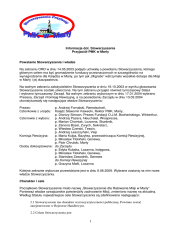 Informacja dot. Stowarzyszenia Przyjaciół PMK w Marly Powstanie Stowarzyszenia i władze Na zebraniu ORD w dniu 14.05.2003 podjęto uchwałę o powołaniu Stowarzyszenia, którego głównym celem ma być gromadzenie funduszy przeznaczonych w szczególności na wynagrodzenie dla Księdza w Marly, po tym jak „Migratio” wstrzymało wszelkie dotacje dla Misji w Marly i jej duszpasterza. Na walnym zebraniu założycielskim Stowarzyszenia w dniu 19.10.2003 w wyniku głosowania Stowarzyszenie zostało utworzone. Na tym zebraniu przyjęto również tymczasowy Statut i wybrano tymczasowy Zarząd. Na walnym zebraniu wyborczym w dniu 17.01.2004 wybrano Prezesa, Zarząd i Komisję Rewizyjną, a na posiedzeniu Zarządu w dniu 13.03.2004 ukonstytuowały się następujące władze Stowarzyszenia: Prezes: Członkowie z urzędu: p. Andrzej Fornalski, Remetschwil, Ksiądz Sławomir Kawecki, Rektor PMK, Marly, p. Dionizy Simson, Prezes Fundacji O.J.M. Bocheńskiego, Winterthur, Czlonowie z wyboru: p. Andrzej Pazera, Neuchatel, Wiceprezes, p. Marian Chomiak, Lozanna, Skarbnik, p. Zenona Bossi, Zurych, Sekretarz, p. Wiesław Czerski, Tessin, p. Andrzej Leszczyński, Visp Komisja Rewizyjna: p. Maria Kulpa, Bazylea, przewodnicząca Komisji Rewizyjnej, p. Mirosław Tłokiński, Genewa, p. Piotr Chrulski, Marly Osoby dokooptowane: do Zarządu p. Edyta Kubska, Lozanna, księgowa, p. Mirosław Tłokiński, Genewa, p. Stanisław Zawodnik, Genewa do Komisji Rewizyjnej p. Grazyna Mafli, Lozanna Kolejne zebranie wyborcze przewidziane jest w dniu 6.06.2009. Wybrane zostaną na nim nowe władze Stowarzyszenia. Charakter i cele Początkowo Stowarzyszenie miało nazwę „Stowarzyszenie dla Ratowania Misji w Marly”. Ponieważ władze szwajcarskie potwierdziły zachowanie Misji, zmieniono nazwę na aktualną. Według Statutu najważniejsze cele Stowarzyszenia są zdefiniowane następująco: 2.1 Stowarzyszenie ma charakter wyższej użyteczności publicznej. Powinno zostać zarejestrowane w Rejestrze Handlowym. 2.2 Celem Stowarzyszenia jest: 1 2.2.1 Zachowanie dziedzictwa po pokoleniach Polaków zamieszkujących w Szwajcarii, którzy zorganizowali, wybudowali i utrzymywali polski ośrodek duszpasterski w Marly, będący własnością „Fundacji O.J.M. Bocheńskiego na rzecz Katolickiego Domu Polskiego w Marly”. 2.2.2 Zbieranie funduszy na uzupełnienie pokrycia kosztów związanych z utrzymaniem PMK w Marly, oraz na wynagrodzenie przydzielonego do niej duszpasterza wraz z obowiązkowymi świadczeniami socjalnymi (ubezpieczenie i renta). Członkostwo Według Statutu: 3.2. Członkowie Stowarzyszenia dzielą się na: 3.2.1 członków zwyczajnych, 3.2.2 członków wspierających, 3.3.3 członków honorowych. Członkowie zwyczajni wypełniają deklarcję o przystąpieniu do Stowarzyszenia i płacą składki roczne (50 CHF). Mają oni bierne (mogą być wybrani) i czynne (wybierają) prawo wyborcze. Członkowie wspierający nie wypełniają deklaracji, ale wpłacają dowolną kwotę (min. 50 CHF) na cele Stowarzyszenia. Posiadają czynne prawo wyborcze (mogą wybierać). Członkowie honorowi to osoby szczególnie zasłużone dla Stowarzyszenia. Są zwolnieni z obowiązku płacenia składek. Posiadają czynne i bierne prawo wyborcze (mogą wybierać i mogą być wybierani) Zasady ogólne W Szwajcarii jest aktualnie jedno duszpasterstwo polskie, działa jedna Polska Misja Katolicka, na czele której stoi jeden Rektor. Podział na Misje w Marly i Zurychu nie istnieje. Polska Misja Katolicka w Szwajcarii skupia 20 różnych ośrodków duszpasterskich, w tym również w Marly i Zurychu. Nowa struktura i związana z nią nomenklatura powinny być uznane i przejęte przez wszystkie agendy Misji i organizacje z nią zwiazane, w tym również przez nasze Stowarzyszenie. W wyniku usilnych starań władze szwajcarskie przydzieliły księdzu Rektorowi do pomocy księdza pomocniczego studenta, któremu ufundowano stypendium doktoranckie, ale który musi być dodatkowo dofinansowany przez nasze Stowarzyszenie i Fundację im. o.J.M. Bocheńskiego. Duszpasterzem pomocniczym został ksiądz prałat Krzysztof Zadarko, któremu Rektor powierzył samodzielne prowadzenie ośrodków duszpasterskich w Zurychu i okolicach. Oczywiście jest to przysłowiowa kropla w morzu potrzeb. Obsługa wszystkich ośrodków duszpasterskich, w których regularnie odprawiane są Msze Święte w języku polskim przez wymienionych wyżej dwóch księży byłaby praktycznie niemożliwa. Na szczęście są polscy księża studiujący na uniwersytecie we Fryburgu. I chociaż nie są oni formalnie zwiazani z Misją, to udało się ks. Rektorowi pozyskać ich do pomocy w prowadzeniu duszpasterstwa polskiego. Księża ci mają zapewniony pobyt i utrzymanie w Szwajcarii w ramach stypendiów doktoranckich ufundowanych przez uniwersytet we Fryburgu. Ich dzialalność na rzecz Misji wymaga jednak znalezienia dodatkowych środków finansowych. Stąd powstała koncepcja utworzenia tzw. funduszu stypendialnego na rzecz pomocy finansowej dla księży studentów oraz księży pomocniczych przebywąjących czasowo w Misji, którzy pomagają ks. Rektorowi w prowadzeniu duszpasterstwa. 2 Status prawny Decyzją władz kantonalnych Stowarzyszenie posiada osobowość prawną, z wpisem do rejestru handlowego. Oznacza to formalną rejestrację Stowarzyszenia, co daje ochronę prawną, stawiając jednocześnie określone wymogi. Na mocy decyzji kantonalnych władz fiskalnych przyznano Stowarzyszeniu w listopadzie 2006 status użyteczności publicznej. Daje to ofiarodawcom możliwość odpisania od dochodów w deklaracji podatkowej kwot wpłacanych na cele Stowarzyszenia, co skutkuje odpowiednim zmniejszeniem podatku. Członkowie i świadczenia Stowarzyszenia Stowarzyszenie liczy w tej chwili prawie dwustu członków. Wśród nich są ofiarodawcy wspierający polską Misję regularnie lub wyjątkowo znaczącymi kwotami. Na Walnym Zgromadzeniu Stowarzyszenia 21 czerwca 2008 roku ci ost