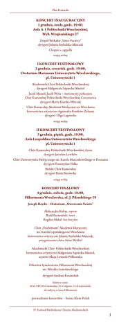 Plan Festiwalu KONCERT INAUGURACYJNY 1 grudnia, środa, godz. 19:00, Aula A-1 Politechniki Wrocławskiej, Wyb. Wyspiańskiego 27 Zespół Wokalny „Voice Factory” dyrygent Jolanta Szybalska-Matczak Chopin a cappella wstęp wolny I KONCERT FESTIWALOWY 2 grudnia, czwartek, godz. 19:00, Oratorium Marianum Uniwersytetu Wrocławskiego, pl. Uniwersytecki 1 Akademicki Chór Politechniki Wrocławskiej dyrygent Małgorzata Sapiecha-Muzioł Jacek Muzioł, Jacek Wota – instrumenty perkusyjne Chór Kameralny Politechniki Wrocławskiej Consonanza dyrygent Marta Kierska-Witczak Chór Kameralny Akademii Medycznej we Wrocławiu kierownictwo artystyczne Agnieszka Franków-Żelazny dyrygent Olga Łagowska wstęp wolny II KONCERT FESTIWALOWY 3 grudnia, piątek, godz. 19:00, Aula Leopoldina Uniwersytetu Wrocławskiego pl. Uniwersytecki 1 Chór Kameralny Politechniki Wrocławskiej Axion dyrygent Jarosław Lewków Chór Uniwersytetu Medycznego im. Karola Marcinkowskiego w Poznaniu dyrygent Przemysław Pałka Bielski Chór Kameralny dyrygent Beata Borowska wstęp wolny KONCERT FINAŁOWY 4 grudnia, sobota, godz. 18:00, Filharmonia Wrocławska, ul. J. Piłsudskiego 19 Joseph Haydn – Oratorium „Stworzenie Świata” Aleksandra Kubas sopran Rafał Bartmiński tenor Bogdan Makal bas-baryton Chór „Feichtinum” Akademii Muzycznej im. Karola Lipińskiego we Wrocławiu kierownictwo artystyczne Jolanta Szybalska-Matczak, przygotowanie chóru Artur Wróbel Akademicki Chór Politechniki Wrocławskiej kierownictwo artystyczne Małgorzata Sapiecha-Muzioł, asystent Alicja Leśniok-Wiłkowska Orkiestra Symfoniczna Filharmonii Wrocławskiej im. Witolda Lutosławskiego dyrygent Andrzej Kosendiak bilety w cenie: 60 zł VIP, 40 zł normalne, 25 zł ulgowe, 15 zł wejściówki, do nabycia w kasie Filharmonii prowadzenie koncertów – Iwona Klein-Polak 37. Festiwal Barbórkowy Chórów Akademickich 1 Zespół wokalny Voice Factory Dyrygent: Jolanta Szybalska-Matczak ZESPÓŁ WOKALNY „VOICE FACTORY” to grupa 12 osób składająca się w większości ze studentów różnych wydziałów Akademii Muzycznej im. Karola Lipińskiego we Wrocławiu. Działa od września 2009 roku i pracuje pod kierunkiem Jolanty Szybalskiej-Matczak – doktora habilitowanego wrocławskiej Akademii Muzycznej. Opiekę artystyczną nad zespołem sprawują: Waldemar Parzyński – prezes i Piotr Śmiejczak – dyrektor generalny spółki Voice Factory S.C. W chwili obecnej „VOICE FACTORY” zajmuje się twórczością Fryderyka Chopina, wykonując ją w formie a cappella w unikatowych aranżacjach Waldemara Parzyńskiego – kompozytora i wieloletniego wokalisty legendarnego zespołu „NOVI SINGERS”. Mimo krótkiego stażu pracy „VOICE FACTORY” może poszczycić się licznymi koncertami i entuzjastycznym przyjęciem wielu słuchaczy w kraju i za granicą. Uczestniczył m. in. w 36. Międzynarodowym Festiwalu Barbórkowym Chórów Akademickich we Wrocławiu, 65 Międzynarodowym Festiwalu Chopinowskim w Dusznikach Zdroju oraz w Międzynarodowych 33. Bydgoskich Impresjach Muzycznych, na których otrzymał prestiżową nagrodę Ministra Kultury i Dziedzictwa Narodowego. W lipcu, w czasie koncertu w Sali „Matecznik” w Otrębusach zespół nagrał swoją pierwszą płytę Voice Factory sings Chopin a cappella. W sierpniu, wspólnie z gwiazdami światowej sceny jazzowej – Urszulą Dudziak, Włodkiem Pawlikiem i Agą Zaryan oraz tancerzami American Ballet Theatre, Ballet Arizona, Ballet Noir – New York City, Kieleckiego Teatru Tańca, Polskiego Baletu Narodowego i Teatru Wielkiego w Łodzi, nagrali dla TVP 2 widowisko taneczno-muzyczne „Chopin 4”. Jesienią artyści prezentowali się m.in. podczas uroczystej inauguracji Dolnośląskiego Festiwalu Nauki we Wrocławiu, w Muzeum Narodowym w Warszawie, Filharmonii Dolnośląskiej w Jeleniej Górze m. in. z Anną Serafińską i Zbigniewem Namysłowskim. Ogromnym wyróżnieniem dla zespołu był występ 25 listopada 2010 roku w warszawskim Belwederze. Dalsze plany artystyczne „VOICE FACTORY” związane są z występami w polskich filharmoniach i teatrach, a także z koncertami w Europie oraz Japonii i Chinach. Zespół wokalny „VOICE FACTORY” Soprany: Beata Krzenciessa, Diana Pradela Mezzosoprany: Ewa Grzela, Liliana Jędrzejczak Alty: Barbara Gęca, Anna Szul-Boduch Kontralty: Aleksandra Ejsmont, Jadwiga Leśniak Tenory: Wojciech Bergander, Piotr Maciaszek Basy: Mateusz Boduch, Krzysztof Odoj Jolanta Szybalska-Matczak – Absolwentka Wydziału Wychowania Muzycznego Akademii Muzycznej im. Karola Lipińskiego we Wrocławiu w klasie dyrygowania prof. Zofii Urbanyi-Krasnodębskiej. Ukończyła z wyróżnieniem Podyplomowe Studia Chórmistrzowskie w Bydgoszczy. Od 1991 roku zatrudniona jest w macierzystej uczelni, gdzie m.in. kształci studentów w zakresie dyrygowania oraz jest kierownikiem artystycznym Chóru „Feichtinum”. W roku 2006 uzyskała stopień doktora habilitowanego w dyscyplinie artystycznej dyrygentura, a od września 2008 roku pełni funkcję prodziekana Wydziału Edukacji Muzycznej. Ważnym momentem w jej działalności było założenie w 2000 roku Chóru Kameralnego „Senza Rigore” Akademii Muzycznej we Wrocławiu. Jako kierownik artystyczny i dyrygent z zespołem tym koncertuje w kraju i za granicą, biorąc udział w wielu ważnych wydarzeniach muzycznych, festiwalach, konkursach chóralnych, na których zdobywa liczne nagrody i wyróżnienia specjalne. W październiku 2009 roku rozpoczęła pracę z Zespołem Wokalnym „Voice Factory”, realizując program „Chopin a cappella”, który z powodzeniem prezentuje w kraju i za granicą. Jest także wykładowcą na studiach podyplomowych działających przy Akademii Sztuk Pięknych we Wrocławiu, na warsztatach w ram ach ogólnopolskiego programu rozwoju chórów szkolnych „Śpiewająca Polska”. Bierze udział w pracach jury ogólnopolskich przeglądów i konkursów chóralnych. Otrzymała m.in. wyró