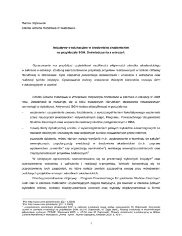 Marcin Dąbrowski Szkoła Główna Handlowa w Warszawie Inicjatywy e-edukacyjne w środowisku akademickim na przykładzie SGH. Doświadczenia z wdrożeń. Opracowanie ma przybliżyć czytelnikowi możliwości aktywności ośrodka akademickiego w zakresie e-edukacji. Zostaną zaprezentowane przykłady projektów realizowanych w Szkole Głównej Handlowej w Warszawie. Opis uzupełnia prezentacja doświadczeń i wniosków z wdrażania oraz realizacji tychże inicjatyw. Opracowanie kończy wskazanie dalszych kierunków rozwoju form e-edukacyjnych w uczelni. Szkoła Główna Handlowa w Warszawie rozpoczęła działalność w zakresie e-edukacji w 2001 roku. Działalność ta rozwinęła się w kilku kluczowych kierunkach stosowania nowoczesnych technologii w dydaktyce. Aktywność SGH można sklasyfikować w podziale na: − wspieranie i uzupełnianie procesu kształcenia, z wyszczególnieniem fakultatywnego wspierania przez nauczycieli akademickich indywidualnych zajęć, Programu Powszechnego Uzupełniania Studiów Zaocznych oraz wspierania realizacji studiów podyplomowych i MBA; − rozwój oferty dydaktycznej uczelni, z wyszczególnieniem pełnych wykładów e-learningowych na studiach dziennych i zaocznych oraz odpłatnych kursów prowadzonych przez internet; − pozostałe działania, wśród których należy wyróżnić m.in. zastosowanie e-learningu do szkoleń wewnętrznych, popularyzację e-edukacji w środowisku akademickim (m.in. poprzez wydawnictwo „e-mentor” czy organizację seminariów1), realizację wewnątrzuczelnianych oraz międzynarodowych projektów badawczych2. W niniejszym opracowaniu skoncentrowano się na prezentacji wybranych inicjatyw3 oraz przedstawieniu wniosków z wdrażania i realizacji e-projektów. Wnioski koncentrują się na przedstawieniu tych zagadnień, na które należy zwrócić szczególną uwagę przy wdrożeniach podobnych projektów w innych ośrodkach akademickich. Poniżej prezentowane inicjatywy − Program Powszechnego Uzupełniania Studiów Zaocznych SGH (tak w zakresie materiałów uzupełniających zajęcia tradycyjne, jak również w zakresie pełnych wykładów online), wykłady międzyuczelniane (econet) oraz wykłady międzynarodowe w formie 1 Por. http://www.cren.pl/seminaria/, [02.11.2005]. Por. http://www.cren.pl/badania/, [02.11.2005]. 3 Uzupełnieniem prezentacji działalności SGH w zakresie e-edukacji mogą służyć opracowania: M. Dąbrowski, Aktywność uczelni w zakresie e-edukacji na przykładzie SGH, [w:] M. Dąbrowski, M. Zając (red.), Rozwój e-edukacji w ekonomicznym szkolnictwie wyższym, FPAKE, Warszawa 2005, s. 47-54 oraz M. Dąbrowski, Rozwój działalności e-edukacyjnej w Szkole Głównej Handlowej w Warszawie, „Firma i rynek”, Numer Specjalny, kwiecień 2005, s. 49-51. 2 1 e-learningowej są prowadzone na trzech, autorskich platformach e-learingowych4, spełniających międzynarodowe standardy. Materiały dydaktyczne, w ramach tychże projektów, tworzone są według ściśle określonych standardów metodycznych5, a wirtualne zajęcia prowadzone według zasad6 i scenariuszy pozwalających na efektywną pracę online. Zastosowane narzędzia w autorskich systemach e-learningowych pozwalają na pełne wykorzystanie form interaktywnych oraz interakcji pomiędzy studentami i prowadzącym. Program Powszechnego Uzupełniania Studiów Zaocznych SGH Na obecnym etapie rozwoju e-edukacji w SGH najistotniejszym projektem jest Program Powszechnego Uzupełniania Studiów Zaocznych (PPUSZ). Pierwsze wirtualne zajęcia w ramach tego programu zostały uruchomione na początku roku akademickiego 2004/2005. Założenia i realizacja Programu Program przewiduje, iż w ciągu 3 lat studia zaoczne zostaną wzbogacone zajęciami realizowanymi przez internet w łącznym wymiarze nawet do 2200 godzin (w tym ponad 660 godzin to języki obce), z czego student na danym kierunku będzie realizował do 1500 godzin (w tym ponad 660 godzin to języki obce)7. Warto podkreślić, iż są to zajęcia dodatkowe, niezastępujące obecnie realizowanych tradycyjnych zajęć. Projekt zakłada programowe i godzinowe zrównanie toku kształcenia na studiach zaocznych z tokiem studiów dziennych. Składa się on z trzech elementów: uzupełniania przedmiotów podstawowych, uzupełniania przedmiotów kierunkowych oraz budowy pełnych przedmiotów prowadzonych przez internet. Powyżej prezentowane wymiary godzinowe zajęć planowanych do realizacji przez internet zakładają uzupełnienie wszystkich przedmiotów podstawowych i kierunkowych. W pierwszej fazie przygotowywane są materiały uzupełniające przedmioty podstawowe. Po określeniu różnic programowych i godzinowych, a także formy i zakresu materiału online, zespoły nauczycieli budują internetowe treści dydaktyczne. Następnie powoływane są zespoły prowadzące zajęcia online lub też opiekujące się kursem. Na tym etapie wdrażania projektu możliwy jest różny charakter wirtualnych zajęć – od opieki nad forum, poprzez formy stymulowania studentów, do aktywności online, po pełnowartościowe modele pracy grupowej i nauki w czasie wirtualnych zajęć. Ta część projektu, zawierająca treści dla 20 przedmiotów podstawowych, realizowana jest etapowo i łącznie powinna obejmować program odpowiadający ponad 1200 godzinom realizowanym w sposób tradycyjny (z czego ponad 660 godzin to języki obce). Już w czasie pierwszego roku trwania projektu przygotowano i udostępniono szereg materiałów uzupełniających przedmioty podstawowe. Na początku roku akademickiego 2005/2006 oferta powiększyła się o kolejne materiały, co w sumie umożliwia uzupełnianie zajęć drogą e-learningową dla następujących przedmiotów: j. angielski 4 Trzy platformy to: www.e-sgh.pl; www.e-sgh.com (anglojęzyczna); www.econet.pl. M. Dąbrowski, Przewodnik tworzenia materiałów dydaktycznych oraz prowadzenia zajęć online w Szkole Głównej Handlowej w Warszawie, wyd. II, kwiecień 2005, C