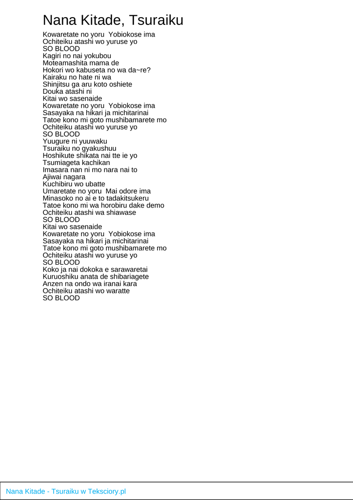 Nana Kitade, Tsuraiku Kowaretate no yoru Yobiokose ima Ochiteiku atashi wo yuruse yo SO BLOOD Kagiri no nai yokubou Moteamashita mama de Hokori wo kabuseta no wa da~re? Kairaku no hate ni wa Shinjitsu ga aru koto oshiete Douka atashi ni Kitai wo sasenaide Kowaretate no yoru Yobiokose ima Sasayaka na hikari ja michitarinai Tatoe kono mi goto mushibamarete mo Ochiteiku atashi wo yuruse yo SO BLOOD Yuugure ni yuuwaku Tsuraiku no gyakushuu Hoshikute shikata nai tte ie yo Tsumiageta kachikan Imasara nan ni mo nara nai to Ajiwai nagara Kuchibiru wo ubatte Umaretate no yoru Mai odore ima Minasoko no ai e to tadakitsukeru Tatoe kono mi wa horobiru dake demo Ochiteiku atashi wa shiawase SO BLOOD Kitai wo sasenaide Kowaretate no yoru Yobiokose ima Sasayaka na hikari ja michitarinai Tatoe kono mi goto mushibamarete mo Ochiteiku atashi wo yuruse yo SO BLOOD Koko ja nai dokoka e sarawaretai Kuruoshiku anata de shibariagete Anzen na ondo wa iranai kara Ochiteiku atashi wo waratte SO BLOOD Nana Kitade - Tsuraiku w Teksciory.pl