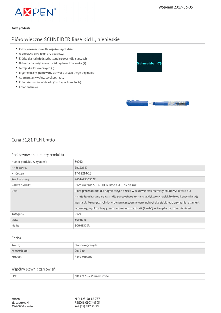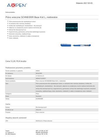 Wołomin 2017-03-03 Karta produktu: Pióro wieczne SCHNEIDER Base Kid L, niebieskie Pióro przeznaczone dla najmłodszych dzieci W zestawie dwa rozmiary obudowy: Krótka dla najmłodszych, standardowa - dla starszych Odporna na zwiększony nacisk irydowa końcówka (A) Wersja dla leworęcznych (L) Ergonomiczny, gumowany uchwyt dla stabilnego trzymania Atrament zmywalny, szybkoschnący Kolor atramentu: niebieski (1 nabój w komplecie) Kolor niebieski Cena 51,81 PLN brutto Podstawowe parametry produktu Numer produktu w systemie 30042 Nr dostawcy SR162983 Nr Celcen 17-02214-13 Kod kreskowy 4004675105837 Nazwa produktu Pióro wieczne SCHNEIDER Base Kid L, niebieskie Opis Pióro przeznaczone dla najmłodszych dzieci; w zestawie dwa rozmiary obudowy:; krótka dla najmłodszych, standardowa - dla starszych; odporna na zwiększony nacisk irydowa końcówka (A); wersja dla leworęcznych (L); ergonomiczny, gumowany uchwyt dla stabilnego trzymania; atrament zmywalny, szybkoschnący; kolor atramentu: niebieski (1 nabój w komplecie); kolor niebieski Kategoria Pióra Klasa Standard Marka SCHNEIDER Cecha Rodzaj Dla leworęcznych W ofercie od 2016-04 Produkt Pióro wieczne Wspólny słownik zamówień CPV 30192122-2 Pióra wieczne Axpen ul. Laskowa 4 05-200 Wołomin NIP: 125-00-16-787 REGON: 010346305 +48 (22) 787 55 99 Wołomin 2017-03-03 Karta katalogowa produktu cd. Pióro wieczne SCHNEIDER Base Kid L, niebieskie Certyfikaty Nowy produkt w ofercie Standard Hit Standard Kolor Kolor Niebieski Serdecznie zapraszamy do współpracy Axpen zespół. Axpen ul. Laskowa 4 05-200 Wołomin NIP: 125-00-16-787 REGON: 010346305 +48 (22) 787 55 99