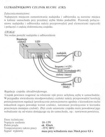ULTRADŹWIĘKOWY CZUJNIK RUCHU (CR2) Zalecenia montażowe: Najlepszym miejscem zamontowania nadajnika i odbiornika są narożne miejsca w kabinie samochodu przy przedniej szybie blisko podsufitki. Przewody połączeniowe nadajnika i odbiornika należy przeprowadzić pod elementami tapicerki i połączyć z częścią elektroniczną czujnika. UWAGA! Nie wolno pomylić nadajnika z odbiornikiem Regulacja czujnika ultradźwiękowego. Czujnik powinien reagować na włożenie ręki przez uchyloną szybę w samochodzie. W przypadku stwierdzenia nieodpowiedniej czułości należy przeprowadzić korekcję potencjometrem regulacji (przekręcenie potencjometru zgodnie z kierunkiem ruchu wskazówek zegara powoduje wzrost czułości, natomiast przekręcenie w kierunku przeciwnym zmniejsza czułość). Zbyt czułe ustawienie czujnika może powodować jego wzbudzanie się od wiatru dostającego się do samochodu, np.: nawiewem powietrza. Dane techniczne: Napięcie zasilania Pobór prądu Temperaturowy zakres pracy Sygnał wyjściowy 10-15V ok. lOmA -35°C 80°C masa przy wzbudzeniu max 30mA przez 0,8 s
