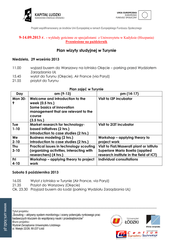 Projekt współfinansowany ze środków Unii Europejskiej w ramach Europejskiego Funduszu Społecznego 9-14.09.2013 r. - wykłady gościnne ze specjalistami z Uniwersytetu w Kadyksie (Hiszpania) Przeniesione na październik Plan wizyty studyjnej w Turynie Niedziela, 29 września 2013 11.00 15.45 21.55 Day Mon 309 Tue 1-10 We 2-10 Thu 3-10 Fri 4-10 wyjazd busem do Warszawy na lotnisko Okęcie – parking przed Wydziałem Zarządzania UŁ wylot do Turynu (Okęcie), Air France (via Paryż) przylot do Turynu Plan zajęć w Turynie am (9-13) pm (14-17) Welcome and introduction to the Visit to I3P incubator week (0.5 hrs.) Some basics of innovation management that are relevant to the course (3.5 hrs.) Market research for technologyVisit to 2I3T incubator based initiatives (2 hrs.) Introduction to case studies (2 hrs.) Business modeling (2 hrs.) Workshop – applying theory to Introduction to case studies (2 hrs.) project work Practical issues in technology scouting Visit to Fiat/Maserati plant or Istituto (organizing activities, interacting with Superiore Mario Boella (applied researchers) (4 hrs.) research institute in the field of ICT) Workshop – applying theory to project Individual consultations work Sobota 5 października 2013 16.05 Wylot z lotniska w Turynie (Air France, via Paryż) 21.35 Przylot do Warszawy (Okęcie) Ok. 23.30 Przyjazd busem do Łodzi (parking Wydziału Zarządzania UŁ) www.uni.lodz.pl -------------------------------------------------------------------------------------------------------------------------------- Tytuł projektu: „Scouting – aktywny system monitoringu i oceny potencjału rynkowego prac badawczych kluczem do współpracy nauki i przedsiębiorców” Biuro projektu: Wydział Zarządzania Uniwersytetu Łódzkiego ul. Matejki 22/26; 90-237 Łódź Projekt współfinansowany ze środków Unii Europejskiej w ramach Europejskiego Funduszu Społecznego Harmonogram zjazdu 20-21.09.2013 w ramach studiów podyplomowych „Ocena potencjału rynkowego prac badawczych” Piątek 20 września 2013 – sala 211 15.30 – 17.00 – Marketing innowacji - ćwiczenia Prowadzący: prof. Maciej Urbaniak, Wydział Zarządzania UŁ 17.15 – 18.45 – Marketing innowacji - ćwiczenia Prowadzący: prof. Maciej Urbaniak, Wydział Zarządzania UŁ 19.00 – 20.30 – Komercjalizacja wiedzy i transfer wyników prac naukowo-badawczych – ćwiczenia Prowadzący: dr Edyta Gwarda-Gruszczyńska, Wydział Zarządzania UŁ Sobota 21 września 2013– sala 211 9.00 – 10.30 – Kompetencje negocjacyjne w budowaniu relacji z biznesem – ćwiczenia 10.40 – 11.25– Kompetencje negocjacyjne w budowaniu relacji z biznesem – ćwiczenia 11.30 – 12.15 – Komercjalizacja wiedzy i transfer wyników prac naukowo-badawczych – ćwiczenia Prowadzący: dr Edyta Gwarda-Gruszczyńska, Wydział Zarządzania UŁ 12.30 – 14.00 – Komercjalizacja wiedzy i transfer wyników prac naukowo-badawczych – ćwiczenia Prowadzący: dr Edyta Gwarda-Gruszczyńska, Wydział Zarządzania UŁ 14.30 – 16.00 – Komercjalizacja wiedzy i transfer wyników prac naukowo-badawczych – ćwiczenia Prowadzący: dr Edyta Gwarda-Gruszczyńska, Wydział Zarządzania UŁ www.uni.lodz.pl -------------------------------------------------------------------------------------------------------------------------------- Tytuł projektu: „Scouting – aktywny system monitoringu i oceny potencjału rynkowego prac badawczych kluczem do współpracy nauki i przedsiębiorców” Biuro projektu: Wydział Zarządzania Uniwersytetu Łódzkiego ul. Matejki 22/26; 90-237 Łódź Projekt współfinansowany ze środków Unii Europejskiej w ramach Europejskiego Funduszu Społecznego Harmonogram zjazdu 27-28.09.2013 w ramach studiów podyplomowych „Ocena potencjału rynkowego prac badawczych” Piątek 27 września 2013 – sala 211 15.30 – 17.00 – Prawne aspekty transferu i komercjalizacji prac badawczych – wykład Prowadzący: Maria Przybylska-Karczemska, Rzecznik patentowy, prawnik 17.15 – 18.45 – Prawne aspekty transferu i komercjalizacji prac badawczych – wykład Prowadzący: Maria Przybylska-Karczemska, Rzecznik patentowy, prawnik 19.00 – 20.30 – Prawne aspekty transferu i komercjalizacji prac badawczych – wykład Prowadzący: Maria Przybylska-Karczemska, Rzecznik patentowy, prawnik Sobota 28 września 2013– sala 211 9.00 – 10.30 – Komercjalizacja wiedzy i transfer wyników prac naukowo-badawczych – ćwiczenia Prowadzący: dr Edyta Gwarda-Gruszczyńska, Wydział Zarządzania UŁ 10.45 – 11.30– Komercjalizacja wiedzy i transfer wyników prac naukowo-badawczych – ćwiczenia Prowadzący: dr Edyta Gwarda-Gruszczyńska, Wydział Zarządzania UŁ 11.45 – 13.15 – Prawne aspekty transferu i komercjalizacji prac badawczych – wykład Prowadzący: Maria Przybylska-Karczemska, Rzecznik patentowy, prawnik 13.30 – 15.00 – Prawne aspekty transferu i komercjalizacji prac badawczych – wykład Prowadzący: Maria Przybylska-Karczemska, Rzecznik patentowy, prawnik www.uni.lodz.pl -------------------------------------------------------------------------------------------------------------------------------- Tytuł projektu: „Scouting – aktywny system monitoringu i oceny potencjału rynkowego prac badawczych kluczem do współpracy nauki i przedsiębiorców” Biuro projektu: Wydział Zarządzania Uniwersytetu Łódzkiego ul. Matejki 22/26; 90-237 Łódź Projekt współfinansowany ze środków Unii Europejskiej w ramach Europejskiego Funduszu Społecznego Harmonogram zjazdu 11-12.10.2013 w ramach studiów podyplomowych „Ocena potencjału rynkowego prac badawczych” Piątek 11 października 2013 – sala 15.30 – 17.00 – Kompetencje negocjacyjne w budowaniu relacji z biznesem – ćwiczenia 17.15 – 18.45 – Kompetencje negocjacyjne w budowaniu relacji z biznesem – ćwiczenia 19.00 – 20.30 – Kompetencje negocjacyjne w budowaniu relacji z biznesem – ćwiczenia Sobota 12 październ