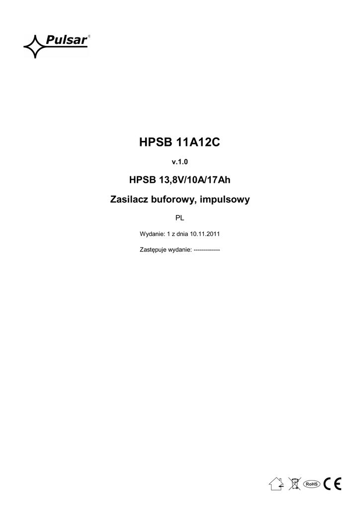 HPSB 11A12C v.1.0 HPSB 13,8V/10A/17Ah Zasilacz buforowy, impulsowy PL Wydanie: 1 z dnia 10.11.2011 Zastępuje wydanie: ------------- Cechy zasilacza: • • • • • • • bezprzerwowe zasilanie DC 13,8V/10A miejsce na akumulator 17Ah/12V szeroki zakres napięcia zasilania AC 176÷264V wysoka sprawność 83% kontrola ładowania i konserwacji akumulatora ochrona akumulatora przed nadmiernym rozładowaniem (UVP) prąd ładowania akumulatora 1A/4A, przełączany zworką • • • zabezpieczenie wyjścia akumulatora przed zwarciem i odwrotnym podłączeniem sygnalizacja optyczna LED zabezpieczenia: • przeciwzwarciowe SCP • nadnapięciowe OVP • przepięciowe (wejście AC) • antysabotażowe • przeciążeniowe OLP SPIS TREŚCI: 1. Opis techniczny. 1.1 Opis ogólny 1.2 Schemat blokowy 1.3 Opis elementów i złącz zasilacza 1.4 Parametry techniczne 2. Instalacja. 2.1 Wymagania 2.2 Procedura instalacji 3. Sygnalizacja pracy zasilacza. 3.1 Sygnalizacja optyczna pracy 4. Obsługa oraz eksploatacja. 4.1 Przeciążenie lub zwarcie wyjścia zasilacza (zadziałanie SCP) 4.2 Odłączenie rozładowanego akumulatora 4.3 Konserwacja 1. Opis techniczny. 1.1 Opis ogólny. Zasilacz buforowy przeznaczony jest do nieprzerwanego zasilania urządzeń wymagających stabilizowanego napięcia 12 V DC (+/-15%). Zasilacz dostarcza napięcia U=13,8 V DC o wydajności prądowej: 1. Prąd wyjściowy 10,0A + 1,0A ładowanie akumulatora 2. Prąd wyjściowy 7,0A + 4,0A ładowanie akumulatora Sumaryczny prąd odbiorników + akumulator wynosi max. 11A. W przypadku zaniku napięcia sieciowego następuje natychmiastowe przełączenie na zasilanie akumulatorowe. Zasilacz skonstruowany jest w oparciu o moduł zasilacza impulsowego, o wysokiej sprawności energetycznej i umieszczony w obudowie metalowej (kolor RAL 9003) z miejscem na akumulator 17Ah/12V. Obudowa wyposażona jest w mikroprzełącznik sygnalizujący otwarcie drzwiczek (czołówki). OPCJONALNE KONFIGURACJE ZASILACZA: (wizualizacja dostępna na www.pulsar.pl) Z AKUMULATOREM 17Ah: 1. Zasilacz buforowy HPSB 13,8V/4x2A/17Ah. - HPSB11A12C + LB4 4x2A (AWZ576) + 17Ah 2. Zasilacz buforowy HPSB 13,8V/8x1A/17Ah. - HPSB11A12C + LB8 8x1A (AWZ579 lub AWZ580) + 17Ah 3. Zasilacz buforowy HPSB 13,8V/12V/10A/17Ah. - HPSB11A12C + 2 x RN500 (13,8V/12V) + 17 Ah 4. Zasilacz buforowy HPSB 13,8V/12V/4x1A/17Ah. - HPSB11A12C + RN500(13,8V/12V) + LB4 4x1A (AWZ575 lub AWZ576) + 17Ah 5. Zasilacz buforowy HPSB 13,8V/(5V÷7,4V)/2A/17Ah. - HPSB11A12C + DCDC20 (5V÷7,4V/2A) + 17Ah 2 Z AKUMULATOREM 7Ah: 1. Zasilacz buforowy HPSB 13,8V/16x0,5A/7Ah. - HPSB11A12C + 2 x LB8 8x0,5A (2 x AWZ578 lub AWZ580) + 7Ah 2. Zasilacz buforowy HPSB 13,8V/12V/8x1A/7Ah. - HPSB11A12C + 2 x RN500(13,8V/12V) + 2x LB4 4x1A (AWZ575 lubAWZ576) + 7 Ah 3. Zasilacz buforowy HPSB 13,8V/2x5V÷7,4V/2x2A/7Ah. - HPSB11A12C + 2 x DCDC20 (2x5V÷7,4V/2x2A) + 7Ah 4. Zasilacz buforowy HPSB 13,8V/4x5V÷7,4V/4x0,5A/7Ah. - HPSB11A12C + DCDC20 (5V÷7,4V/2A) + LB4x0,5A (AWZ574 lub AWZ576) + 7Ah Schemat blokowy (rys.1). Rys.1. Schemat blokowy zasilacza. 1.3 Opis elementów i złącz zasilacza ( tab.1, tab.2, rys.2). Element nr Opis [Rys. 2] [1] Moduł zasilacza [2] Złącza zasilacza (patrz: tab.2) [3] LED zielony sygnalizuje obecność napięcia AC [4] P1 potencjometr, regulacja napięcia wyjściowego [5] BAT+/GND: wyjścia akumulatora +BAT=czerwony, GND=czarny [6] TAMPER, styk ochrony antysabotażowej (NC) [7] Złącze dodatkowej sygnalizacji optycznej Zworka wyboru prądu ładowania: Ibat =1A [8] Ibat =4A Opis: zworka założona, zworka zdjęta. Ustawienie fabryczne: Ibat =1A (zworka założona). Tab.1. Elementy zasilacza. Element [Rys. 2] L, N PE V+ V- Opis L-N złącze zasilania zasilacza Złącze ochrony PE (przeciwporażeniowej) Wyjście zasilania DC Wyjście zasilania DC (GND) Tab.2. Zaciski wyjściowe zasilacza. 3 Rys.2. Widok zasilacza. 4 1.4 Parametry techniczne: - parametry elektryczne (tab.3) - parametry mechaniczne (tab.4) - bezpieczeństwo użytkowania (tab.5) - parametry eksploatacyjne (tab.6) Parametry elektryczne (tab. 3) Napięcie zasilania Pobór prądu Częstotliwość zasilania Moc zasilacza Sprawność Napięcie wyjściowe 176÷264V AC 1,4A@230V AC max. 50÷60Hz 155W max. 83% 13,8V DC – praca buforowa 9,5V÷13,8V DC – praca bateryjna 10A + 1A ładowanie akumulatora 7A + 4A ładowanie akumulatora 10,0 A + 1,0A ładowanie akumulatora - patrz wykres 1 7,0 A + 4,0A ładowanie akumulatora - patrz wykres 1 6,7 A + 1,0A ładowanie akumulatora - patrz wykres 1 3,7 A + 4,0A ładowanie akumulatora - patrz wykres 1 12÷14V DC 120mV p-p max. 1,0A max. @ 17Ah (± 5%) 4,0A max. @ 17Ah (± 5%) elektroniczne bezpiecznik polimerowy U>115% ÷ 150% napięcia wyjściowego - odłączenie napięcia wyjściowego, przywracane automatycznie Prąd wyjściowy Prąd wyjściowy tAMB<30°C Prąd wyjściowy tAMB=40°C Zakres regulacji napięcia wyjściowego Napięcie tętnienia Prąd ładowania akumulatora Zabezpieczenie przed zwarciem SCP Zabezpieczenie w obwodzie akumulatora OLP Zabezpieczenie nadnapięciowe OVP Zabezpieczenie akumulatora przed nadmiernym rozładowaniem UVP Sygnalizacja optyczna: panel przedni zasilacza - AC dioda sygnalizująca stan zasilania AC U<9,5 V (± 5%) – odłączenie zacisku akumulatora - czerwona, stan normalny: świeci światłem ciągłym, awaria: nie świeci - zielona, stan normalny: świeci światłem ciągłym, awaria: nie świeci - microswitch, styki NC (obudowa zamknięta), 0,5A@50V DC (max.) - AUX dioda sygnalizująca stan zasilania DC na wyjściu zasilacza Wyjścia techniczne: - TAMPER wyjście sygnalizujące otwarcie obudowy zasilacza Parametry mechaniczne (tab. 4) Wymiary obudowy 285 x 297 x 80+8 (280 x 292 x 80) (WxHxD) Mocowanie Patrz rysunek 2 Miejsce na akumulator 17Ah/12V (SLA) max. Waga netto/brutto 2,42kg / 2,52kg Kolor obudowy RAL 9003 Zamykanie Wkręt walcowy x 1 (z czoła) (możliwość montażu zamka) Złącza Zasilanie: Φ0,63-2,50 (AWG 22-10) Wyjścia : Φ0,63-2,50 (AWG 22-