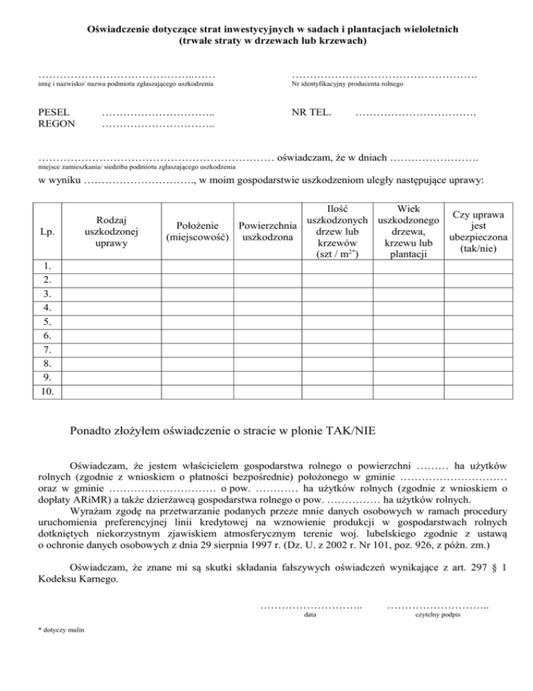 Oświadczenie dotyczące strat inwestycyjnych w sadach i plantacjach wieloletnich (trwałe straty w drzewach lub krzewach) ……………………………………..…… ……………………………………………. imię i nazwisko/ nazwa podmiotu zgłaszającego uszkodzenia Nr identyfikacyjny producenta rolnego PESEL REGON NR TEL. ………………………….. ………………………….. ……………………………. ………………………………………………………… oświadczam, że w dniach ……………………. miejsce zamieszkania/ siedziba podmiotu zgłaszającego uszkodzenia w wyniku …………………………., w moim gospodarstwie uszkodzeniom uległy następujące uprawy: Rodzaj uszkodzonej uprawy Lp. Ilość Wiek Czy uprawa uszkodzonych uszkodzonego Położenie Powierzchnia jest drzew lub drzewa, (miejscowość) uszkodzona ubezpieczona krzewów krzewu lub (tak/nie) (szt / m2*) plantacji 1. 2. 3. 4. 5. 6. 7. 8. 9. 10. Ponadto złożyłem oświadczenie o stracie w plonie TAK/NIE Oświadczam, że jestem właścicielem gospodarstwa rolnego o powierzchni ……… ha użytków rolnych (zgodnie z wnioskiem o płatności bezpośrednie) położonego w gminie ………………………… oraz w gminie ………………………… o pow. ………… ha użytków rolnych (zgodnie z wnioskiem o dopłaty ARiMR) a także dzierżawcą gospodarstwa rolnego o pow. …………… ha użytków rolnych. Wyrażam zgodę na przetwarzanie podanych przeze mnie danych osobowych w ramach procedury uruchomienia preferencyjnej linii kredytowej na wznowienie produkcji w gospodarstwach rolnych dotkniętych niekorzystnym zjawiskiem atmosferycznym terenie woj. lubelskiego zgodnie z ustawą o ochronie danych osobowych z dnia 29 sierpnia 1997 r. (Dz. U. z 2002 r. Nr 101, poz. 926, z późn. zm.) Oświadczam, że znane mi są skutki składania fałszywych oświadczeń wynikające z art. 297 § 1 Kodeksu Karnego. * dotyczy malin ……………………….. ……………………….. data czytelny podpis