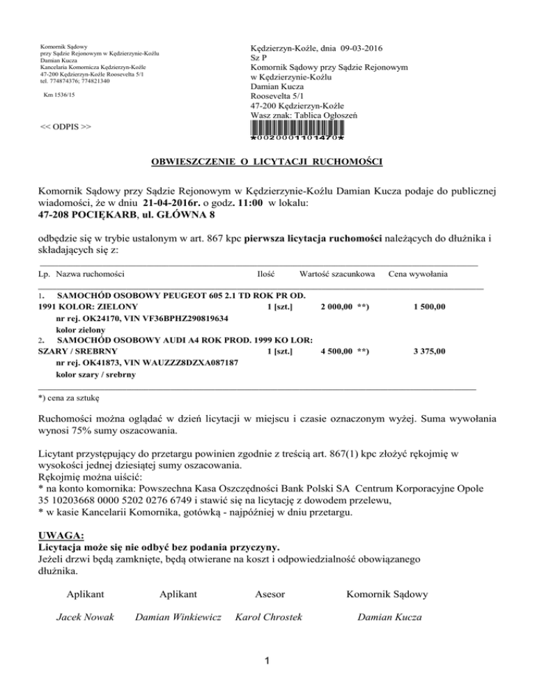 Komornik Sądowy przy Sądzie Rejonowym w Kędzierzynie-Koźlu Damian Kucza Kancelaria Komornicza Kędzierzyn-Koźle 47-200 Kędzierzyn-Koźle Roosevelta 5/1 tel. 774874376; 774821340 Kędzierzyn-Koźle, dnia 09-03-2016 Sz P Komornik Sądowy przy Sądzie Rejonowym w Kędzierzynie-Koźlu Damian Kucza Roosevelta 5/1 47-200 Kędzierzyn-Koźle Wasz znak: Tablica Ogłoszeń Km 1536/15 *0020001101470* << ODPIS >> OBWIESZCZENIE O LICYTACJI RUCHOMOŚCI Komornik Sądowy przy Sądzie Rejonowym w Kędzierzynie-Koźlu Damian Kucza podaje do publicznej wiadomości, że w dniu 21-04-2016r. o godz. 11:00 w lokalu: 47-208 POCIĘKARB, ul. GŁÓWNA 8 odbędzie się w trybie ustalonym w art. 867 kpc pierwsza licytacja ruchomości należących do dłużnika i składających się z: _______________________________________________________________________________________________________________________ Lp. Nazwa ruchomości Ilość Wartość szacunkowa Cena wywołania _________________________________________________________________________________________________________________________ 1. SAMOCHÓD OSOBOWY PEUGEOT 605 2.1 TD ROK PR OD. 1991 KOLOR: ZIELONY 1 [szt.] 2 000,00 **) nr rej. OK24170, VIN VF36BPHZ290819634 kolor zielony 2. SAMOCHÓD OSOBOWY AUDI A4 ROK PROD. 1999 KO LOR: SZARY / SREBRNY 1 [szt.] 4 500,00 **) nr rej. OK41873, VIN WAUZZZ8DZXA087187 kolor szary / srebrny 1 500,00 3 375,00 _______________________________________________________________________________________________________________________ *) cena za sztukę Ruchomości można oglądać w dzień licytacji w miejscu i czasie oznaczonym wyżej. Suma wywołania wynosi 75% sumy oszacowania. Licytant przystępujący do przetargu powinien zgodnie z treścią art. 867(1) kpc złożyć rękojmię w wysokości jednej dziesiątej sumy oszacowania. Rękojmię można uiścić: * na konto komornika: Powszechna Kasa Oszczędności Bank Polski SA Centrum Korporacyjne Opole 35 10203668 0000 5202 0276 6749 i stawić się na licytację z dowodem przelewu, * w kasie Kancelarii Komornika, gotówką - najpóźniej w dniu przetargu. UWAGA: Licytacja może się nie odbyć bez podania przyczyny. Jeżeli drzwi będą zamknięte, będą otwierane na koszt i odpowiedzialność obowiązanego dłużnika. Aplikant Aplikant Asesor Komornik Sądowy Jacek Nowak Damian Winkiewicz Karol Chrostek Damian Kucza 1