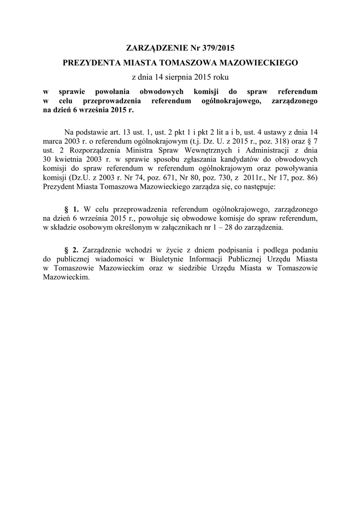 ZARZĄDZENIE Nr 379/2015 PREZYDENTA MIASTA TOMASZOWA MAZOWIECKIEGO z dnia 14 sierpnia 2015 roku w sprawie powołania obwodowych komisji do spraw referendum w celu przeprowadzenia referendum ogólnokrajowego, zarządzonego na dzień 6 września 2015 r. Na podstawie art. 13 ust. 1, ust. 2 pkt 1 i pkt 2 lit a i b, ust. 4 ustawy z dnia 14 marca 2003 r. o referendum ogólnokrajowym (t.j. Dz. U. z 2015 r., poz. 318) oraz § 7 ust. 2 Rozporządzenia Ministra Spraw Wewnętrznych i Administracji z dnia 30 kwietnia 2003 r. w sprawie sposobu zgłaszania kandydatów do obwodowych komisji do spraw referendum w referendum ogólnokrajowym oraz powoływania komisji (Dz.U. z 2003 r. Nr 74, poz. 671, Nr 80, poz. 730, z 2011r., Nr 17, poz. 86) Prezydent Miasta Tomaszowa Mazowieckiego zarządza się, co następuje: § 1. W celu przeprowadzenia referendum ogólnokrajowego, zarządzonego na dzień 6 września 2015 r., powołuje się obwodowe komisje do spraw referendum, w składzie osobowym określonym w załącznikach nr 1 – 28 do zarządzenia. § 2. Zarządzenie wchodzi w życie z dniem podpisania i podlega podaniu do publicznej wiadomości w Biuletynie Informacji Publicznej Urzędu Miasta w Tomaszowie Mazowieckim oraz w siedzibie Urzędu Miasta w Tomaszowie Mazowieckim. Załącznik nr 1 do Zarządzenia Nr 379/2015 Prezydenta Miasta Tomaszowa Mazowieckiego z dnia 14 sierpnia 2015r. Obwodowa Komisja ds. Referendum NR 1 z siedzibą w Zespole Szkół nr 4 ul. Tomasza Ostrowskiego 14 Lp. Nazwisko Imiona Miejsce zamieszkania Podmiot uprawniony 1. BARAŃSKI Paweł Leszek 97-200 Tomaszów Mazowiecki Sojusz Lewicy Demokratycznej 2. CZUJKA Emilia Bogumiła 97-200 Tomaszów Mazowiecki Fundacja „Samorządność i Demokracja” 3. JABRZYK Alicja Zofia 97-200 Tomaszów Mazowiecki Fundacja Lepsza Polska 4. MAJEWSKA Marzanna Teresa 97-200 Tomaszów Mazowiecki Stowarzyszenie na Rzecz Zmiany Systemu Wyborczego –Jednomandatowe Okręgi Wyborcze 5. ZADARA Paulina 97-200 Tomaszów Mazowiecki Fundacja im. Madisona Centrum Rozwoju Demokracji–Jednomandatowe Okręgi Wyborcze 6. KOŁODZIEJCZYK Aneta 97-200 Tomaszów Mazowiecki Stowarzyszenie Libertariańskie 7. ORDYNOWSKA Justyna 97-200 Tomaszów Mazowiecki Prawo i Sprawiedliwość 8. IZBICKA Magdalena 97-200 Tomaszów Mazowiecki Fundacja Aktywności Lokalnej 9. GÓRALCZYK Radosław Marcin 97-200 Tomaszów Mazowiecki Prezydent Miasta Tomaszowa Mazowieckiego Załącznik nr 2 do Zarządzenia Nr 379/2015 Prezydenta Miasta Tomaszowa Mazowieckiego z dnia 14 sierpnia 2015r. Obwodowa Komisja ds. Referendum NR 2 z siedzibą w dawnej Fundacji Rozwoju Gminy Zelów ul. Warszawska 119 Lp. Nazwisko Imiona Miejsce zamieszkania Podmiot uprawniony 1. WIECZOREK Ewelina 97-200 Tomaszów Mazowiecki Fundacja „Samorządność i Demokracja” 2. JĘDRYCHOWICZ Danuta Stanisława 97-200 Tomaszów Mazowiecki Fundacja Lepsza Polska 3. BURCZYŃSKA Karolina 97-200 Tomaszów Mazowiecki Polskie Stronnictwo Ludowe 4. MAJEWSKA Paulina Barbara 97-200 Tomaszów Mazowiecki Stowarzyszenie na Rzecz Zmiany Systemu Wyborczego –Jednomandatowe Okręgi Wyborcze 5. KLIMECKA Aneta Małgorzata 97-200 Tomaszów Mazowiecki Platforma Obywatelska 6. CZYSZKOWSKA Joanna Teresa 97-200 Tomaszów Mazowiecki Stowarzyszenie „Republikanie” 7. KRÓLIKOWSKI Michał Mirosław 97-200 Tomaszów Mazowiecki Prawo i Sprawiedliwość 8. CHRUSTOWICZ Marcin 97-200 Tomaszów Mazowiecki Stowarzyszenie Patriotyczne i Samorządowe „Ojczyzna Rodzina Sprawiedliwość” 9. WÓJCIAK Ewa Monika 97-200 Tomaszów Mazowiecki Prezydent Miasta Tomaszowa Mazowieckiego Załącznik nr 3 do Zarządzenia Nr 379/2015 Prezydenta Miasta Tomaszowa Mazowieckiego z dnia 14 sierpnia 2015r. Obwodowa Komisja ds. Referendum NR 3 z siedzibą w Zespole Przedszkolnym Przedszkole Nr 12 ul. Kombatantów 1/3 Lp. Nazwisko Imiona Miejsce zamieszkania Podmiot uprawniony 1. KONEWKA Henryka 97-200 Tomaszów Mazowiecki Sojusz Lewicy Demokratycznej 2. PISAREK vel NOWAK Barbara Teresa 97-200 Tomaszów Mazowiecki Fundacja Lepsza Polska 3. KRAWIEC Lucyna 97-200 Tomaszów Mazowiecki Polskie Stronnictwo Ludowe 4. SNOPEK Małgorzata Olga 97-200 Tomaszów Mazowiecki Stowarzyszenie na Rzecz Zmiany Systemu Wyborczego –Jednomandatowe Okręgi Wyborcze 5. POCZĄTEK Teresa Bożena 97-200 Tomaszów Mazowiecki Stowarzyszenie Społeczna Inicjatywa Patriotyczna „RAZEM” 6. JACKIEWICZ Mariusz Adam 97-200 Tomaszów Mazowiecki Fundacja im. Madisona Centrum Rozwoju Demokracji–Jednomandatowe Okręgi Wyborcze 7. OWCZAREK Paweł Franciszek 97-200 Tomaszów Mazowiecki Twój Ruch 8. BIERNACKI Zbigniew Paweł 97-200 Tomaszów Mazowiecki Prawo i Sprawiedliwość 9. RYBAK Jadwiga 97-200 Tomaszów Mazowiecki Prezydent Miasta Tomaszowa Mazowieckiego Załącznik nr 4 do Zarządzenia Nr 379/2015 Prezydenta Miasta Tomaszowa Mazowieckiego z dnia 14 sierpnia 2015r. Obwodowa Komisja ds. Referendum NR 4 z siedzibą w Zespole Szkolno-Przedszkolnym Nr 1 ul. J.U.Niemcewicza 50/56 Lp. Nazwisko Imiona Miejsce zamieszkania Podmiot uprawniony 1. PIASTA Waldemar Włodzimierz 97-200 Tomaszów Mazowiecki Sojusz Lewicy Demokratycznej 2. ZAWADZKI Mirosław Andrzej 97-200 Tomaszów Mazowiecki Fundacja „Samorządność i Demokracja” 3. WOJCIECHOWSKI Arkadiusz Radosław 97-200 Tomaszów Mazowiecki Stowarzyszenie na Rzecz Zmiany Systemu Wyborczego – Jednomandatowe Okręgi Wyborcze 4. MAZUREK Ewa Sylwia 97-200 Tomaszów Mazowiecki Stowarzyszenie Libertariańskie 5. KRÓLAK Pola Halina 97-200 Tomaszów Mazowiecki Stowarzyszenie „Republikanie” 6. KIELISZEK Paulina Anna 97-200 Tomaszów Mazowiecki Prawo i Sprawiedliwość 7. ADAMCZYK Dorota Halina 97-200 Tomaszów Mazowiecki Fundacja Aktywności Lokalnej 8. PUTEK Anna Paulina 97-200 Tomaszów Mazowiecki Stowarzyszenie Patriotyczne i Samorządowe „Ojczyzna Rodzina Sprawiedliwość” 9. KOŁODZIEJSKA Ewa Anna 97-200 Tomaszów Mazowiecki Prezydent Miasta Tomaszowa Mazowieckiego Załącznik nr 5 do Zarządzenia Nr 379/2015 Prezydenta Miasta Tomaszowa Mazowieckieg
