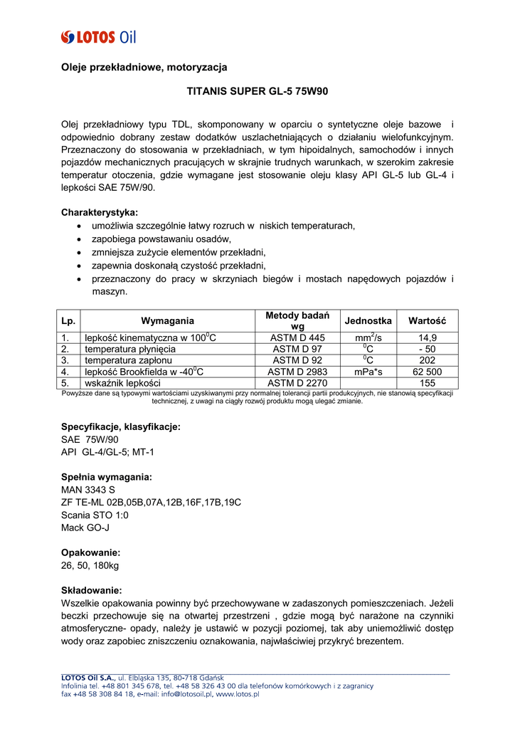 Oleje przekładniowe, motoryzacja TITANIS SUPER GL-5 75W90 Olej przekładniowy typu TDL, skomponowany w oparciu o syntetyczne oleje bazowe i odpowiednio dobrany zestaw dodatków uszlachetniających o działaniu wielofunkcyjnym. Przeznaczony do stosowania w przekładniach, w tym hipoidalnych, samochodów i innych pojazdów mechanicznych pracujących w skrajnie trudnych warunkach, w szerokim zakresie temperatur otoczenia, gdzie wymagane jest stosowanie oleju klasy API GL-5 lub GL-4 i lepkości SAE 75W/90. Charakterystyka: • umożliwia szczególnie łatwy rozruch w niskich temperaturach, • zapobiega powstawaniu osadów, • zmniejsza zużycie elementów przekładni, • zapewnia doskonałą czystość przekładni, • przeznaczony do pracy w skrzyniach biegów i mostach napędowych pojazdów i maszyn. Wymagania Lp. 1. 2. 3. 4. 5. lepkość kinematyczna w 1000C temperatura płynięcia temperatura zapłonu lepkość Brookfielda w -400C wskaźnik lepkości Metody badań wg ASTM D 445 ASTM D 97 ASTM D 92 ASTM D 2983 ASTM D 2270 Jednostka Wartość mm2/s 0 C 0 C mPa*s 14,9 - 50 202 62 500 155 Powyższe dane są typowymi wartościami uzyskiwanymi przy normalnej tolerancji partii produkcyjnych, nie stanowią specyfikacji technicznej, z uwagi na ciągły rozwój produktu mogą ulegać zmianie. Specyfikacje, klasyfikacje: SAE 75W/90 API GL-4/GL-5; MT-1 Spełnia wymagania: MAN 3343 S ZF TE-ML 02B,05B,07A,12B,16F,17B,19C Scania STO 1:0 Mack GO-J Opakowanie: 26, 50, 180kg Składowanie: Wszelkie opakowania powinny być przechowywane w zadaszonych pomieszczeniach. Jeżeli beczki przechowuje się na otwartej przestrzeni , gdzie mogą być narażone na czynniki atmosferyczne- opady, należy je ustawić w pozycji poziomej, tak aby uniemożliwić dostęp wody oraz zapobiec zniszczeniu oznakowania, najwłaściwiej przykryć brezentem. _____________________________________________________________________________________________________ Produkt nie może być przechowywany w temperaturze wyższej niż 60ºC, ani też narażony na działanie promieni słonecznych lub bardzo niskich temperatur. Gwarantowany okres przydatności produktu do użycia przy zachowaniu warunków magazynowania wynosi nie mniej niż 3 lata. Zdrowie, BHP, środowisko: Informacje na temat bezpieczeństwa zawarte są w zbiorze danych dotyczących bezpieczeństwa materiałów (karta bezpieczeństwa msds). Zawarte tam są szczegółowe informacje odnośne potencjalnych zagrożeń, środków ostrożności oraz zasad udzielania pierwszej pomocy wraz z informacjami na temat wpływu na środowisko naturalne i usuwania wykorzystanych produktów. LOTOS Oil SA i firmy współpracujące nie ponoszą odpowiedzialności za skutki niezgodnego z przeznaczenie wykorzystania produktu lub niestosowania opisanych środków ostrożności. Przed zastosowaniem produktu do innych niż wymienione celów, należy zasięgnąć porady lokalnego biura LOTOS Oil SA Dane zawarte w niniejszej karcie nie stanowią oferty w rozumieniu przepisów ustawy z dnia 23 kwietnia 1964 roku - kodeks cywilny. LOTOS Oil S.A. nie ponosi żadnej odpowiedzialności za jakiekolwiek skutki wykorzystywania danych zawartych w karcie, w szczególności przy podejmowaniu decyzji handlowych i inwestycyjnych. Wszelkie dane zawarte w karcie są typowymi wartościami uzyskiwanymi przy normalnej tolerancji partii produkcyjnych, mogą się nieznacznie różnić z uwagi na charakterystykę procesu produkcji, a także z uwagi na ciągły rozwój produktu. Dane zawarte w karcie mogą podlegać zmianom. LOTOS Oil S.A. nie ponosi odpowiedzialności za dostępność produktu. Opracowano: 15.02.2008 Wydanie nr 2 Aktualizacja: 15.11.2010 _____________________________________________________________________________________________________