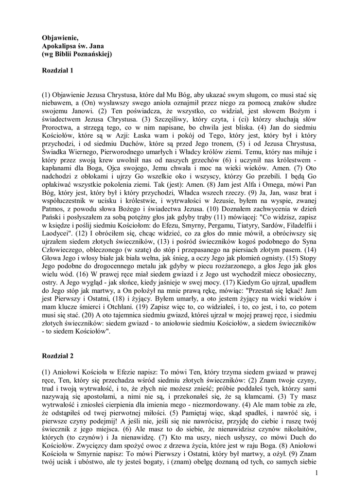 Objawienie, Apokalipsa św. Jana (wg Biblii Poznańskiej) Rozdział 1 (1) Objawienie Jezusa Chrystusa, które dał Mu Bóg, aby ukazać swym sługom, co musi stać się niebawem, a (On) wysławszy swego anioła oznajmił przez niego za pomocą znaków słudze swojemu Janowi. (2) Ten poświadcza, że wszystko, co widział, jest słowem Bożym i świadectwem Jezusa Chrystusa. (3) Szczęśliwy, który czyta, i (ci) którzy słuchają słów Proroctwa, a strzegą tego, co w nim napisane, bo chwila jest bliska. (4) Jan do siedmiu Kościołów, które są w Azji: Łaska wam i pokój od Tego, który jest, który był i który przychodzi, i od siedmiu Duchów, które są przed Jego tronem, (5) i od Jezusa Chrystusa, Świadka Wiernego, Pierworodnego umarłych i Władcy królów ziemi. Temu, który nas miłuje i który przez swoją krew uwolnił nas od naszych grzechów (6) i uczynił nas królestwem kapłanami dla Boga, Ojca swojego, Jemu chwała i moc na wieki wieków. Amen. (7) Oto nadchodzi z obłokami i ujrzy Go wszelkie oko i wszyscy, którzy Go przebili. I będą Go opłakiwać wszystkie pokolenia ziemi. Tak (jest): Amen. (8) Jam jest Alfa i Omega, mówi Pan Bóg, który jest, który był i który przychodzi, Władca wszech rzeczy. (9) Ja, Jan, wasz brat i współuczestnik w ucisku i królestwie, i wytrwałości w Jezusie, byłem na wyspie, zwanej Patmos, z powodu słowa Bożego i świadectwa Jezusa. (10) Doznałem zachwycenia w dzień Pański i posłyszałem za sobą potężny głos jak gdyby trąby (11) mówiącej: "Co widzisz, zapisz w księdze i poślij siedmiu Kościołom: do Efezu, Smyrny, Pergamu, Tiatyry, Sardów, Filadelfii i Laodycei". (12) I obróciłem się, chcąc widzieć, co za głos do mnie mówił, a obróciwszy się ujrzałem siedem złotych świeczników, (13) i pośród świeczników kogoś podobnego do Syna Człowieczego, obleczonego (w szatę) do stóp i przepasanego na piersiach złotym pasem. (14) Głowa Jego i włosy białe jak biała wełna, jak śnieg, a oczy Jego jak płomień ognisty. (15) Stopy Jego podobne do drogocennego metalu jak gdyby w piecu rozżarzonego, a głos Jego jak głos wielu wód. (16) W prawej ręce miał siedem gwiazd i z Jego ust wychodził miecz obosieczny, ostry. A Jego wygląd - jak słońce, kiedy jaśnieje w swej mocy. (17) Kiedym Go ujrzał, upadłem do Jego stóp jak martwy, a On położył na mnie prawą rękę, mówiąc: "Przestań się lękać! Jam jest Pierwszy i Ostatni, (18) i żyjący. Byłem umarły, a oto jestem żyjący na wieki wieków i mam klucze śmierci i Otchłani. (19) Zapisz więc to, co widziałeś, i to, co jest, i to, co potem musi się stać. (20) A oto tajemnica siedmiu gwiazd, któreś ujrzał w mojej prawej ręce, i siedmiu złotych świeczników: siedem gwiazd - to aniołowie siedmiu Kościołów, a siedem świeczników - to siedem Kościołów". Rozdział 2 (1) Aniołowi Kościoła w Efezie napisz: To mówi Ten, który trzyma siedem gwiazd w prawej ręce, Ten, który się przechadza wśród siedmiu złotych świeczników: (2) Znam twoje czyny, trud i twoją wytrwałość, i to, że złych nie możesz znieść; próbie poddałeś tych, którzy sami nazywają się apostołami, a nimi nie są, i przekonałeś się, że są kłamcami. (3) Ty masz wytrwałość i zniosłeś cierpienia dla imienia mego - niezmordowany. (4) Ale mam tobie za złe, że odstąpiłeś od twej pierwotnej miłości. (5) Pamiętaj więc, skąd spadłeś, i nawróć się, i pierwsze czyny podejmij! A jeśli nie, jeśli się nie nawrócisz, przyjdę do ciebie i ruszę twój świecznik z jego miejsca. (6) Ale masz to do siebie, że nienawidzisz czynów nikolaitów, których (to czynów) i Ja nienawidzę. (7) Kto ma uszy, niech usłyszy, co mówi Duch do Kościołów. Zwycięzcy dam spożyć owoc z drzewa życia, które jest w raju Boga. (8) Aniołowi Kościoła w Smyrnie napisz: To mówi Pierwszy i Ostatni, który był martwy, a ożył. (9) Znam twój ucisk i ubóstwo, ale ty jesteś bogaty, i (znam) obelgę doznaną od tych, co samych siebie 1 zowią Żydami, a nie są nimi, lecz synagogą szatana. (10) Przestań się lękać tego, co masz cierpieć. Oto diabeł ma niektórych z was wtrącić do więzienia, abyście zostali poddani próbie, i znosić będziecie ucisk przez dziesięć dni. Bądź wierny aż do śmierci, a dam ci wieniec życia. (11) Kto ma uszy, nie usłyszy, co mówi Duch do Kościołów. Zwycięzcy śmierć druga na pewno nie wyrządzi szkody. (12) Aniołowi Kościoła w Pergamie napisz: To mówi Ten, który ma miecz obosieczny, ostry. (13) Wiem, gdzie mieszkasz: tam, gdzie jest tron szatana, a trzymasz się mego imienia i wiary mojej się nie zaparłeś nawet we dni Antypasa mojego wiernego świadka, który został zabity u was, tam gdzie mieszka szatan. (14) Ale trochę mam tobie za złe, że masz tam takich, co się trzymają nauki Balaama, który pouczył Balaka, jak podsunąć synowi Izraela sposobność do grzechu przez spożycie ofiar składanych bożkom i uprawianie rozpusty. (15) Tak i ty także masz tych, co się trzymają podobnie nauki nikolaitów. (16) Nawróć się zatem! Bo jeśli nie - przyjdę do ciebie niebawem i będę z nimi walczył mieczem moich ust. (17) Kto ma uszy, niech usłyszy, co mówi Duch do Kościołów. Zwycięzcy dam manny ukrytej i dam mu biały kamyk, a na kamyku wypisane imię nowe, którego nikt nie zna oprócz tego, kto (je) otrzymuje. (18) Aniołowi Kościoła w Tiatyrze napisz: To mówi Syn Boży: Ten, który ma oczy jak płomień ognisty, a nogi jego są podobne do drogocennego metalu. (19) Znam twoje czyny, miłość, wiarę, posługę i twoją wytrwałość, i czyny twoje ostatnie liczniejsze od pierwszych, (20) ale mam tobie za złe, że pozwalasz działać niewieście Jezabel, która nazywa siebie prorokinią, a naucza i zwodzi moje sługi, tak że uprawiają rozpustę i spożywają ofiary składane bożkom. (21) Dałem jej czas, by się mogła nawrócić, ale ona nie chce się 