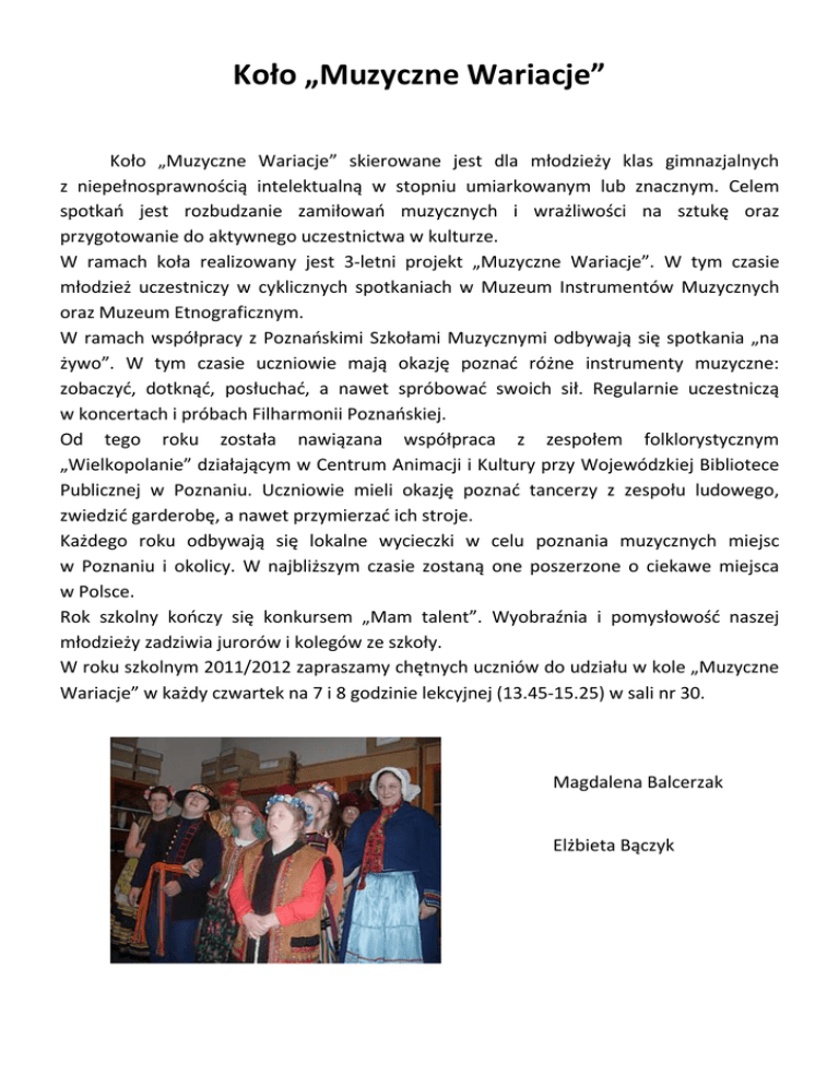 Koło „Muzyczne Wariacje” Koło „Muzyczne Wariacje” skierowane jest dla młodzieży klas gimnazjalnych z niepełnosprawnością intelektualną w stopniu umiarkowanym lub znacznym. Celem spotkań jest rozbudzanie zamiłowań muzycznych i wrażliwości na sztukę oraz przygotowanie do aktywnego uczestnictwa w kulturze. W ramach koła realizowany jest 3-letni projekt „Muzyczne Wariacje”. W tym czasie młodzież uczestniczy w cyklicznych spotkaniach w Muzeum Instrumentów Muzycznych oraz Muzeum Etnograficznym. W ramach współpracy z Poznańskimi Szkołami Muzycznymi odbywają się spotkania „na żywo”. W tym czasie uczniowie mają okazję poznać różne instrumenty muzyczne: zobaczyć, dotknąć, posłuchać, a nawet spróbować swoich sił. Regularnie uczestniczą w koncertach i próbach Filharmonii Poznańskiej. Od tego roku została nawiązana współpraca z zespołem folklorystycznym „Wielkopolanie” działającym w Centrum Animacji i Kultury przy Wojewódzkiej Bibliotece Publicznej w Poznaniu. Uczniowie mieli okazję poznać tancerzy z zespołu ludowego, zwiedzić garderobę, a nawet przymierzać ich stroje. Każdego roku odbywają się lokalne wycieczki w celu poznania muzycznych miejsc w Poznaniu i okolicy. W najbliższym czasie zostaną one poszerzone o ciekawe miejsca w Polsce. Rok szkolny kończy się konkursem „Mam talent”. Wyobraźnia i pomysłowość naszej młodzieży zadziwia jurorów i kolegów ze szkoły. W roku szkolnym 2011/2012 zapraszamy chętnych uczniów do udziału w kole „Muzyczne Wariacje” w każdy czwartek na 7 i 8 godzinie lekcyjnej (13.45-15.25) w sali nr 30. Magdalena Balcerzak Elżbieta Bączyk