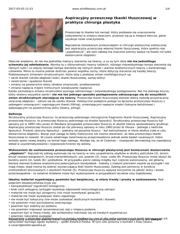 2017-03-03 11:51 www.artofbeauty.com.pl 1/4 Aspiracyjny przeszczep tkanki tłuszczowej w praktyce chirurga plastyka Przeszczep to tkanka lub narząd, który pozbawia się unaczynienia (odżywienia) w miejscu dawczym, przenosi się ją w miejsce biorcze, gdzie uzyskuje nowe unaczynienie. Najczęściej stosowanym przeszczepem w chirurgii plastycznej estetycznej jest aspiracyjny przeszczep własnej tkanki tłuszczowej, która spełnia rolę „wypełniacza”, ale sam zabieg ma znacznie szerszy wpływ na tkanki niż tylko dostarczenie objętości. Obecnie wiadomo, że nie ma jednolitej matrycy starzenia się twarzy, a co za tym idzie nie ma jednolitego schematu jej odmładzania. Wynika to z różnorodności twarzy ludzkich, różnego indywidualnego tempa starzenia się różnych ludzi i co więcej różnego tempa starzenia się różnych okolic i warstw anatomicznych twarzy u konkretnego człowieka. Mimo to można jednak dostrzec pewne wspólne cechy, które dotyczą starzenia się każdej twarzy. Podstawowymi zmianami strukturalnymi, które leżą u podstaw zmian morfologicznych są: • zanik tkanek (utrata objętości kości, tkanki tłuszczowej, samej skóry) • zwiotczenie i opadanie tkanek • zmiany na powierzchni skóry (drobne zmarszczki, przebarwienia) • zmiana napięcia mięśni mimicznych (zwiększenie napięcia). Każda zachodząca zmiana strukturalna wymaga odmiennego i indywidualnego postępowania. Nie ma jednego klucza, który otwiera wszystkie zamki i nie ma też jednego sposobu postępowania odnoszącego się do wszystkich zmian strukturalnych starzejącej się twarzy. Przeszczep tkanki tłuszczowej stanowi dobrą metodę przywracania utraconej objętości – odnosi się do zaniku tkanek. Holistyczne podejście polega na łączeniu przeszczepu tłuszczu z zabiegami unoszącymi i napinającymi tkanki (lifting), zmieniającymi napięcie mięśni (toksyna botulinowa) i wpływającymi na powierzchnię skóry (lasery, pilingi). Definicje Strukturalny przeszczep tłuszczu: to przeszczep pobranego chirurgicznie fragmentu tkanki tłuszczowej. Aspiracyjny przeszczep tłuszczu: to przeszczep tłuszczu pobranego na drodze liposukcji. Strukturalny przeszczep tłuszczu był opisany już w 1893 roku przez dr Neubera (przypadek przeszczepu tłuszczu w ubytek twarzy spowodowany gruźlicą). Aspiracyjny przeszczep tłuszczu został po raz pierwszy opisany w roku 1983 przez dr Illouza – jednego z twórców liposukcji. Produkt uboczny liposukcji – pobrany od pacjenta tłuszcz – był wstrzykiwany w różne okolice ciała w celu dostarczenia objętości. Biorąc pod uwagę te fakty historyczne nie można stwierdzić, że idea przeszczepu tkanki tłuszczowej to nowość. W czasie ostatniego ćwierćwiecza przeprowadzono jednak wiele badań naukowych, które wniosły sporo nowej wiedzy na temat tego zabiegu. Wydaje się, że dr Coleman – nowojorski dermatolog ma największy wkład w usystematyzowanie i rozpowszechnienie tej wiedzy. Wskazaniem do zastosowania przeszczepu tłuszczu w chirurgii plastycznej jest konieczność dostarczenia „objętości”. Najczęściej zabieg wykonuje się na twarzy w celu uzupełnienia ubytków w okolicy policzków (2), skroni, bruzd nosowo-wargowych, bruzd marionetkowych, ust, powiek (3), nosa, czoła (9). Przeszczep tłuszczu może służyć do korekty piersi (4), łydek (6) i pośladków. W przypadku piersi zabieg mógłby być częściej wykonywany, ale główną barierę stanowi budowa anatomiczna potencjalnych kandydatek - kobiety z małymi piersiami zwykle są szczupłe i nie mają miejsc skąd można by pobrać wystarczającą ilość tkanki tłuszczowej. Zabieg jest pomocny w korekcie zniekształceń bliznowatych z ubytkiem tkanek (5). Przeszczep tłuszczu wpływa korzystnie na jakość skóry i działa przeciwzapalnie – to ostatnie działanie może być wykorzystane w przypadkach leczenia cery trądzikowej. Idealny materiał wypełniający powinien być bezpieczny, w miarę trwały i prosty w zastosowaniu. Pod pojęciem bezpieczeństwa kryje się: • kompatybilność (zgodność) biologiczna • brak cech antygenu (antygen wywołuje odpowiedź immunologiczną ustroju) • materiał nie może być pirogenny (nie może wywoływać gorączki) • materiał nie może wywoływać stanu zapalnego • nie może być toksyczny (nie może uszkadzać okolicznych komórek i tkanek) • nie powinien mieć pochodzenia zwierzęcego • powinien być stabilny po podaniu • nie powinien migrować (przemieszczać się) z miejsca podania • powinien być w miarę trwały, ale wchłanialny (odchodzi się od trwałych wypełniaczy) • powinien naturalnie wyglądać. Korzystanie z artykułów własnej publikowanych w portalu artofbeauty.com.pl dla celów warunki komercyjnych bądź Aspiracyjny przeszczep tkanki tłuszczowej spełnia wszystkie powyższe i poprzez to dokonywanie jest złotym ich opracowań wymaga zgody wydawcy - spółki Estetica Polska. W tym celu prosimy o kontakt z Ewą Cesarz, [email protected] 2017-03-03 11:51 www.artofbeauty.com.pl 2/4 standardem wśród szeroko pojętych „wypełniaczy”. Pacjent przynosi materiał ze sobą – nie ma kosztu preparatu. Jednorazowo można podać dużą ilość tkanki tłuszczowej (w twarz często 50 cm3, w piersi nawet po 300-400 cm3 na stronę). Zabieg nie pozostawia zewnętrznych blizn. Przy prawidłowo wykonanej procedurze praktycznie nie obserwuje się powikłań. Część podanej tkanki tłuszczowej przyjmuje się, uzyskuje unaczynienie w nowym miejscu i daje trwały wynik (nie ma wiarygodnych badań naukowych na temat procentowej oceny przyjmowania się przeszczepu tłuszczu). Przeszczepione komórki tłuszczowe w miejscu biorczym tłuszczu zachowują się tak samo jak zachowywały się w miejscu dawczym – w przypadku spadku masy ciała objętość przeszczepionych komórek maleje, a w czasie tycia rośnie. Wraz z tkanką tłuszczową przeszczepiane są komórki macierzyste, które w znacznym