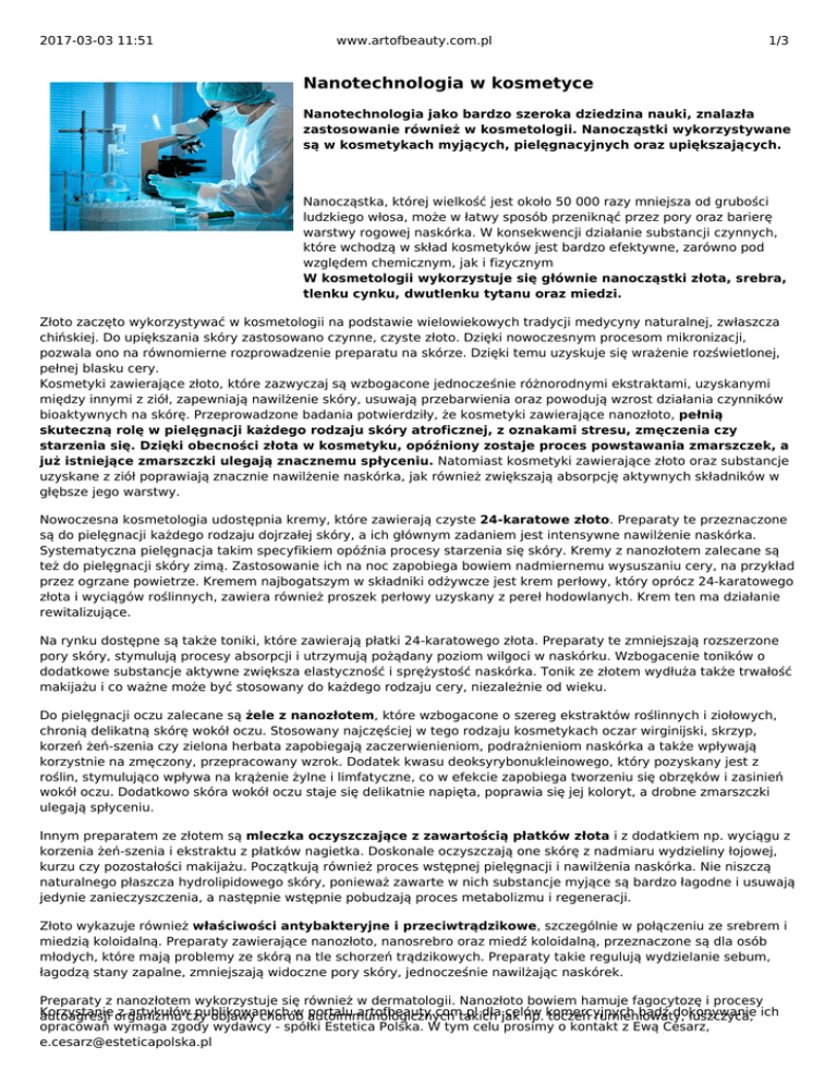 2017-03-03 11:51 www.artofbeauty.com.pl 1/3 Nanotechnologia w kosmetyce Nanotechnologia jako bardzo szeroka dziedzina nauki, znalazła zastosowanie również w kosmetologii. Nanocząstki wykorzystywane są w kosmetykach myjących, pielęgnacyjnych oraz upiększających. Nanocząstka, której wielkość jest około 50 000 razy mniejsza od grubości ludzkiego włosa, może w łatwy sposób przeniknąć przez pory oraz barierę warstwy rogowej naskórka. W konsekwencji działanie substancji czynnych, które wchodzą w skład kosmetyków jest bardzo efektywne, zarówno pod względem chemicznym, jak i fizycznym W kosmetologii wykorzystuje się głównie nanocząstki złota, srebra, tlenku cynku, dwutlenku tytanu oraz miedzi. Złoto zaczęto wykorzystywać w kosmetologii na podstawie wielowiekowych tradycji medycyny naturalnej, zwłaszcza chińskiej. Do upiększania skóry zastosowano czynne, czyste złoto. Dzięki nowoczesnym procesom mikronizacji, pozwala ono na równomierne rozprowadzenie preparatu na skórze. Dzięki temu uzyskuje się wrażenie rozświetlonej, pełnej blasku cery. Kosmetyki zawierające złoto, które zazwyczaj są wzbogacone jednocześnie różnorodnymi ekstraktami, uzyskanymi między innymi z ziół, zapewniają nawilżenie skóry, usuwają przebarwienia oraz powodują wzrost działania czynników bioaktywnych na skórę. Przeprowadzone badania potwierdziły, że kosmetyki zawierające nanozłoto, pełnią skuteczną rolę w pielęgnacji każdego rodzaju skóry atroficznej, z oznakami stresu, zmęczenia czy starzenia się. Dzięki obecności złota w kosmetyku, opóźniony zostaje proces powstawania zmarszczek, a już istniejące zmarszczki ulegają znacznemu spłyceniu. Natomiast kosmetyki zawierające złoto oraz substancje uzyskane z ziół poprawiają znacznie nawilżenie naskórka, jak również zwiększają absorpcję aktywnych składników w głębsze jego warstwy. Nowoczesna kosmetologia udostępnia kremy, które zawierają czyste 24-karatowe złoto. Preparaty te przeznaczone są do pielęgnacji każdego rodzaju dojrzałej skóry, a ich głównym zadaniem jest intensywne nawilżenie naskórka. Systematyczna pielęgnacja takim specyfikiem opóźnia procesy starzenia się skóry. Kremy z nanozłotem zalecane są też do pielęgnacji skóry zimą. Zastosowanie ich na noc zapobiega bowiem nadmiernemu wysuszaniu cery, na przykład przez ogrzane powietrze. Kremem najbogatszym w składniki odżywcze jest krem perłowy, który oprócz 24-karatowego złota i wyciągów roślinnych, zawiera również proszek perłowy uzyskany z pereł hodowlanych. Krem ten ma działanie rewitalizujące. Na rynku dostępne są także toniki, które zawierają płatki 24-karatowego złota. Preparaty te zmniejszają rozszerzone pory skóry, stymulują procesy absorpcji i utrzymują pożądany poziom wilgoci w naskórku. Wzbogacenie toników o dodatkowe substancje aktywne zwiększa elastyczność i sprężystość naskórka. Tonik ze złotem wydłuża także trwałość makijażu i co ważne może być stosowany do każdego rodzaju cery, niezależnie od wieku. Do pielęgnacji oczu zalecane są żele z nanozłotem, które wzbogacone o szereg ekstraktów roślinnych i ziołowych, chronią delikatną skórę wokół oczu. Stosowany najczęściej w tego rodzaju kosmetykach oczar wirginijski, skrzyp, korzeń żeń-szenia czy zielona herbata zapobiegają zaczerwienieniom, podrażnieniom naskórka a także wpływają korzystnie na zmęczony, przepracowany wzrok. Dodatek kwasu deoksyrybonukleinowego, który pozyskany jest z roślin, stymulująco wpływa na krążenie żylne i limfatyczne, co w efekcie zapobiega tworzeniu się obrzęków i zasinień wokół oczu. Dodatkowo skóra wokół oczu staje się delikatnie napięta, poprawia się jej koloryt, a drobne zmarszczki ulegają spłyceniu. Innym preparatem ze złotem są mleczka oczyszczające z zawartością płatków złota i z dodatkiem np. wyciągu z korzenia żeń-szenia i ekstraktu z płatków nagietka. Doskonale oczyszczają one skórę z nadmiaru wydzieliny łojowej, kurzu czy pozostałości makijażu. Początkują również proces wstępnej pielęgnacji i nawilżenia naskórka. Nie niszczą naturalnego płaszcza hydrolipidowego skóry, ponieważ zawarte w nich substancje myjące są bardzo łagodne i usuwają jedynie zanieczyszczenia, a następnie wstępnie pobudzają proces metabolizmu i regeneracji. Złoto wykazuje również właściwości antybakteryjne i przeciwtrądzikowe, szczególnie w połączeniu ze srebrem i miedzią koloidalną. Preparaty zawierające nanozłoto, nanosrebro oraz miedź koloidalną, przeznaczone są dla osób młodych, które mają problemy ze skórą na tle schorzeń trądzikowych. Preparaty takie regulują wydzielanie sebum, łagodzą stany zapalne, zmniejszają widoczne pory skóry, jednocześnie nawilżając naskórek. Preparaty z nanozłotem wykorzystuje się również w dermatologii. Nanozłoto bowiem hamuje fagocytozę i procesy Korzystanie z artykułówczy publikowanych w autoimmunologicznych portalu artofbeauty.com.pl dlajak celów bądź dokonywanie autoagresji organizmu objawy chorób takich np. komercyjnych toczeń rumieniowaty, łuszczyca, ich opracowań wymaga zgody wydawcy - spółki Estetica Polska. W tym celu prosimy o kontakt z Ewą Cesarz, [email protected] 2017-03-03 11:51 www.artofbeauty.com.pl 2/3 bielactwo, kolagenozy oraz przewlekłe wypryski. Biorąc pod uwagę srebro, współczesna kosmetologia udowodniła, że związki srebra mają między innymi działanie przeciwzapalne i bakteriobójcze. Właściwości takie mają dzięki temu, że jony srebra wchodzą w reakcję z błoną komórkową drobnoustrojów, powodując unieczynnienie niektórych enzymów bakteryjnych. W efekcie działają antyseptycznie. Preparaty, które zawierają zmikronizowane srebro wpływają hamująco na pracę gruczołów łojowych, a jednocześnie niszczą większość bakterii powodujących rozkład wydzieliny łojo