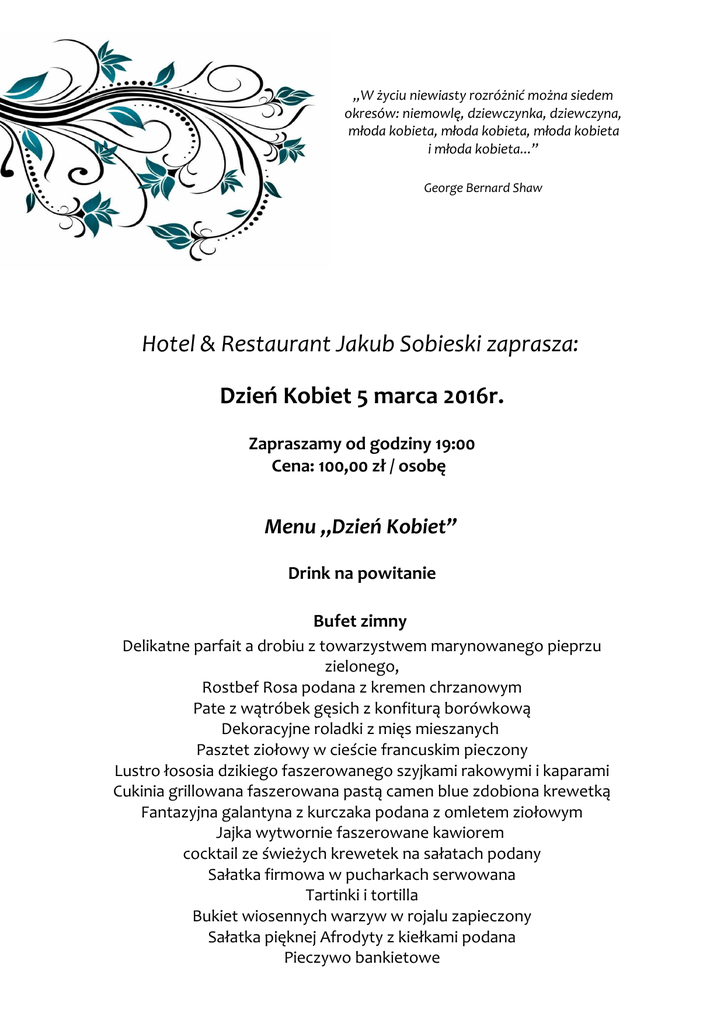 „W życiu niewiasty rozróżnić można siedem okresów: niemowlę, dziewczynka, dziewczyna, młoda kobieta, młoda kobieta, młoda kobieta i młoda kobieta...” George Bernard Shaw Hotel & Restaurant Jakub Sobieski zaprasza: Dzień Kobiet 5 marca 2016r. Zapraszamy od godziny 19:00 Cena: 100,00 zł / osobę Menu „Dzień Kobiet” Drink na powitanie Bufet zimny Delikatne parfait a drobiu z towarzystwem marynowanego pieprzu zielonego, Rostbef Rosa podana z kremen chrzanowym Pate z wątróbek gęsich z konfiturą borówkową Dekoracyjne roladki z mięs mieszanych Pasztet ziołowy w cieście francuskim pieczony Lustro łososia dzikiego faszerowanego szyjkami rakowymi i kaparami Cukinia grillowana faszerowana pastą camen blue zdobiona krewetką Fantazyjna galantyna z kurczaka podana z omletem ziołowym Jajka wytwornie faszerowane kawiorem cocktail ze świeżych krewetek na sałatach podany Sałatka firmowa w pucharkach serwowana Tartinki i tortilla Bukiet wiosennych warzyw w rojalu zapieczony Sałatka pięknej Afrodyty z kiełkami podana Pieczywo bankietowe Masło z domowej maselniczki Bufet gorący Włoskia Lazania przekładana miodowym szpinakiem w aromacie migdałów pod beszamelem ziołowym zapieczona Gulasz Carski z kluseczkami estragonowymi podany Barszczyk czerwony serwowany z plackiem lotaryńskim Kilka smaków azjatyckich na stanowisku live cocking serwowanych przez naszego Szefa kuchni. Bufet słodkości i owoców podanych na lustrach O dobry nastrój i oprawę muzyczną zadba DJ Kowal Informacje i rezerwacje pod numerem telefonu 71 301 41 80 lub 513 169 919