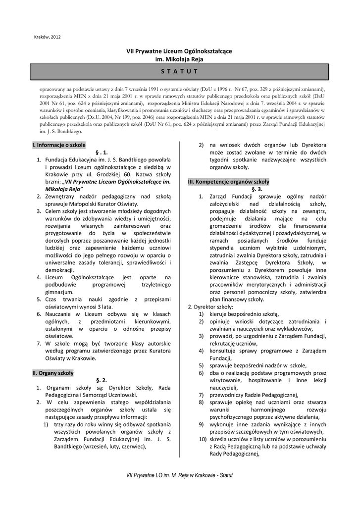 Kraków, 2012 VII Prywatne Liceum Ogólnokształcące im. Mikołaja Reja S T A T U T opracowany na podstawie ustawy z dnia 7 września 1991 o systemie oświaty (DzU z 1996 r. Nr 67, poz. 329 z późniejszymi zmianami), rozporządzenia MEN z dnia 21 maja 2001 r. w sprawie ramowych statutów publicznego przedszkola oraz publicznych szkół (DzU 2001 Nr 61, poz. 624 z późniejszymi zmianami), rozporządzenia Ministra Edukacji Narodowej z dnia 7. września 2004 r. w sprawie warunków i sposobu oceniania, klasyfikowania i promowania uczniów i słuchaczy oraz przeprowadzania egzaminów i sprawdzianów w szkołach publicznych (Dz.U. 2004, Nr 199, poz. 2046) oraz rozporządzenia MEN z dnia 21 maja 2001 r. w sprawie ramowych statutów publicznego przedszkola oraz publicznych szkół (DzU Nr 61, poz. 624 z późniejszymi zmianami) przez Zarząd Fundacji Edukacyjnej im. J. S. Bandtkiego. I. Informacje o szkole 1. 2. 3. 4. 5. 6. 7. § . 1. Fundacja Edukacyjna im. J. S. Bandtkiego powołała i prowadzi liceum ogólnokształcące z siedzibą w Krakowie przy ul. Grodzkiej 60. Nazwa szkoły brzmi: „VII Prywatne Liceum Ogólnokształcące im. Mikołaja Reja” Zewnętrzny nadzór pedagogiczny nad szkołą sprawuje Małopolski Kurator Oświaty. Celem szkoły jest stworzenie młodzieży dogodnych warunków do zdobywania wiedzy i umiejętności, rozwijania własnych zainteresowań oraz przygotowanie do życia w społeczeństwie dorosłych poprzez poszanowanie każdej jednostki ludzkiej oraz zapewnienie każdemu uczniowi możliwości do jego pełnego rozwoju w oparciu o uniwersalne zasady tolerancji, sprawiedliwości i demokracji. Liceum Ogólnokształcące jest oparte na podbudowie programowej trzyletniego gimnazjum. Czas trwania nauki zgodnie z przepisami oświatowymi wynosi 3 lata. Nauczanie w Liceum odbywa się w klasach ogólnych, z przedmiotami kierunkowymi, ustalonymi w oparciu o odnośne przepisy oświatowe. W szkole mogą być tworzone klasy autorskie według programu zatwierdzonego przez Kuratora Oświaty w Krakowie. II. Organy szkoły §. 2. 1. Organami szkoły są: Dyrektor Szkoły, Rada Pedagogiczna i Samorząd Uczniowski. 2. W celu zapewnienia stałego współdziałania poszczególnych organów szkoły ustala się następujące zasady przepływu informacji: 1) trzy razy do roku winny się odbywać spotkania wszystkich powołanych organów szkoły z Zarządem Fundacji Edukacyjnej im. J. S. Bandtkiego (wrzesień, luty, czerwiec), 2) na wniosek dwóch organów lub Dyrektora może zostać zwołane w terminie do dwóch tygodni spotkanie nadzwyczajne wszystkich organów szkoły. III. Kompetencje organów szkoły §. 3. 1. Zarząd Fundacji sprawuje ogólny nadzór założycielski nad działalnością szkoły, propaguje działalność szkoły na zewnątrz, podejmuje działania mające na celu gromadzenie środków dla finansowania działalności dydaktycznej i pozadydaktycznej, w ramach posiadanych środków funduje stypendia uczniom wybitnie uzdolnionym, zatrudnia i zwalnia Dyrektora szkoły, zatrudnia i zwalnia Zastępcę Dyrektora Szkoły, w porozumieniu z Dyrektorem powołuje inne kierownicze stanowiska, zatrudnia i zwalnia pracowników merytorycznych i administracji oraz personel pomocniczy szkoły, zatwierdza plan finansowy szkoły. 2. Dyrektor szkoły: 1) kieruje bezpośrednio szkołą, 2) opiniuje wnioski dotyczące zatrudniania i zwalniania nauczycieli oraz wykładowców, 3) prowadzi, po uzgodnieniu z Zarządem Fundacji, rekrutację uczniów, 4) konsultuje sprawy programowe z Zarządem Fundacji, 5) sprawuje bezpośredni nadzór w szkole, 6) dba o realizację podstaw programowych przez wizytowanie, hospitowanie i inne lekcji nauczycieli, 7) przewodniczy Radzie Pedagogicznej, 8) sprawuje opiekę nad uczniami oraz stwarza warunki harmonijnego rozwoju psychofizycznego poprzez aktywne działania, 9) wykonuje inne zadania wynikające z innych przepisów szczegółowych w tym oświatowych, 10) skreśla uczniów z listy uczniów w porozumieniu z Radą Pedagogiczną lub na podstawie uchwały Rady Pedagogicznej, VII Prywatne LO im. M. Reja w Krakowie - Statut 11) występuje z wnioskami w sprawie wynagrodzeń, nagród, kar, odznaczeń oraz innych wyróżnień dotyczących nauczycieli i pozostałych pracowników szkoły uzgadniając je z organem prowadzącym szkoły, 12) po konsultacjach z organem prowadzącym powołuje zastępcę Dyrektora szkoły, 13) określa, w porozumieniu z Zarządem Fundacji, szczegółowy zakres obowiązków Zastępcy Dyrektora i innych stanowisk kierowniczych. 14) Zastępca Dyrektora Szkoły: sprawuje nadzór nad realizacją programów nauczania poprzez hospitowanie, monitorowanie wpisów w dziennikach lekcyjnych i porównanie ich z rozkładem materiału złożonym na początku roku szkolnego przez nauczyciela, przygotowuje wnioski dotyczące oceny pracy zawodowej nauczyciela, sprawuje nadzór nad ścieżką awansu zawodowego nauczycieli (hospitacje, rozmowy, kontrola realizacji planu rozwoju zawodowego), proponuje sposoby badania jakości nauczania (organizowanie testów, badań wewnątrzszkolnych i zewnętrznych), sprawuje bieżącą kontrolę dyscypliny pracy dydaktycznej, zastępuje Dyrektora Szkoły w czasie jego nieobecności, wykonuje inne zadania powierzone przez Dyrektora Szkoły. 3. Rada Pedagogiczna: 1) ustala regulamin swojej działalności, 2) zatwierdza wyniki klasyfikacji i promocji uczniów, 3) podejmuje uchwały lub wyraża swoje stanowisko w sprawach skreślenia z listy uczniów szkoły, 4) zachowuje poufność w sprawach mogących naruszyć dobro osobiste uczniów, rodziców, nauczycieli i innych pracowników szkoły. 5) Nauczyciele poszczególnych przedmiotów mogą tworzyć zespoły przedmiotowe, które opracowują wspólne kryteria oceniania, wymagania edukacyjne, są formą wymiany doświadczeń, uwag metodycznych. W ramach zespołów mogą odbywać się szkolenia, lekcje koleżeńskie, inne. 4. Samorząd Uczniowski: 1) wybierany jest przez ogół uczni