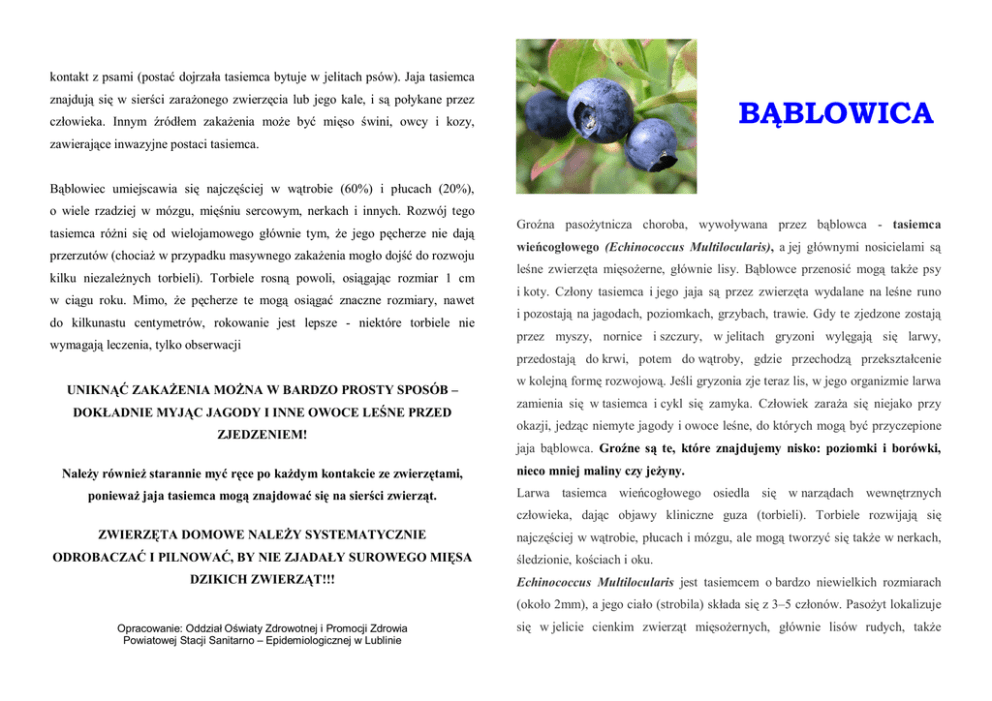 kontakt z psami (postać dojrzała tasiemca bytuje w jelitach psów). Jaja tasiemca znajdują się w sierści zarażonego zwierzęcia lub jego kale, i są połykane przez BĄBLOWICA człowieka. Innym źródłem zakażenia może być mięso świni, owcy i kozy, zawierające inwazyjne postaci tasiemca. Bąblowiec umiejscawia się najczęściej w wątrobie (60%) i płucach (20%), o wiele rzadziej w mózgu, mięśniu sercowym, nerkach i innych. Rozwój tego tasiemca różni się od wielojamowego głównie tym, że jego pęcherze nie dają przerzutów (chociaż w przypadku masywnego zakażenia mogło dojść do rozwoju kilku niezależnych torbieli). Torbiele rosną powoli, osiągając rozmiar 1 cm w ciągu roku. Mimo, że pęcherze te mogą osiągać znaczne rozmiary, nawet do kilkunastu centymetrów, rokowanie jest lepsze - niektóre torbiele nie wymagają leczenia, tylko obserwacji Groźna pasożytnicza choroba, wywoływana przez bąblowca - tasiemca wieńcogłowego (Echinococcus Multilocularis), a jej głównymi nosicielami są leśne zwierzęta mięsożerne, głównie lisy. Bąblowce przenosić mogą także psy i koty. Człony tasiemca i jego jaja są przez zwierzęta wydalane na leśne runo i pozostają na jagodach, poziomkach, grzybach, trawie. Gdy te zjedzone zostają przez myszy, nornice i szczury, w jelitach gryzoni wylęgają się larwy, przedostają do krwi, potem do wątroby, gdzie przechodzą przekształcenie UNIKNĄĆ ZAKAŻENIA MOŻNA W BARDZO PROSTY SPOSÓB – DOKŁADNIE MYJĄC JAGODY I INNE OWOCE LEŚNE PRZED ZJEDZENIEM! w kolejną formę rozwojową. Jeśli gryzonia zje teraz lis, w jego organizmie larwa zamienia się w tasiemca i cykl się zamyka. Człowiek zaraża się niejako przy okazji, jedząc niemyte jagody i owoce leśne, do których mogą być przyczepione jaja bąblowca. Groźne są te, które znajdujemy nisko: poziomki i borówki, Należy również starannie myć ręce po każdym kontakcie ze zwierzętami, ponieważ jaja tasiemca mogą znajdować się na sierści zwierząt. nieco mniej maliny czy jeżyny. Larwa tasiemca wieńcogłowego osiedla się w narządach wewnętrznych człowieka, dając objawy kliniczne guza (torbieli). Torbiele rozwijają się ZWIERZĘTA DOMOWE NALEŻY SYSTEMATYCZNIE ODROBACZAĆ I PILNOWAĆ, BY NIE ZJADAŁY SUROWEGO MIĘSA DZIKICH ZWIERZĄT!!! najczęściej w wątrobie, płucach i mózgu, ale mogą tworzyć się także w nerkach, śledzionie, kościach i oku. Echinococcus Multilocularis jest tasiemcem o bardzo niewielkich rozmiarach (około 2mm), a jego ciało (strobila) składa się z 3–5 członów. Pasożyt lokalizuje Opracowanie: Oddział Oświaty Zdrowotnej i Promocji Zdrowia Powiatowej Stacji Sanitarno – Epidemiologicznej w Lublinie się w jelicie cienkim zwierząt mięsożernych, głównie lisów rudych, także jenotów, wilków, znacznie rzadziej psów i kotów. Człon maciczny (ostatni) zawiera od 200 do 600 jaj o wielkości około 0,04 mm, bardzo odpornych na warunki środowiska zewnętrznego, a zwłaszcza niskie temperatury. Ludzie na terenach, gdzie bytują lisy powinni zachowywać szczególną ostrożność – nie jeść owoców i warzyw bez mycia. Grupy wysokiego ryzyka to myśliwi, garbarze, leśnicy, zbieracze runa leśnego, rolnicy oraz lekarze weterynarii. W TEMPERATURZE – 27 ° C JAJA BĄBLOWCA WIEŃCOGŁOWEGO Objawy bąblowicy PRZEŻYWAJĄ 54 DNI, A INWAZYJNOŚĆ TRACĄ PO 96 GODZINACH Zależą od umiejscowienia torbieli. Zwykle są następstwem ucisku wywieranego PRZEBYWANIA W TEMPERATURZE – 70 ° C ! przez torbiel na sąsiednie tkanki i jej powiększania się. Niekiedy brak objawów aż do chwili pęknięcia torbieli, które w płucach powoduje rodzaj wymiotów, Ze względu na długotrwałą przeżywalność form inwazyjnych w niskich temperaturach, uważany jest za typowego pasożyta „zimnych stref”. Jego obecność notowana jest nawet w okolicach koła podbiegunowego. Po raz pierwszy w Polsce bąblowca wykryto w 1994 r. u lisów w województwie pomorskim. Kolejne badania ujawniły jego powszechne występowanie polegających na wylewaniu się wodnistego płynu z ust przy silnym kaszlu. Jeżeli torbiel usadawia się w wątrobie, może dać objawy pobolewania w prawym podżebrzu, złego samopoczucia, a w przypadku ucisku na drogi żółciowe również żółtaczki. W innych przypadkach rozpoznanie ustala się przypadkowo, przy badaniu radiologicznym z powodu podejrzenia innej choroby. w województwach: warmińsko-mazurskim i podkarpackim. Leczenie bąblowicy wielojamowej Bąblowica wielojamowa (alweolarna echinokokoza, AE) występuje na świecie w naturalnych ogniskach endemicznych w Szwajcarii, Niemczech, Francji, na Alasce oraz w Japonii i na Syberii. W Polsce również obserwowano pojedyncze przypadki zachorowań. U ludzi jest chorobą wywoływaną przez formę larwalną tasiemca. W jej przebiegu następuje wzrost postaci larwalnych pasożyta najczęściej w wątrobie (99% przypadków), rzadziej płucach i mózgu. Powstające przerzuty do sąsiednich oraz odległych narządów w formie radykalny zabieg chirurgiczny usuwający zmianę oraz co najmniej dwuletnią chemioterapię przeciwpasożytniczą. Niezbędne są badania kontrolne w ciągu kolejnych 10 lat. W przypadkach nieoperacyjnych po częściowej resekcji zmiany lub po przeszczepach wątroby obowiązuje wieloletnia chemioterapia i częste badania kontrolne. nacieków przypominają zmiany nowotworowe. Rozwój choroby jest przewlekły. Zmiany kliniczne AE pojawiają się dopiero po 10-15 latach. Długotrwały okres wylęgania się choroby utrudnia lub uniemożliwia precyzyjne określenie źródła zarażenia, którym może być kontakt z lisem lub zanieczyszczone odchodami owoce, warzywa i woda. Leczenie bąblowicy wielojamowej jest długotrwałe i kosztowne. Obejmuje Bąblowica pęcherzowa (wywoływana przez bąblowca pęcherzowego – Echinococcus granulosus) Bąblowica pęcherzowa zdarza się w Polsce znacznie częściej, niż wielojamowa, rocznie