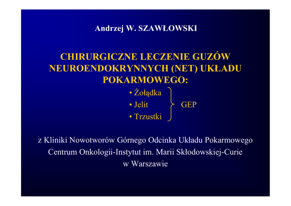 Andrzej W. SZAWŁOWSKI CHIRURGICZNE LECZENIE GUZÓW NEUROENDOKRYNNYCH (NET) UKŁADU POKARMOWEGO: • Żołądka • Jelit • Trzustki GEP z Kliniki Nowotworów Górnego Odcinka Układu Pokarmowego Centrum Onkologii-Instytut im. Marii Skłodowskiej-Curie w Warszawie GUZY NEUROENDOKRYNNE (NET) Podział embriologiczny* Początkowe prajelito (Foregut) • przełyk • żołądek • dwunastnica • trzustka • drogi żółciowe zewnątrzwątrobowe • płuca • grasica • krtań Środkowe prajelito (Midgut) Końcowe prajelito (Hindgut) • jelito czcze (jejunum) • jelito kręte (ileum) • wyrostek robaczkowy • prawa połowa okrężnicy (coecum/colon ascendens/ colon transversum**) • wątroba • jajnik • szyjka macicy • jądra • lewa połowa okrężnicy (colon transversum**/ colon descendens/ colon sigmoideum) • odbytnica * Wg Willams E.D., Sandler M., Lancet, 1963 ** Granica podziału: poziom tętnicy okrężniczej środkowej (a. colica media) A. W. Szawłowski Centrum Onkologii Warszawa GEP-NET Możliwości leczenia CHIRURGIA: → chirurgia endoskopowa Leczenie skojarzone FARMAKOTERAPIA: → analogi somatostatyny → interferon α → chemioterapia Bioterapia Leczenie wspomagające: → → → → → inhibitory pompy protonowej leczenie hiper- / hiopoglikemii leczenie przeciwbiegunkowe leczenie bólu leczenie żylnej choroby zakrzepowo-zatorowej A. W. Szawłowski Centrum Onkologii Warszawa GEP-NET Aspekty leczenia chirurgicznego Epidemiologia: → Małe zagrożenie (10-13 pts/ 1.000.000) → GEP stanowi 70% NET → 2% nowotworów układu pokarmowego Diagnostyka i stopniowanie: → Rzadko przypadki wczesne → Guzy pojedyncze (sporadyczne) → Guzy mnogie: 9 wieloogniskowe 9 zespoły wielogruczołowe (MEN) Czynniki biologiczne: → Czynne hormonalnie – 20% → Nieczynne hormonalnie – 80% → Niski wskaźnik proliferacji Uwarunkowania onkologiczne: → Nowotwory łagodne (większość) → Nowotwory złośliwe (mniejszość) Rokowanie: Dobre A. W. Szawłowski Centrum Onkologii Warszawa GEP-NET Formy leczenia chirurgicznego Leczenie z intencją wyleczenia (radykalne) CHIRURGIA Leczenie paliatywne (poprawa jakości życia) → Leczenie żółtaczki mechanicznej 9 Protezowanie 9 By-pass → Leczenie niedrożności przewodu pokarmowego 9 By-pass 9 Paliatywna resekcja → Leczenie krwawienia z przewodu pokarmowego → Leczenie bólu (np. neuroliza splotu trzewnego) → Leczenie przerzutów 9 9 9 9 Resekcja Ablacja Embolizacja Transplantacja Leczenie cytoredukcyjne (zmniejszenie masy nowotworu ≈90%) Leczenie skojarzone → Chirurgia → Chemioterapia → Radioterapia A. W. Szawłowski Centrum Onkologii Warszawa GEP-NET Endokrynne guzy żołądka KLINICZNY PROBLEM DLA CHIRURGA: Występowanie: 1% nowotworów żołądka Postać histologiczna: Rakowiak (carcinoid) Budowa histologiczna: → Komórki enterochromafinowe (EC) → Komórki enterochromafinopodobne (ECL) dobrze zróżnicowane Typy ECL: → Typ 1 (75%): związany z przewlekłym zanikowym nieżytem żołądka → Typ 2 (10%): związany z zespołem Zollinger-Ellisona (MEN-1) → Typ 3 (15%): pojedyncze guzy Obraz makroskopowy: Polip A. W. Szawłowski Centrum Onkologii Warszawa GEP-NET Taktyka leczenia rakowiaków żołądka Typ ECL 1 i 2: → polipy < 1 cm → 1-6 polipów ≥ 1 cm nadzór endoskopowy 1 x rok EUS + endoskopowa polipektomia + nadzór endoskopowy → ≥ 6 polipów ≥ 1 cm ograniczone do dystalnej części żołądka: antrektomia → mnogie polipy ≥ 1 cm w różnych miejscach żołądka: gastrektomia → postacie złośliwe gastrektomia + limfadenektomia D2 Typ ECL 3 + guzy niskozróżnicowane: → gastrektomia + limfadenektomia D2 A. W. Szawłowski Centrum Onkologii Warszawa GEP-NET Leczenie chirurgiczne PODSUMOWANIE: Neuroendokrynne guzy układu pokarmowego stanowią interdyscyplinarny problem onkologiczny : → → → → → → endokrynologia / gastroenterologia chirurgia patologia chemioterapia medycyna nuklearna radiologia interwencyjna Skuteczne leczenie chirurgiczne możliwe jest tylko w ośrodkach wysokospecjalistycznych Dla wielu chorych (większości?), z uwagi na stopień zaawansowania, optymalne leczenie polega na farmakoterapii, szczególnie uzasadnionej w przypadku nowotworów hormonalnie czynnych. A. W. Szawłowski Centrum Onkologii Warszawa DZIĘKUJĘ PAŃSTWU ZA UWAGĘ A. W. Szawłowski Centrum Onkologii Warszawa