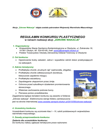 Akcja „Zdrowe Wakacje” objęta została patronatem Wojewody Warmińsko-Mazurskiego REGULAMIN KONKURSU PLASTYCZNEGO w ramach realizacji akcji „ZDROWE WAKACJE” 1. Organizatorzy Wojewódzka Stacja Sanitarno-Epidemiologiczna w Olsztynie, ul. Żołnierska 16, 10-561 Olsztyn, tel. 524-83-85, mail: [email protected] Polskie Towarzystwo Oświaty Zdrowotnej Oddział Terenowy w Olsztynie 2. Cel konkursu Ograniczenie liczby zakażeń, zatruć i wypadków wśród dzieci przebywających na wakacjach. 3. Zakres tematyczny Profilaktyka chorób „brudnych rąk” (salmonella, shigella). Profilaktyka chorób odkleszczowych (borelioza, kleszczowe zapalenie mózgu). Profilaktyka wścieklizny. Zapobieganie ukąszeniom przez żmije. Ochrona przed szkodliwym działaniem promieniowania słonecznego. Właściwe zachowania podczas burzy. Pierwsza pomoc przedlekarska. Zagadnienia będące tematem konkursu są zawarte w folderze „Zdrowe wakacje”. Elektroniczna wersja folderu zamieszczona jest na stronie internetowej www.oswiata.sanepid.olsztyn.pl/2010/08/zdrowe-wakacje/ 4. Uczestnicy konkursu Uczestnikami konkursu są uczniowie klas I – VI, szkół podstawowych województwa warmińsko-mazurskiego. 5. Zasady przeprowadzenia konkursu Zadania dla uczestników konkursu: Do konkursu należy zgłaszać tematyczne prace wykonane: 1 w technikach: malarstwo, rysunek w formacie A-3 na materiale podkładowym: papier, karton (mogą być kolorowe). Każda szkoła podstawowa może zgłosić do konkursu maksymalnie 4 prace, w tym: z kl. I – III - dwie prace z kl. IV – VI - dwie prace. 6. Sposób opisania prac konkursowych Do pracy dołączyć należy kopertę zawierającą informacje dotyczące uczestnika konkursu: imię i nazwisko ucznia; imię i nazwisko nauczyciela uczestniczącego w przygotowaniu ucznia do konkursu; adres szkoły wraz z numerem telefonu; zgodę przedstawiciela ustawowego dziecka, które nie ukończyło 18 roku życia na udział w konkursie (zgoda stanowi załącznik do regulaminu konkursu). Prace konkursowe muszą zostać opatrzone godłem. Godło jest to symbol (kwiatek, znaczek, rysunek, nazwa, itp.) umieszczany na rewersie pracy (nie wolno umieszczać danych osobowych ucznia i adresu szkoły na pracy) oraz na kopercie (godło musi być takie samo dla pracy i na kopercie) Uwaga! Nieprawidłowo oznakowane lub nieoznakowane prace, nie zawierające pełnych danych wskazanych wyżej, nie będą mogły walczyć o nagrody. 7. Czas trwania konkursu Etap szkolny: od 1 marca 2011 do 10 czerwca 2011. Etap wojewódzki: od 11 czerwca 2011 do 1 września 2011. 8. Sposób przekazania prac Osobiście lub przesyłką do dnia 10 czerwca 2011 r. do godziny 14.00 na adres: Wojewódzka Stacja Sanitarno-Epidemiologiczna w Olsztynie, Oddział Promocji Zdrowia i Oświaty Zdrowotne, ul. Żołnierska 16, 10-561 Olsztyn (II piętro, pokoje 222,216,225) z dopiskiem na kopercie „Zdrowe wakacje”. 9. Osoby odpowiedzialne za przeprowadzenie poszczególnych etapów konkursu oraz ich zadania Na poziomie szkolnym: nauczyciele wyznaczeni przez dyrektora szkoły. Skład szkolnej komisji konkursowej powołuje dyrektor szkoły. Na poziomie wojewódzkim: komisja wojewódzka powołana przez organizatorów konkursu. Komisja na poszczególnych etapach powinna składać się minimum z 3 osób. 10. Kryteria oceny Oceny prac dokona komisja, w skład której wejdą przedstawiciele: Wojewódzkiej Stacji Sanitarno-Epidemiologicznej, Polskiego Towarzystwa Oświaty Zdrowotnej, Kuratorium Oświaty, plastyk. Prace oceniane będą pod względem: zgodności z regulaminem (tematyka, wielkość pracy) estetyki wykonania pracy. 2 12. Zasady nagradzania. Liczba laureatów Na etapie wojewódzkim wyłonionych zostanie 6 laureatów: - 3 laureatów z kl. I –III - 3 laureatów z kl. IV – VI. 13. Rodzaj nagród Etap wojewódzki: dyplomy oraz nagrody rzeczowe ufundowane przez Warmińsko-Mazurskiego Państwowego Wojewódzkiego Inspektora Sanitarnego w Olsztynie. Wyniki etapu wojewódzkiego konkursu zostaną zamieszczone na stronie internetowej Wojewódzkiej Stacji Sanitarno-Epidemiologicznej w Olsztynie w dniu 5 września 2011 pod adresem www.oswiata.sanepid.olsztyn.pl Szkoły zostaną powiadomione listownie o terminie i sposobie przekazania nagród laureatom konkursu. Załącznik Nr 1: „Zgoda przedstawiciela ustawowego dziecka, które nie ukończyło 18 roku życia, na udział w konkursie”. Podpisanie oświadczenie jest równoznaczne ze zrzeczeniem się praw autorskich swoich prac na rzecz organizatora konkursu. Organizatorzy konkursu: Wojewódzka Stacja Sanitarno-Epidemiologiczna w Olsztynie Polskie Towarzystwo Oświaty Zdrowotnej Oddział Terenowy w Olsztynie 3