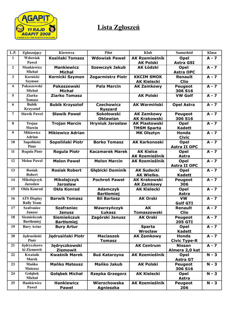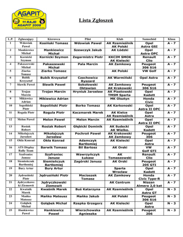 Lista Zgłoszeń L.P. 1 2 3 4 5 6 7 8 Zgłaszający Wdowiak Paweł Mankiewicz Michał Kornicki Szymon Pakaszewski Michał Ziarko Tomasz Bubik Krzysztof Sławik Paweł Kierowca Kosiński Tomasz Pilot Wdowiak Paweł Mankiewicz Michał Kornicki Szymon Szewczyk Jakub Zegarmistrz Piotr Pakaszewski Michał Ziarko Tomasz Pala Marcin Bubik Krzysztof Czechowicz Ryszard Sokołowski Oktawian Hryniuk Jarosław Sławik Paweł Trojan Marcin 11 Trojan Marcin Mikiewicz Adrian Sopoliński Piotr Rogula Piotr 12 Melon Paweł Melon Paweł Melon Marcin 13 Rosiak Robert Mikołajczyk Jarosław Okła Konrad Rosiak Robert Głębicki Dominik Mikołajczyk Jarosław Okła Konrad Pochroń Paweł ATS Display Rally Team Szafraniec Janusz Siemieńczuk Bartłomiej Bury Artur Barwik Tomasz Szafraniec Janusz Siemieńczuk Bartłomiej Bury Artur Wawrzyńczyk Łukasz Zagórski Janusz Jędrusiński Piotr Jędryczkows ki Ziemowit Kwaśnik Marek Mańko Mateusz Gołąbek Michał Hankiewicz Paweł Jędrusiński Piotr Maciaszek Tomasz 9 10 14 15 16 17 18 19 20 21 22 23 24 25 Mikiewicz Adrian Klub AK Rzemieślnik AK Polski AK Łódzki Klasa A-7 AK Polski Samochód Opel Astra GSI Opel Astra OPC Renault Clio Peugeot 306 S16 VW Golf AK Warmiński Opel Astra A-7 AK Zamkowy AK Krakowski AK Piastowski TMSM Sparta MK Olsztyn Peugeot 306 S16 Opel Kadett Honda Civic Opel Astra II OPC Opel Astra Opel Astra II OPC Opel Kadett Peugeot 306 Opel Astra VW Golf GTI Renault Clio Peugeot 205 GTI Opel Kadett Honda Civic Type-R Nissan Almera 2,0 kat Opel Astra GT Peugeot 306 S16 Opel Astra Peugeot 206 A-7 KKCIM SMOK AK Kielecki AK Zamkowy Sopoliński Piotr Borko Tomasz AK Karkonoski Rogula Piotr Kaczmarek Marek AK Kielce AK Rzemieślnik AK Rzemieślnik Adamczyk Bartłomiej Bil Bartosz AK Sudecki AK Wielko. AK Krakowski AK Zamkowy AK Kielecki AK Orski AK Tomaszowski AK Orski Sparta Wrocław AK Zamkowy Jędryczkowski Ziemowit Kwaśnik Marek AK Centrum Buś Katarzyna AK Rzemieślnik Mańko Mateusz Mańko Jakub AK Polski Gołąbek Michał Rzepka Grzegorz AK Kielecki Hankiewicz Paweł Wierzchowska Agnieszka AK Rzemieślnik A-7 A-7 A-7 A-7 A-7 A-7 A-7 A-7 A-7 A-7 A-7 A-7 A-7 A-7 A-7 A-7 A-7 A-7 N-3 N-3 N-3 N-3 26 27 28 29 30 31 32 33 34 35 36 37 38 39 40 41 42 43 44 45 46 47 48 49 50 51 52 53 54 Gładysz Marcin Pachuta Krystian Czekan Andrzej Korzeniewski Radosław Abramiuk Hubert Jankowski Michał Bakuła Jarosław Zaborniak Bartosz Zyser Adam Gładysz Marcin Pachuta Krystian Reising Paweł Fiołek Rafał Czekan Andrzej Czekan Błażej Stocki Edward Abramiuk Hubert Korzeniewski Radosław Gustaw Grzegorz AK Lubelski Jankowski Michał Sudoł Patryk OKR Bakuła Jarosław Martynek Mateusz Dudziński Patryk Ochocki Rafał Rutkowska Luiza Krzyszycha Maciej Wojciech Złotnicki Rechnoi Michał Piękoś Szymon Kwiatkowski Konrad Całek Michał Dudziński Patryk Heller Kamil Ochocki Rafał Skiba Wojciech Rutkowska Luiza Plucha Ryszard Krzyszycha Maciej Złotnicki Łukasz Ireneusz Pleskot Złomańczuk Michał Rzeżuchowsk Jan Klimiuk Bogumił Świątecki Grzegorz Cywiński Maciej Grotkowski Radosław Urbaniak Wojciech Jędras Przemysław Rawski Maciej Lewandowski Piotr Thrun Mikołaj Złomańczuk Michał Rzeżuchowski Jan Klimiuk Bogumił Złotnicki Wojciech Bała Marek Piękoś Szymon Kwiatkowski Konrad Całek Michał Świątecki Grzegorz Cywiński Maciej Grotkowski Radosław Urbaniak Wojciech Jędras Przemysław Rawski Maciej Lewandowski Piotr Thrun Mikołaj OKR AK Warmiński Zaborniak Bartosz Zyser Adam Rechnio Michał AK Kielecki AK Małopolski AK Ziemi Kłodzkiej AK Orski AK Warminski AK Cieszyński AK Warmiński OKR AK Cieszyński AK Centrum SSSA Orski AK Centrum AK Polski OKR AK Rzemieślnik AK Polski AK Rzemieślnik AK Małopolski Bąk Marcin AK Centrum Puszkiel Kacper AK Karkonoski AK Sudecki SSS AK Orski AK Podlaski Spar. Wrocław AK Radomski AK Podlaski Bagniuk Piotr Nowocień Paweł Walczak Piotr AK Krakowski Skrzywan Paweł Walczak Karol AK Rzemieślnik AK Polski AK Warmiński Bildziukiewicz Dariusz Korpalski Tomasz AK. Warmiński MK Olsztyn AK Orski Dargiewicz Piotr TMSM Sparta Wrocław AK Warmiński Skóra Tomasz AK Orski Peugeot 206 Opel Astra Honda Civic Type-R Peugeot 206 Toyota Corolla Peugeot 206XS Peugeot 206 N-3 N-3 N-3 A-6 A-6 A-6 A-6 A-6 Peugeot 206XS Peugeot 206XS Citroen C2 Citroen Saxo Peugeot 206 XS Citroen Saxo Citroen Saxo Peugeot 206 BMW 318 is BMW 318 is BMW 318 is Nissan Micra Nissan Micra Citroen Saxo VTS Honda Civic VTI Daewoo Lanos Citroen Saxo Peugeot 106 Rallye VW Polo GTI Daewoo Lanos Peugeot 106 Rallye A-6 A-6 A-6 A-6 A-6 A-6 A-6 A-6 RWD-3 RWD-3 RWD-3 A-5 A-5 N-2 N-2 N-2 N-2 N-2 N-2 N-2 N-2 55 56 57 58 59 60 61 62 63 64 65 66 67 68 Sobocin Łukasz Krzysztof Szeszko Serwiak Edgar Wojciechows ki Robert Stankiewicz Jagna Sosnowski Henryk Dobrowolski Michał Typa Radosław Sobocin Łukasz J&S ENERGY Rally Team Butruk Kamil Staniszewski Zbigniew Karłowski Wojciech Pawliński Jarosław Abramowski Marcin Dytko Paweł Dytko Tomasz Butruk Kamil Wilk Maciej Staniszewski Zbigniew Karłowski Wojciech Pawliński Jarosław Abramowski Marcin Kuchar Tomasz Rozwadowski Sebastian Kopera Dominik 69 70 71 72 73 74 75 76 77 Trembicki Tomasz Frankowski Hubert Dembowski Tomasz Predko Krzysztof Karnabal Stefan Bębenek Michał Mariusz Małyszczycki Stefanicki Paweł Krzysztof Szeszko Nerwiak Edgar Wojciechowski Robert Kastyak Przemysław Sosnowski Henryk Dobrowolski Marcin Typa Radosław Trembicki Tomasz Frankowski Hubert Dembowski Tomasz Predko Krzysztof Karnabal Stefan Bębenek Michał Mariusz Małyszczycki Stefanicki Paweł Niewiarowski Cezary Wojciech Jermakow AP Podlaski OKR AK Szczeciński Janik Krzysztof Stankiewicz Jagna Galuszka Adam Dobrowolski Michał Siatkowski Daniel Pawlińska Pamela Łukasz Włoch Dymarski Daniel AK Centrum AK Śląski AK Polski OKR AK Suwalski AK Ziemi Tys. AK Sudecki MK Lidzbark Warmiński AK Rzemieślnik AK Opolski AK Podlaski AK Małopolski AK Polski AK Warmiński AK Polski AK Centrum AK Wielkopolski AK Rzemieślni