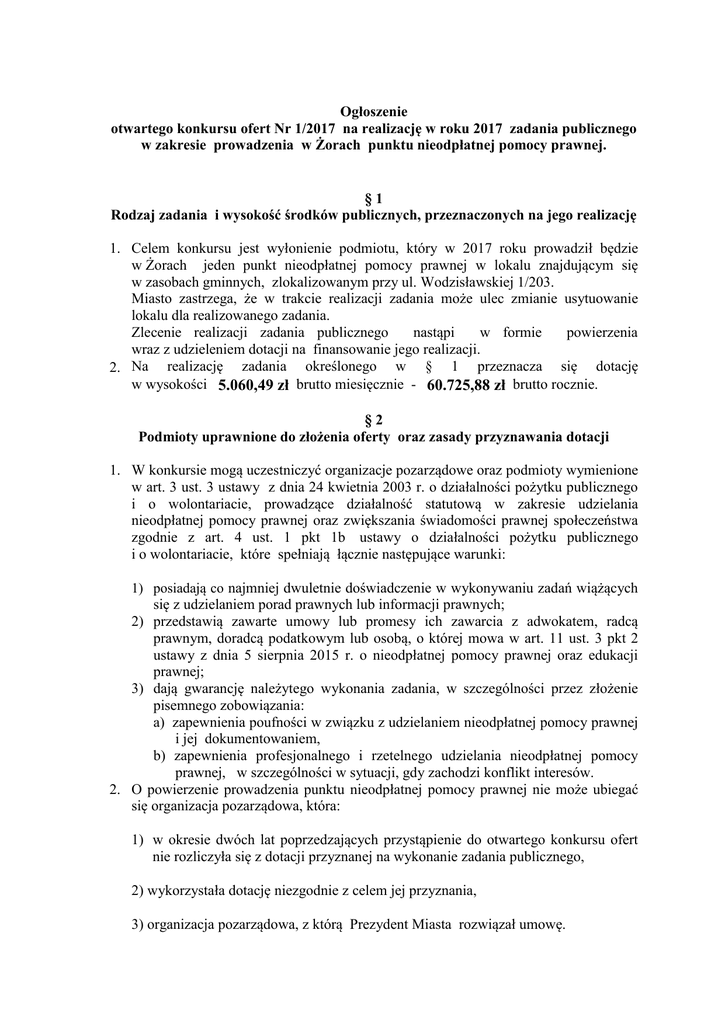 Ogłoszenie otwartego konkursu ofert Nr 1/2017 na realizację w roku 2017 zadania publicznego w zakresie prowadzenia w Żorach punktu nieodpłatnej pomocy prawnej. §1 Rodzaj zadania i wysokość środków publicznych, przeznaczonych na jego realizację 1. Celem konkursu jest wyłonienie podmiotu, który w 2017 roku prowadził będzie w Żorach jeden punkt nieodpłatnej pomocy prawnej w lokalu znajdującym się w zasobach gminnych, zlokalizowanym przy ul. Wodzisławskiej 1/203. Miasto zastrzega, że w trakcie realizacji zadania może ulec zmianie usytuowanie lokalu dla realizowanego zadania. Zlecenie realizacji zadania publicznego nastąpi w formie powierzenia wraz z udzieleniem dotacji na finansowanie jego realizacji. 2. Na realizację zadania określonego w § 1 przeznacza się dotację w wysokości 5.060,49 zł brutto miesięcznie - 60.725,88 zł brutto rocznie. §2 Podmioty uprawnione do złożenia oferty oraz zasady przyznawania dotacji 1. W konkursie mogą uczestniczyć organizacje pozarządowe oraz podmioty wymienione w art. 3 ust. 3 ustawy z dnia 24 kwietnia 2003 r. o działalności pożytku publicznego i o wolontariacie, prowadzące działalność statutową w zakresie udzielania nieodpłatnej pomocy prawnej oraz zwiększania świadomości prawnej społeczeństwa zgodnie z art. 4 ust. 1 pkt 1b ustawy o działalności pożytku publicznego i o wolontariacie, które spełniają łącznie następujące warunki: 1) posiadają co najmniej dwuletnie doświadczenie w wykonywaniu zadań wiążących się z udzielaniem porad prawnych lub informacji prawnych; 2) przedstawią zawarte umowy lub promesy ich zawarcia z adwokatem, radcą prawnym, doradcą podatkowym lub osobą, o której mowa w art. 11 ust. 3 pkt 2 ustawy z dnia 5 sierpnia 2015 r. o nieodpłatnej pomocy prawnej oraz edukacji prawnej; 3) dają gwarancję należytego wykonania zadania, w szczególności przez złożenie pisemnego zobowiązania: a) zapewnienia poufności w związku z udzielaniem nieodpłatnej pomocy prawnej i jej dokumentowaniem, b) zapewnienia profesjonalnego i rzetelnego udzielania nieodpłatnej pomocy prawnej, w szczególności w sytuacji, gdy zachodzi konflikt interesów. 2. O powierzenie prowadzenia punktu nieodpłatnej pomocy prawnej nie może ubiegać się organizacja pozarządowa, która: 1) w okresie dwóch lat poprzedzających przystąpienie do otwartego konkursu ofert nie rozliczyła się z dotacji przyznanej na wykonanie zadania publicznego, 2) wykorzystała dotację niezgodnie z celem jej przyznania, 3) organizacja pozarządowa, z którą Prezydent Miasta rozwiązał umowę. Termin dwóch lat biegnie odpowiednio od dnia rozliczenia się z dotacji i zwrotu nienależnych środków wraz z odsetkami albo rozwiązania umowy. 1. Postępowanie konkursowe odbywać się będzie z uwzględnieniem zasad przyznawania dotacji określonych w ustawie: - z dnia 24. kwietnia 2003 roku o działalności pożytku publicznego i o wolontariacie, - z dnia 05. sierpnia 2015 r. o nieodpłatnej pomocy prawnej oraz edukacji prawnej, - z dnia 27. sierpnia 2009 r. o finansach publicznych. 2. Minimalna liczba punktów uprawniająca oferenta do otrzymania dotacji wynosi 50 % możliwej do uzyskania sumy punktów. 3. W przypadku, gdy na konkurs nie wpłynie żadna oferta lub żadna ze złożonych ofert nie spełni wymogów zawartych w ogłoszeniu, konkurs zostanie unieważniony. 4. Prezydent może odmówić podmiotowi wyłonionemu w konkursie przyznania dotacji i podpisania umowy w przypadku, gdy okaże się iż podmiot lub jego reprezentanci utracą zdolność do czynności prawnych lub zostaną ujawnione nieznane wcześniej okoliczności podważające wiarygodność merytoryczną lub finansową oferenta. 5. Oferty, które nie spełnią wymogów formalnych, nie będą podlegać rozpatrywaniu pod względem merytorycznym. §3 Warunki realizacji zadania publicznego 1. Podmiot przystępujący do konkursu ofert zobowiązuje się do realizacji zadania w okresie od 01.01.2017 r. do 31.12.2017 r. 2. Nieodpłatna pomoc prawna ma być udzielana codziennie od poniedziałku do piątku przez co najmniej 4 godziny dziennie, z wyłączeniem dni ustawowo wolnych od pracy, według szczegółowego harmonogramu uzgodnionego ze Zleceniodawcą przed zawarciem umowy. 3. Zakres udzielanej pomocy prawnej szczegółowo określa ustawa o nieodpłatnej pomocy prawnej oraz edukacji prawnej oraz właściwe Rozporządzenie Ministra Sprawiedliwości. 4. Nieodpłatnej pomocy prawnej udzielać powinni: 1) adwokaci i radcy prawni, 2) doradcy podatkowi (w zakresie prawa podatkowego z wyłączeniem spraw podatkowych związanych z prowadzeniem działalności gospodarczej), 3) osoba, która: a) ukończyła wyższe studia prawnicze i uzyskała tytuł magistra lub zagraniczne studia prawnicze uznane w Rzeczypospolitej Polskiej, b) posiada co najmniej trzyletnie doświadczenie w wykonywaniu wymagających wiedzy prawniczej czynności bezpośrednio związanych ze świadczeniem pomocy prawnej, 1 c) korzysta z pełni praw publicznych oraz ma pełną zdolność do czynności prawnych, d) nie była karana za umyślne przestępstwo ścigane z oskarżenia publicznego lub przestępstwo skarbowe. 5. Zadanie przedstawione w ofercie może być realizowane wspólnie przez kilku oferentów, jeżeli oferta została złożona wspólnie, zgodnie z art. 14 ust. 2-5 ustawy z dnia 4 kwietnia 2003 roku o działalności pożytku publicznego i o wolontariacie. W przypadku realizowania zadania wspólnie - wszyscy oferenci odpowiadają solidarnie za realizację zadania. 6. Zadanie publiczne przedstawione w ofercie nie może być realizowane przez podmiot niebędący stroną umowy, zgodnie z art. 16 ust. 4 ustawy dnia 24 kwietnia 2003 r. o działalności pożytku publicznego i o wolontariacie. Szczegółowe warunki realizacji, finansowania i rozliczenia zadania ureguluje umowa zawarta przed rozpoczęciem realizacji zadania pomiędzy miastem Żory, a Oferentem. Umowa sporządzona zostanie według wz