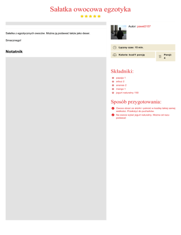 Sałatka owocowa egzotyka Autor: pawel2157 Sałatka z egzotycznych owoców. Można ją podawać także jako deser. Smacznego! Łączny czas: 15 min. Notatnik Kalorie: kcal/1 porcję Porcji: 4 Składniki: papaja 1 arbuz 2 ananas 2 mango 1 jogurt naturalny 150 Sposób przygotowania: Owoce obrać ze skórki i pokroić w kostkę takiej samej wielkości. Przełożyć do pucharków. Na owoce wylać jogurt naturalny. Można od razu podawać