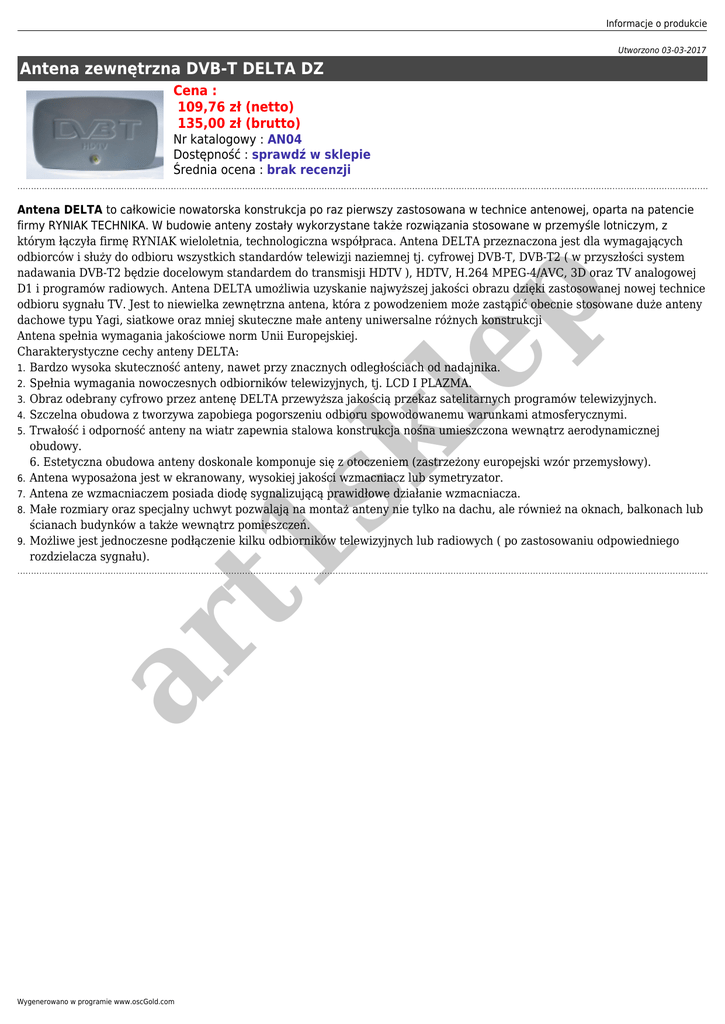 Informacje o produkcie Utworzono 03-03-2017 Antena zewnętrzna DVB-T DELTA DZ Cena : 109,76 zł (netto) 135,00 zł (brutto) Nr katalogowy : AN04 Dostępność : sprawdź w sklepie Średnia ocena : brak recenzji ar t1 sk le p Antena DELTA to całkowicie nowatorska konstrukcja po raz pierwszy zastosowana w technice antenowej, oparta na patencie firmy RYNIAK TECHNIKA. W budowie anteny zostały wykorzystane także rozwiązania stosowane w przemyśle lotniczym, z którym łączyła firmę RYNIAK wieloletnia, technologiczna współpraca. Antena DELTA przeznaczona jest dla wymagających odbiorców i służy do odbioru wszystkich standardów telewizji naziemnej tj. cyfrowej DVB-T, DVB-T2 ( w przyszłości system nadawania DVB-T2 będzie docelowym standardem do transmisji HDTV ), HDTV, H.264 MPEG-4/AVC, 3D oraz TV analogowej D1 i programów radiowych. Antena DELTA umożliwia uzyskanie najwyższej jakości obrazu dzięki zastosowanej nowej technice odbioru sygnału TV. Jest to niewielka zewnętrzna antena, która z powodzeniem może zastąpić obecnie stosowane duże anteny dachowe typu Yagi, siatkowe oraz mniej skuteczne małe anteny uniwersalne różnych konstrukcji Antena spełnia wymagania jakościowe norm Unii Europejskiej. Charakterystyczne cechy anteny DELTA: 1. Bardzo wysoka skuteczność anteny, nawet przy znacznych odległościach od nadajnika. 2. Spełnia wymagania nowoczesnych odbiorników telewizyjnych, tj. LCD I PLAZMA. 3. Obraz odebrany cyfrowo przez antenę DELTA przewyższa jakością przekaz satelitarnych programów telewizyjnych. 4. Szczelna obudowa z tworzywa zapobiega pogorszeniu odbioru spowodowanemu warunkami atmosferycznymi. 5. Trwałość i odporność anteny na wiatr zapewnia stalowa konstrukcja nośna umieszczona wewnątrz aerodynamicznej obudowy. 6. Estetyczna obudowa anteny doskonale komponuje się z otoczeniem (zastrzeżony europejski wzór przemysłowy). 6. Antena wyposażona jest w ekranowany, wysokiej jakości wzmacniacz lub symetryzator. 7. Antena ze wzmacniaczem posiada diodę sygnalizującą prawidłowe działanie wzmacniacza. 8. Małe rozmiary oraz specjalny uchwyt pozwalają na montaż anteny nie tylko na dachu, ale również na oknach, balkonach lub ścianach budynków a także wewnątrz pomieszczeń. 9. Możliwe jest jednoczesne podłączenie kilku odbiorników telewizyjnych lub radiowych ( po zastosowaniu odpowiedniego rozdzielacza sygnału). Wygenerowano w programie www.oscGold.com
