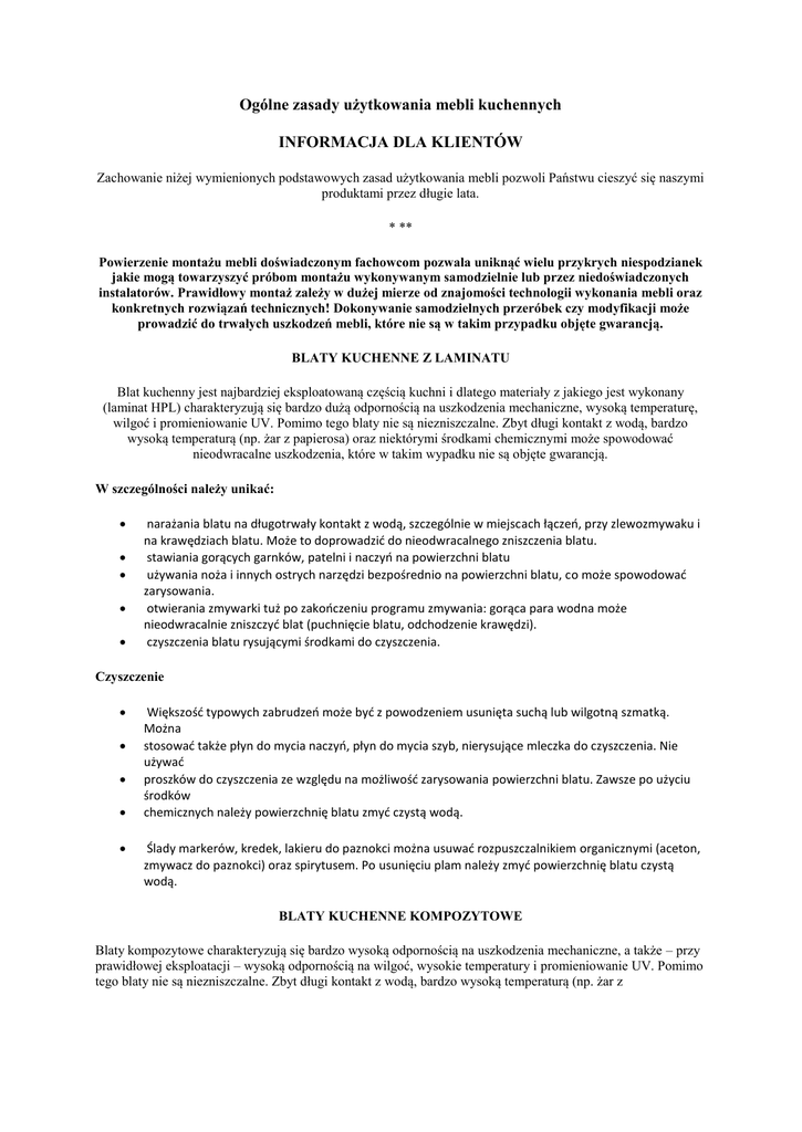 Ogólne zasady użytkowania mebli kuchennych INFORMACJA DLA KLIENTÓW Zachowanie niżej wymienionych podstawowych zasad użytkowania mebli pozwoli Państwu cieszyć się naszymi produktami przez długie lata. * ** Powierzenie montażu mebli doświadczonym fachowcom pozwala uniknąć wielu przykrych niespodzianek jakie mogą towarzyszyć próbom montażu wykonywanym samodzielnie lub przez niedoświadczonych instalatorów. Prawidłowy montaż zależy w dużej mierze od znajomości technologii wykonania mebli oraz konkretnych rozwiązań technicznych! Dokonywanie samodzielnych przeróbek czy modyfikacji może prowadzić do trwałych uszkodzeń mebli, które nie są w takim przypadku objęte gwarancją. BLATY KUCHENNE Z LAMINATU Blat kuchenny jest najbardziej eksploatowaną częścią kuchni i dlatego materiały z jakiego jest wykonany (laminat HPL) charakteryzują się bardzo dużą odpornością na uszkodzenia mechaniczne, wysoką temperaturę, wilgoć i promieniowanie UV. Pomimo tego blaty nie są niezniszczalne. Zbyt długi kontakt z wodą, bardzo wysoką temperaturą (np. żar z papierosa) oraz niektórymi środkami chemicznymi może spowodować nieodwracalne uszkodzenia, które w takim wypadku nie są objęte gwarancją. W szczególności należy unikać: narażania blatu na długotrwały kontakt z wodą, szczególnie w miejscach łączeo, przy zlewozmywaku i na krawędziach blatu. Może to doprowadzid do nieodwracalnego zniszczenia blatu. stawiania gorących garnków, patelni i naczyo na powierzchni blatu używania noża i innych ostrych narzędzi bezpośrednio na powierzchni blatu, co może spowodowad zarysowania. otwierania zmywarki tuż po zakooczeniu programu zmywania: gorąca para wodna może nieodwracalnie zniszczyd blat (puchnięcie blatu, odchodzenie krawędzi). czyszczenia blatu rysującymi środkami do czyszczenia. Czyszczenie Większośd typowych zabrudzeo może byd z powodzeniem usunięta suchą lub wilgotną szmatką. Można stosowad także płyn do mycia naczyo, płyn do mycia szyb, nierysujące mleczka do czyszczenia. Nie używad proszków do czyszczenia ze względu na możliwośd zarysowania powierzchni blatu. Zawsze po użyciu środków chemicznych należy powierzchnię blatu zmyd czystą wodą. Ślady markerów, kredek, lakieru do paznokci można usuwad rozpuszczalnikiem organicznymi (aceton, zmywacz do paznokci) oraz spirytusem. Po usunięciu plam należy zmyd powierzchnię blatu czystą wodą. BLATY KUCHENNE KOMPOZYTOWE Blaty kompozytowe charakteryzują się bardzo wysoką odpornością na uszkodzenia mechaniczne, a także – przy prawidłowej eksploatacji – wysoką odpornością na wilgoć, wysokie temperatury i promieniowanie UV. Pomimo tego blaty nie są niezniszczalne. Zbyt długi kontakt z wodą, bardzo wysoką temperaturą (np. żar z papierosa, gorący garnek itp.) oraz niektórymi środkami chemicznymi może spowodować nieodwracalne uszkodzenia, które w takim wypadku nie są objęte gwarancją. W szczególności należy unikać: narażania blatu na długotrwały kontakt z wodą w miejscach łączeo blatu ze zlewozmywakiem/umywalką oraz baterią. Może to doprowadzid do nieodwracalnego zniszczenia blatu. stawiania gorących garnków, patelni i naczyo bezpośrednio na powierzchni blatu. Może to doprowadzid do pęknięcia blatu. używania noża i innych ostrych narzędzi bezpośrednio na powierzchni blatu, co może spowodowad zarysowania. otwierania zmywarki tuż po zakooczeniu programu zmywania: gorąca para wodna może nieodwracalnie zniszczyd blat (puchnięcie blatu, odchodzenie krawędzi). czyszczenia blatu rysującymi środkami czyszczącymi. stosowania silnie żrących substancji chemicznych Czyszczenie większośd plam i zabrudzeo może byd usunięta miękką ściereczką i ciepłą wodą. Można użyd także nierysującego mleczka do czyszczenia, płynu do mycia naczyo. zmywacze farb, rozpuszczalniki, substancje do czyszczenia piekarników i metali, środki zawierające dwuchlorometan lub aceton, które rozleją się na powierzchnie blatu należy bezzwłocznie usunąd i spłukad dużą ilością wody z mydłem czerwone wino, cola, ocet, kawa, olej oraz pozostałości warzyw i owoców mogą powodowad plamy i zabrudzenia trudne do usunięcia. lakier do paznokci można usunąd zmywaczem nie zawierającym acetonu w przypadku uszkodzenia blatu kompozytowego (pęknięcia, porysowana powierzchnia itp.) istnieje możliwośd jego regeneracji. W takim przypadku należy skontaktowad się ze sprzedawcą. FRONTY MEBLOWE MDF -PCV Fronty oklejane folią PCV wykazują się dużą odpornością na uszkodzenia, niemniej ich trwałość zależy od prawidłowej eksploatacji. W szczególności należy unikać: narażania frontów na kontakt z wilgocią i gorącą parą wodną. używania acetonu do czyszczenia używania do czyszczenia rysujących środków czyszczących używania do czyszczenia ostrych szczotek, gąbek czy szmatek. gotowania bez włączonego wyciągu w okapie kuchennym Czyszczenie najlepiej używad miękkiej, lekko wilgotnej szmatki i łagodnych środków czyszczących zawsze po myciu wytrzed fronty miękką szmatką do sucha FRONTY MEBLOWE DREWNIANE I FORNIROWANE Meble kuchenne z frontami drewnianymi mogą różnić się od kuchni ekspozycyjnych. Drewno jest materiałem naturalnym, którego barwa i układ słojów są uzależnione od wielu czynników, dlatego mogą występować różnice w fakturze i barwie frontów co nie stanowi wady produktu. W produkcji frontów drewnianych stosujemy niezmechanizowane technologie wykonawcze, takie jak ręczne lakierowanie i szlifowanie. Specyfika pracy ręcznej powoduje, że mogą wystąpić niejednorodności powierzchni , które nie stanowią wady produktu i nie wpływają na jego funkcjonalność oraz trwałość. Fronty drewniane mogą w trakcie eksploatacji ujawniać niewielkie zmiany w kształcie i wymiarach wywołane specyficznymi warunkami eksploatacji (wilgotność, różnice temperatur, oświetlenie etc