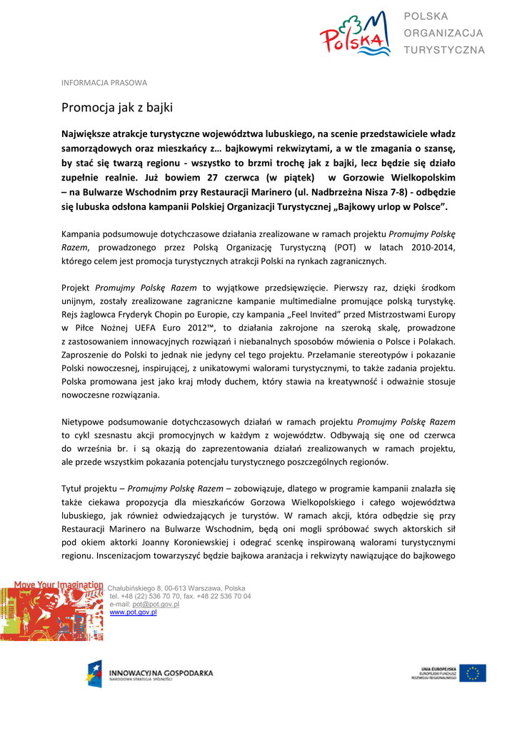 INFORMACJA PRASOWA Promocja jak z bajki Największe atrakcje turystyczne województwa lubuskiego, na scenie przedstawiciele władz samorządowych oraz mieszkańcy z… bajkowymi rekwizytami, a w tle zmagania o szansę, by stać się twarzą regionu - wszystko to brzmi trochę jak z bajki, lecz będzie się działo zupełnie realnie. Już bowiem 27 czerwca (w piątek) w Gorzowie Wielkopolskim – na Bulwarze Wschodnim przy Restauracji Marinero (ul. Nadbrzeżna Nisza 7-8) - odbędzie się lubuska odsłona kampanii Polskiej Organizacji Turystycznej „Bajkowy urlop w Polsce”. Kampania podsumowuje dotychczasowe działania zrealizowane w ramach projektu Promujmy Polskę Razem, prowadzonego przez Polską Organizację Turystyczną (POT) w latach 2010-2014, którego celem jest promocja turystycznych atrakcji Polski na rynkach zagranicznych. Projekt Promujmy Polskę Razem to wyjątkowe przedsięwzięcie. Pierwszy raz, dzięki środkom unijnym, zostały zrealizowane zagraniczne kampanie multimedialne promujące polską turystykę. Rejs żaglowca Fryderyk Chopin po Europie, czy kampania „Feel Invited” przed Mistrzostwami Europy w Piłce Nożnej UEFA Euro 2012™, to działania zakrojone na szeroką skalę, prowadzone z zastosowaniem innowacyjnych rozwiązań i niebanalnych sposobów mówienia o Polsce i Polakach. Zaproszenie do Polski to jednak nie jedyny cel tego projektu. Przełamanie stereotypów i pokazanie Polski nowoczesnej, inspirującej, z unikatowymi walorami turystycznymi, to także zadania projektu. Polska promowana jest jako kraj młody duchem, który stawia na kreatywność i odważnie stosuje nowoczesne rozwiązania. Nietypowe podsumowanie dotychczasowych działań w ramach projektu Promujmy Polskę Razem to cykl szesnastu akcji promocyjnych w każdym z województw. Odbywają się one od czerwca do września br. i są okazją do zaprezentowania działań zrealizowanych w ramach projektu, ale przede wszystkim pokazania potencjału turystycznego poszczególnych regionów. Tytuł projektu – Promujmy Polskę Razem – zobowiązuje, dlatego w programie kampanii znalazła się także ciekawa propozycja dla mieszkańców Gorzowa Wielkopolskiego i całego województwa lubuskiego, jak również odwiedzających je turystów. W ramach akcji, która odbędzie się przy Restauracji Marinero na Bulwarze Wschodnim, będą oni mogli spróbować swych aktorskich sił pod okiem aktorki Joanny Koroniewskiej i odegrać scenkę inspirowaną walorami turystycznymi regionu. Inscenizacjom towarzyszyć będzie bajkowa aranżacja i rekwizyty nawiązujące do bajkowego ul. Chałubińskiego 8, 00-613 Warszawa, Polska tel. +48 (22) 536 70 70, fax. +48 22 536 70 04 e-mail: [email protected] www.pot.gov.pl motywu, który jest stosowany w reklamach lubuskiego w kampanii realizowanej przez Polską Organizację Turystyczną. Jednak wspólna zabawa w bajkowo-turystyczne inscenizacje czy możliwość wystąpienia wspólnie z Joanną Koroniewską, choć wyjątkowe, to nie jedyne atrakcje dla uczestników. Każdy, kto pokaże na mini-scenie bajkową scenkę, inspirowaną atrakcjami turystycznymi regionu, będzie miał szansę zostać prawdziwą gwiazdą – twarzą lubuskiego! Plenerowe imprezy w poszczególnych województwach mają bowiem kontynuację w ramach – tym razem już ogólnopolskiego – konkursu „Zostań twarzą regionu”. Udział w konkursie mogą wziąć wszyscy autorzy scenicznych inscenizacji, a dla zwycięzców Polska Organizacja Turystyczna przygotowała niezwykłą nagrodę: możliwość udziału w prawdziwej kampanii reklamowej! W każdym z regionów wyłonione zostanie – w efekcie najpierw głosowania internautów, a później werdyktu jury – po jednej, najciekawszej bajkowo-turystycznej inscenizacji. Ich autorzy, laureaci konkursu, będą się mogli zobaczyć na ponad 250 billboardach, które zawisną na terenie całego kraju, a dodatkowo otrzymają honoraria w wysokości 2000 złotych. Wszystkie szczegóły i zasady konkursu zamieszczone są na stronie twarzregionu.pl. Jak na bajkową kampanię przystało, pora na morał: gdy działa się razem, można bardzo wiele zrobić dla promocji turystycznej Polski i każdego z regionów. Projekt Promujmy Polskę Razem jest tego doskonałym przykładem, a podsumowująca kampania ilustruje to w bardzo sugestywnej i zarazem niekonwencjonalnej formie. Jak się więc okazuje, nie tylko w bajkach wszystko dobrze się kończy! *** Akcja promocyjna w ramach kampanii „Bajkowy urlop w Polsce” podsumowującej projekt Promujmy Polskę Razem odbędzie się: 27 czerwca (piątek), przy restauracji Marinero, Bulwar Wschodni, ul. Nadbrzeżna Nisza 7-8 w godzinach 10:00 – 18:00. PARTNEREM KAMPANII W WOJEWÓDZTWIE LUBUSKIM JEST: