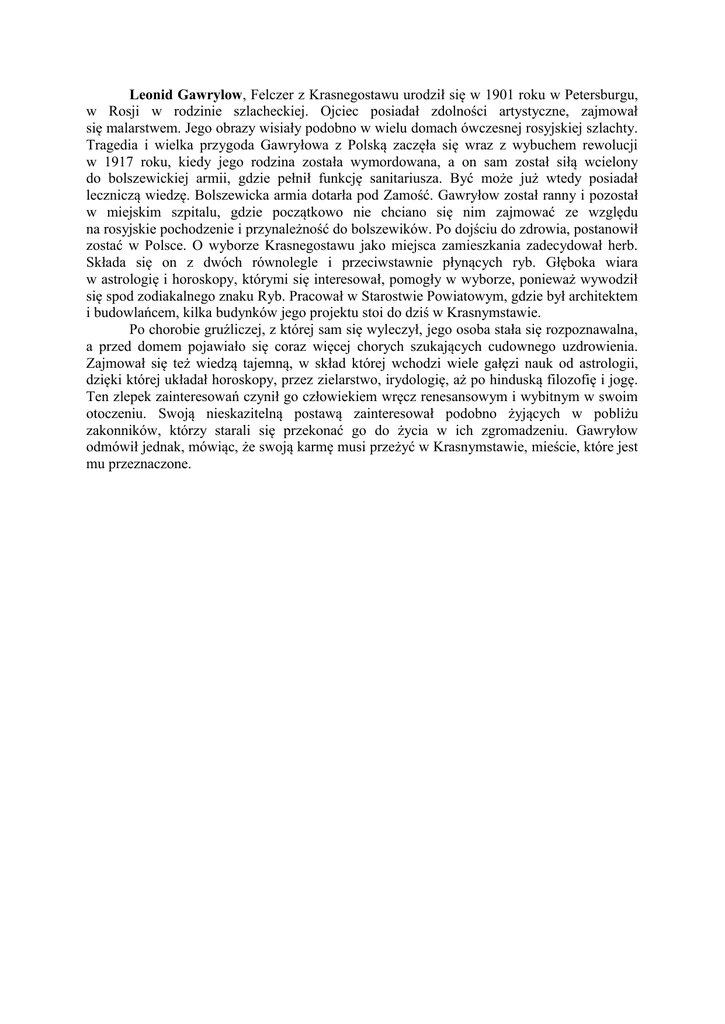 Leonid Gawrylow, Felczer z Krasnegostawu urodził się w 1901 roku w Petersburgu, w Rosji w rodzinie szlacheckiej. Ojciec posiadał zdolności artystyczne, zajmował się malarstwem. Jego obrazy wisiały podobno w wielu domach ówczesnej rosyjskiej szlachty. Tragedia i wielka przygoda Gawryłowa z Polską zaczęła się wraz z wybuchem rewolucji w 1917 roku, kiedy jego rodzina została wymordowana, a on sam został siłą wcielony do bolszewickiej armii, gdzie pełnił funkcję sanitariusza. Być może już wtedy posiadał leczniczą wiedzę. Bolszewicka armia dotarła pod Zamość. Gawryłow został ranny i pozostał w miejskim szpitalu, gdzie początkowo nie chciano się nim zajmować ze względu na rosyjskie pochodzenie i przynależność do bolszewików. Po dojściu do zdrowia, postanowił zostać w Polsce. O wyborze Krasnegostawu jako miejsca zamieszkania zadecydował herb. Składa się on z dwóch równolegle i przeciwstawnie płynących ryb. Głęboka wiara w astrologię i horoskopy, którymi się interesował, pomogły w wyborze, ponieważ wywodził się spod zodiakalnego znaku Ryb. Pracował w Starostwie Powiatowym, gdzie był architektem i budowlańcem, kilka budynków jego projektu stoi do dziś w Krasnymstawie. Po chorobie gruźliczej, z której sam się wyleczył, jego osoba stała się rozpoznawalna, a przed domem pojawiało się coraz więcej chorych szukających cudownego uzdrowienia. Zajmował się też wiedzą tajemną, w skład której wchodzi wiele gałęzi nauk od astrologii, dzięki której układał horoskopy, przez zielarstwo, irydologię, aż po hinduską filozofię i jogę. Ten zlepek zainteresowań czynił go człowiekiem wręcz renesansowym i wybitnym w swoim otoczeniu. Swoją nieskazitelną postawą zainteresował podobno żyjących w pobliżu zakonników, którzy starali się przekonać go do życia w ich zgromadzeniu. Gawryłow odmówił jednak, mówiąc, że swoją karmę musi przeżyć w Krasnymstawie, mieście, które jest mu przeznaczone.